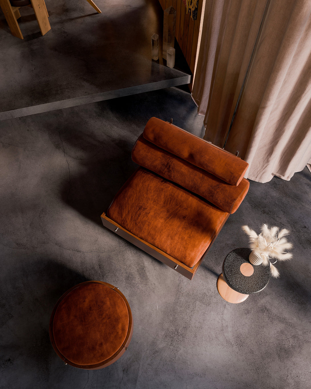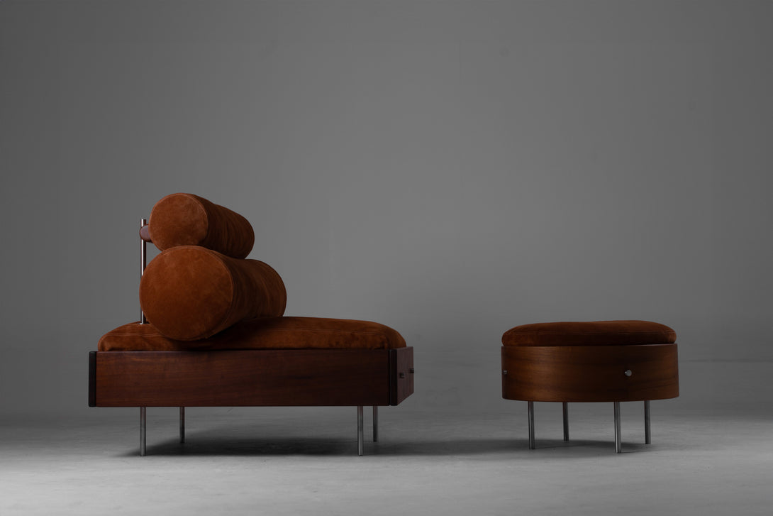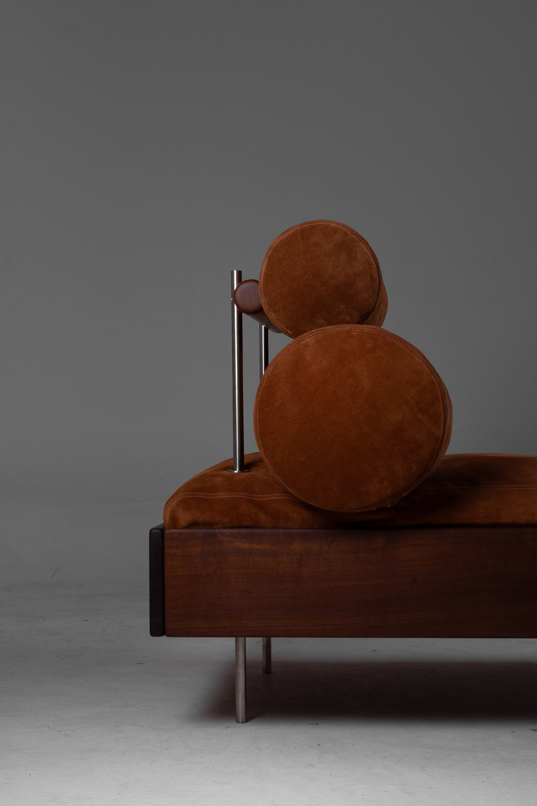 It is made from solid wood. It can be upholstered in fabric, bouclé, or leather. The structure can be made from stainless steel (polished, brushed, rose, or gold) and available in electrostatic paint in black, white, gray, green, and brown.
