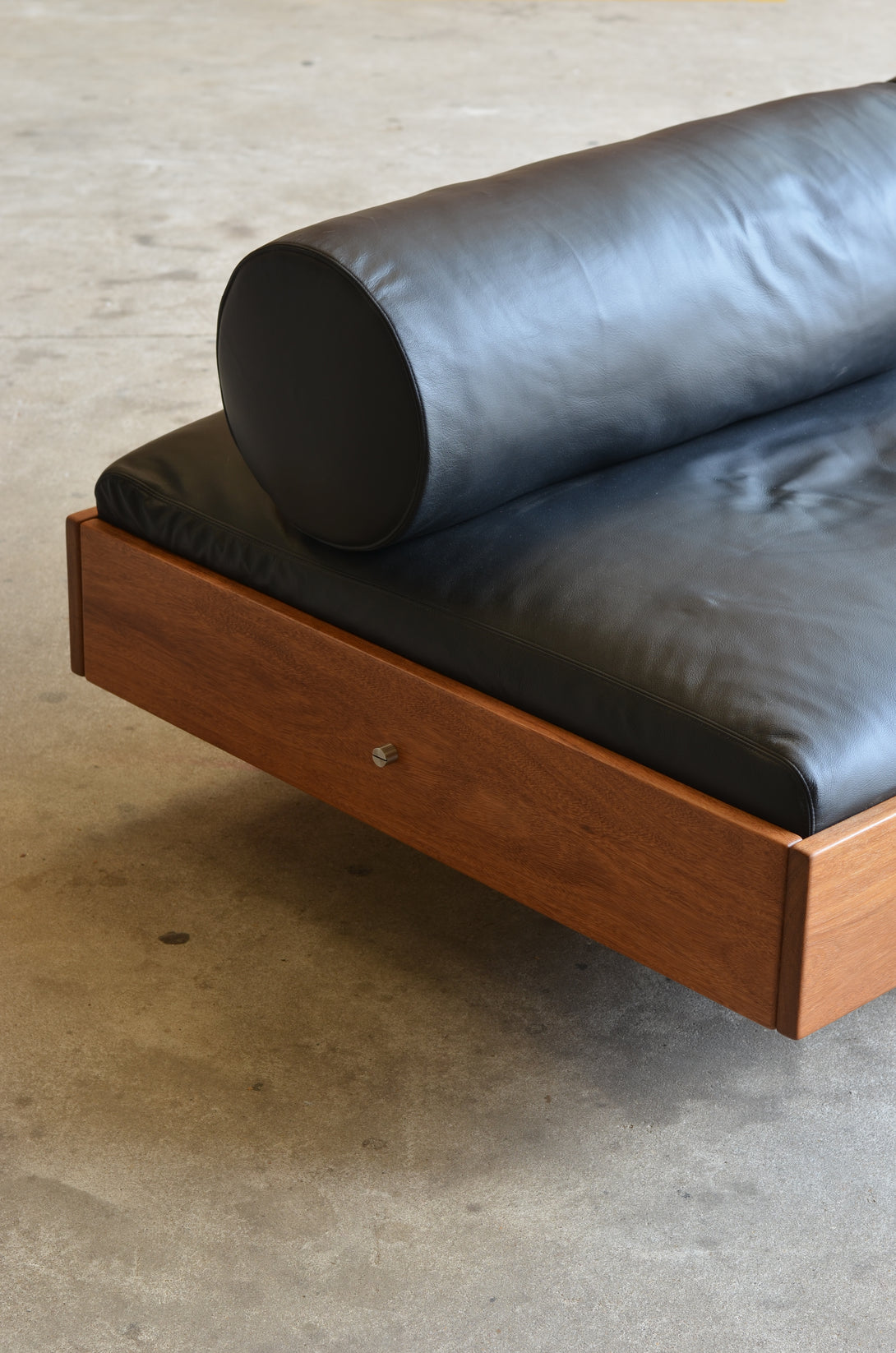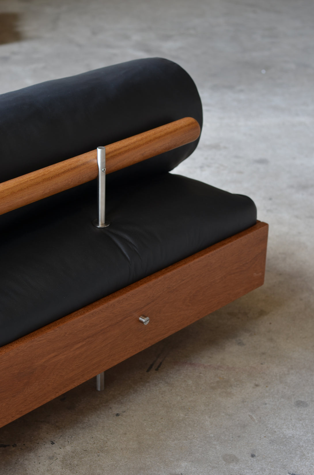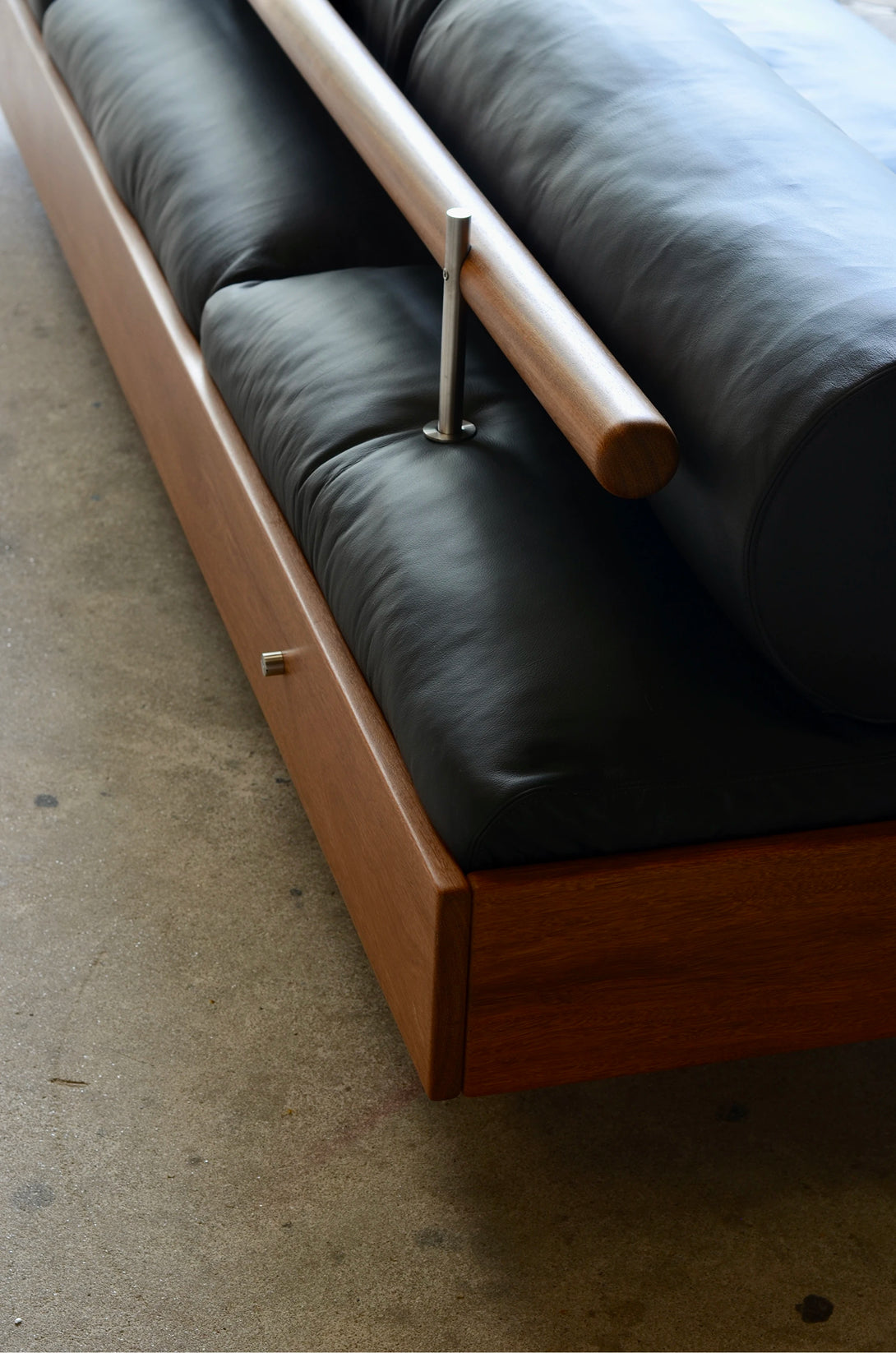 It is entirely manufactured from solid wood. The structure can be made of stainless steel (polished, brushed, rose, or gold) or with electrostatic paint in black, white, gray, green, and brown. It can be upholstered in linen, canvas, or leather. Prices may vary depending on the chosen finishes and dimensions.