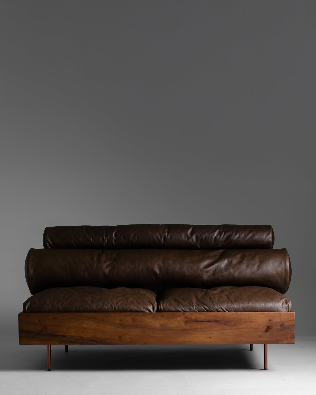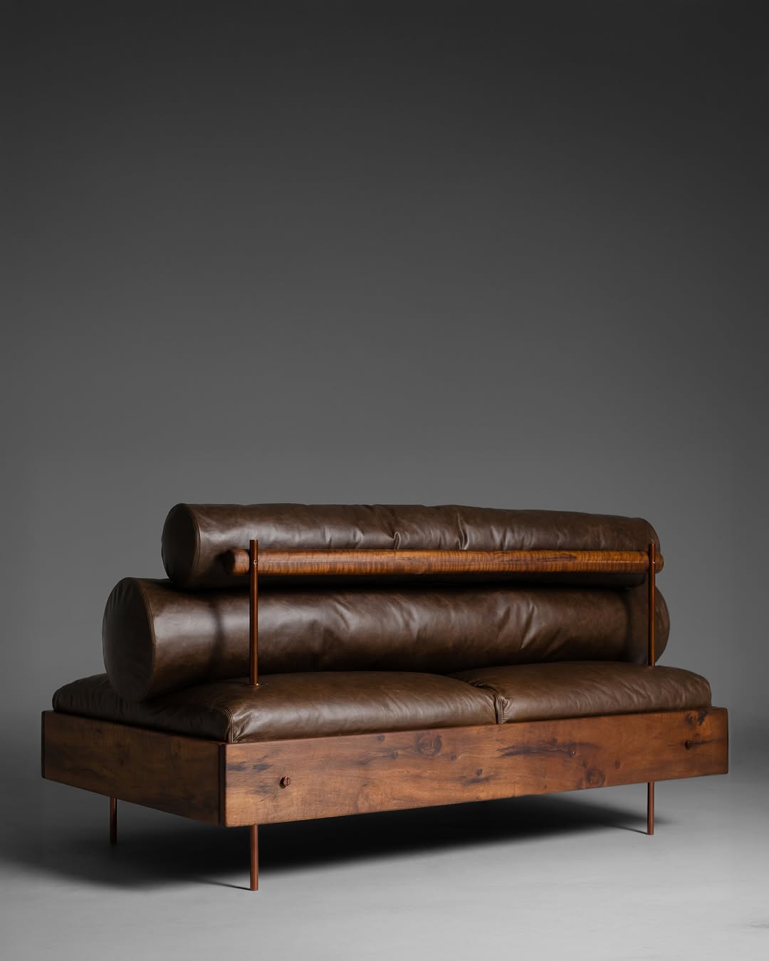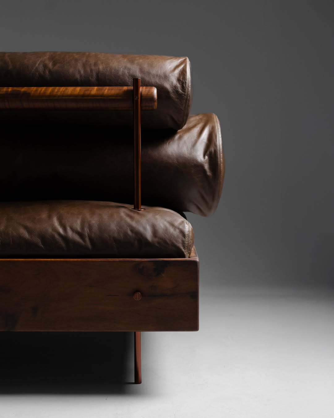 The Bernardo sofa, named in honor of Gustavo’s youngest son, blends comfort and contemplation with dimensions that invite both sitting and reclining. Its minimalist structure contrasts simple forms—such as lines, squares, and cylinders—to create a visually complex and harmonious result. The piece expresses a balance between weight and lightness, using a triad of materials, textures, and shapes to evoke a sense of coziness. This comfort is inspired by the affectionate embrace of his son, reflected in the sofa’s welcoming and expansive aura, always open to new interactions.
