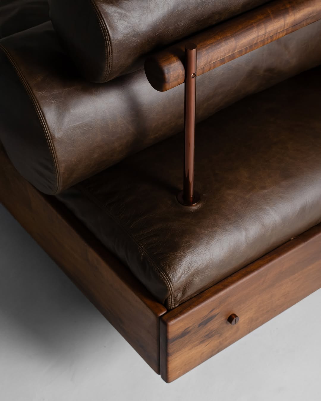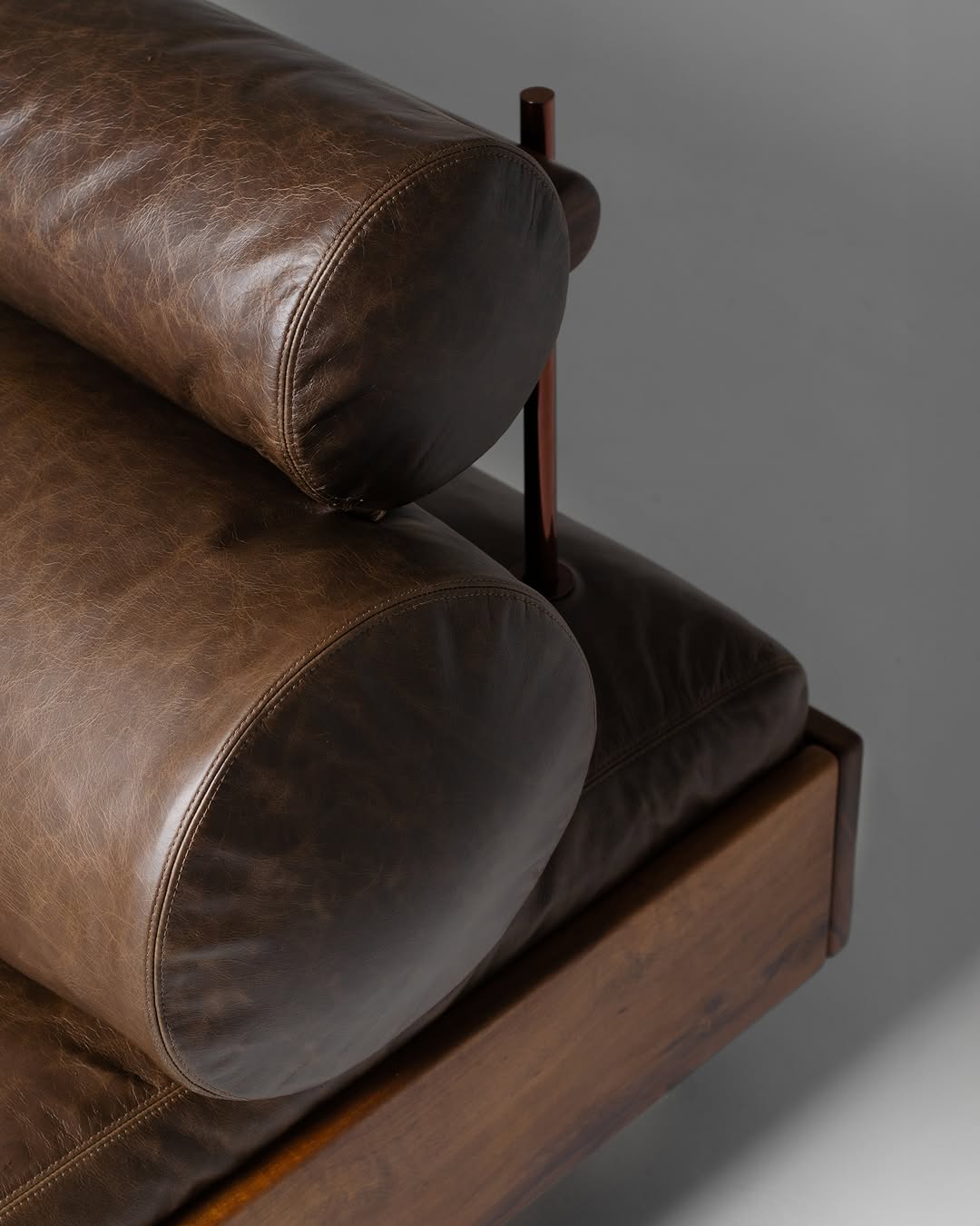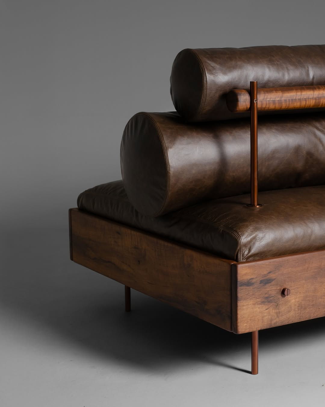The Bernardo sofa, named in honor of Gustavo’s youngest son, blends comfort and contemplation with dimensions that invite both sitting and reclining. Its minimalist structure contrasts simple forms—such as lines, squares, and cylinders—to create a visually complex and harmonious result. The piece expresses a balance between weight and lightness, using a triad of materials, textures, and shapes to evoke a sense of coziness. This comfort is inspired by the affectionate embrace of his son, reflected in the sofa’s welcoming and expansive aura, always open to new interactions.