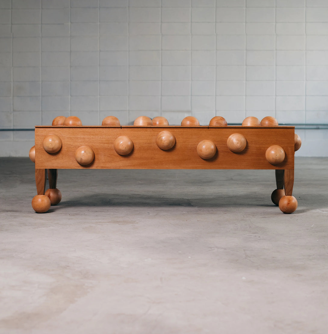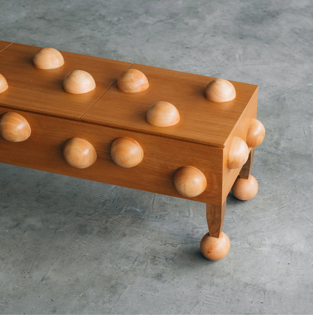 The buffet is elegantly finished with jequitibá wood veneer, giving it a natural and inviting appearance. Its most striking feature is the arrangement of cedar balls, carefully embedded randomly across all its surfaces, creating a tactile and playful texture. Inside, it reveals a sustainable touch, with a recycled PET laminate lining. This design harmonizes sophistication, creativity, and environmental awareness, making it a standout piece in contemporary interiors.