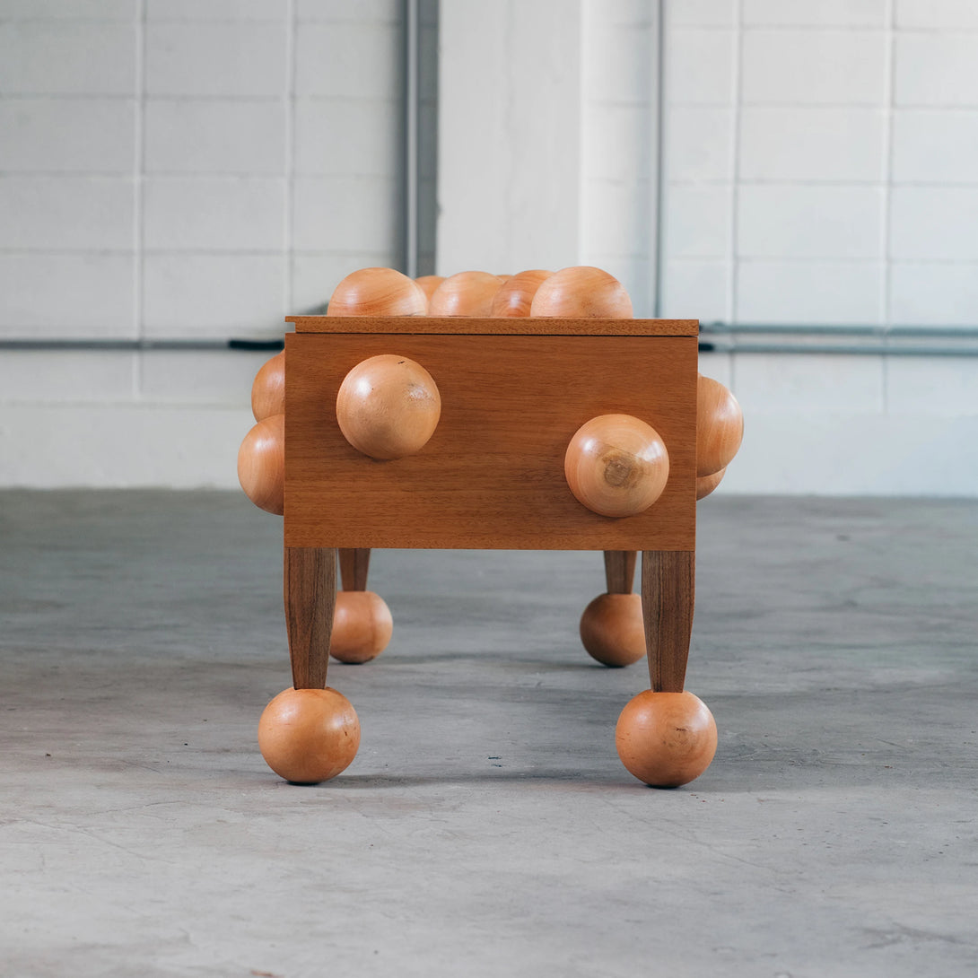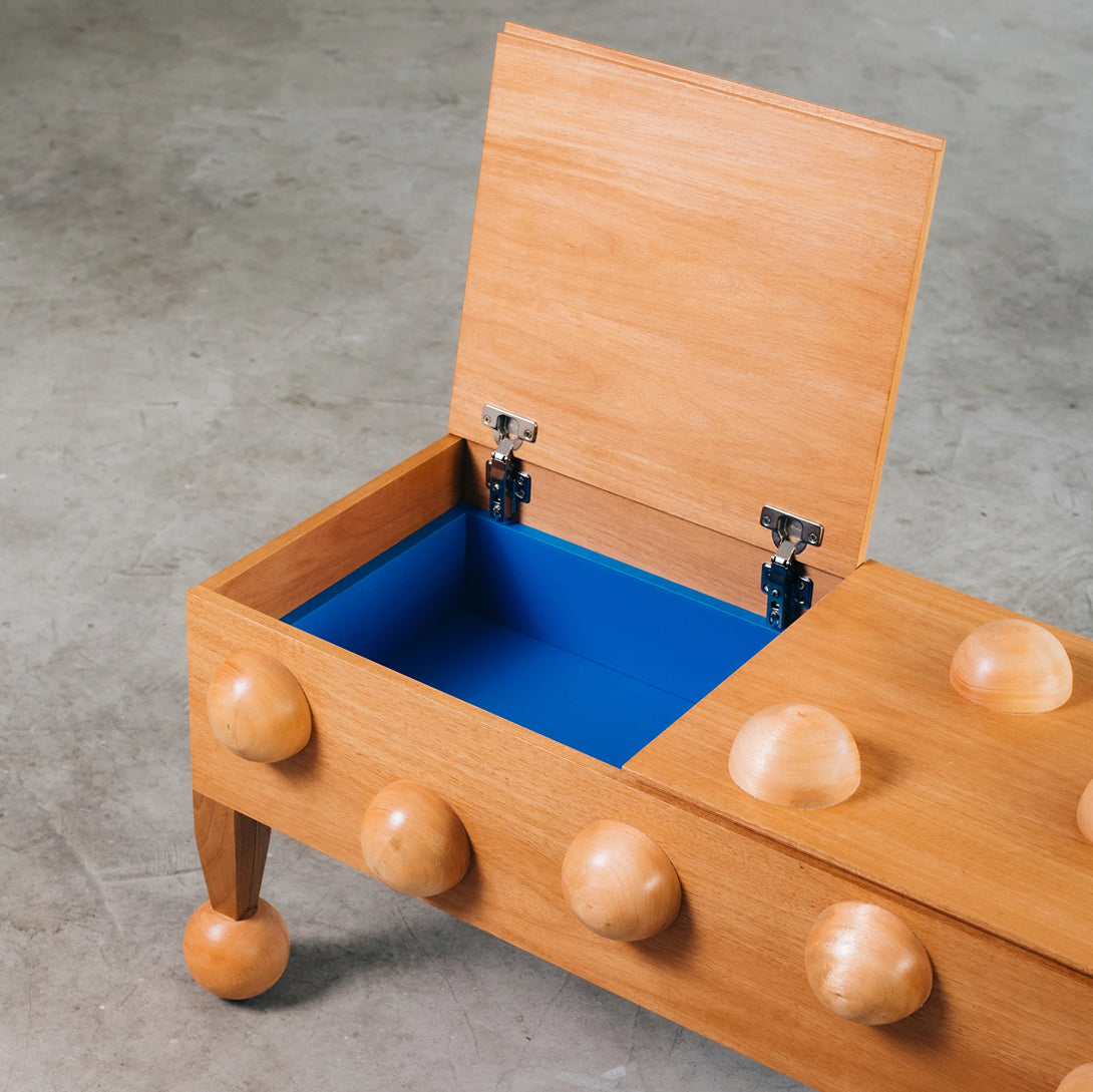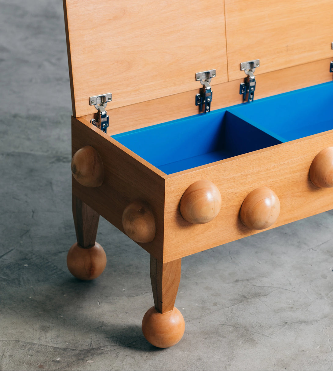 Wood, cedar balls, jequitibá veneer, and recycled PET laminate.