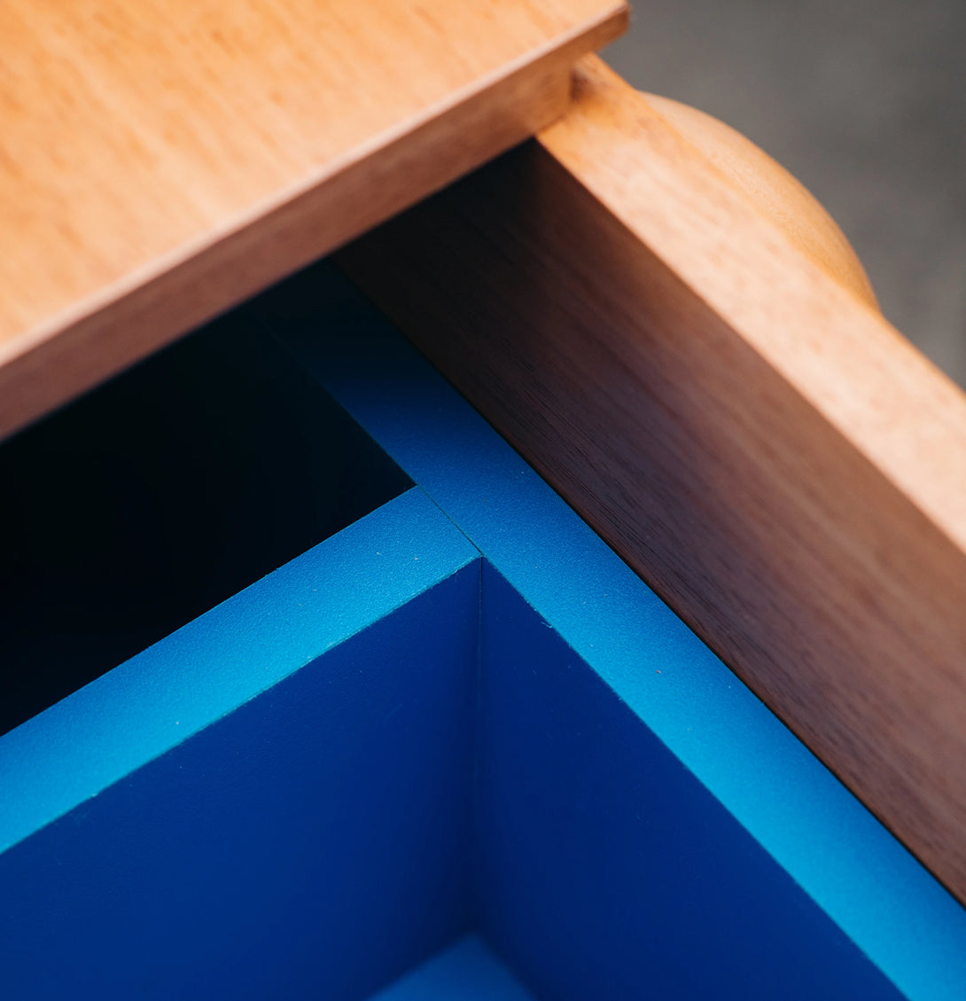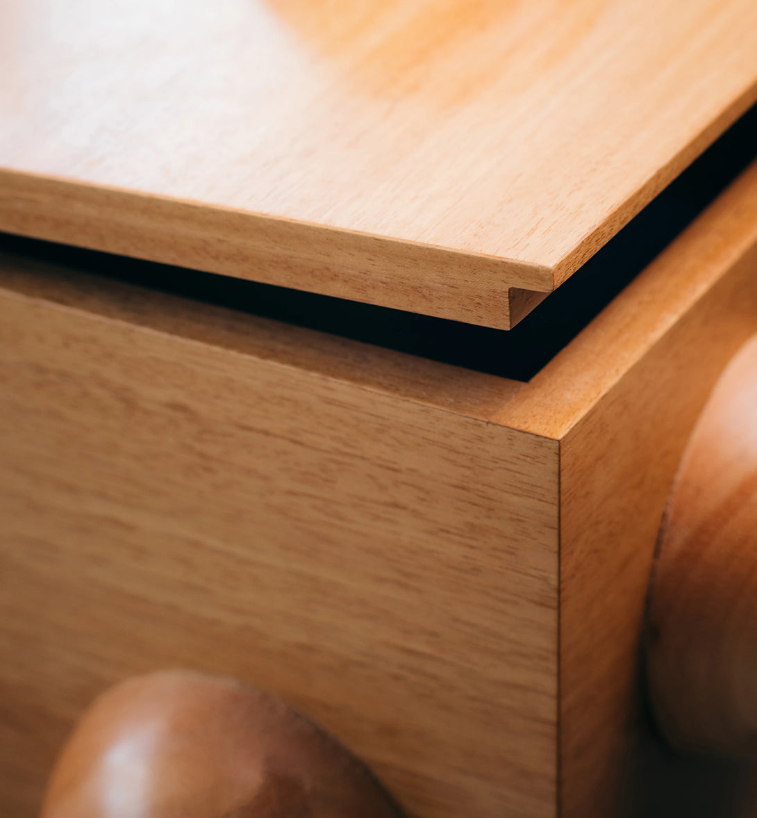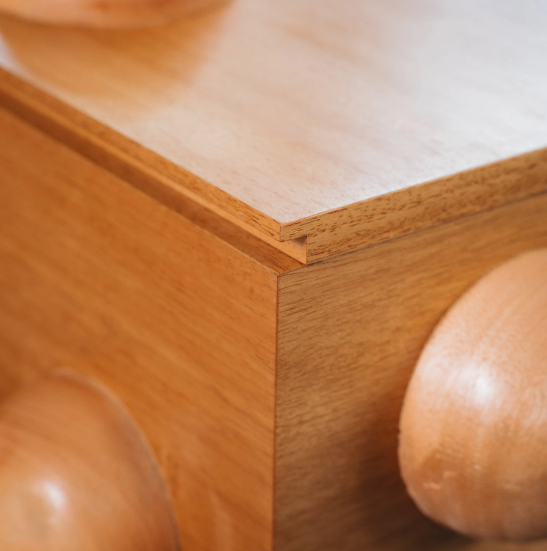 Wood, cedar balls, jequitibá veneer, and recycled PET laminate.