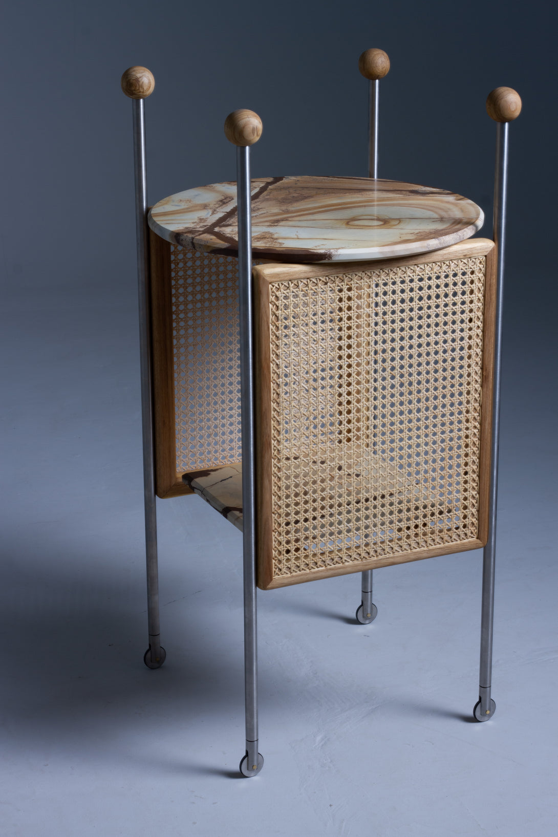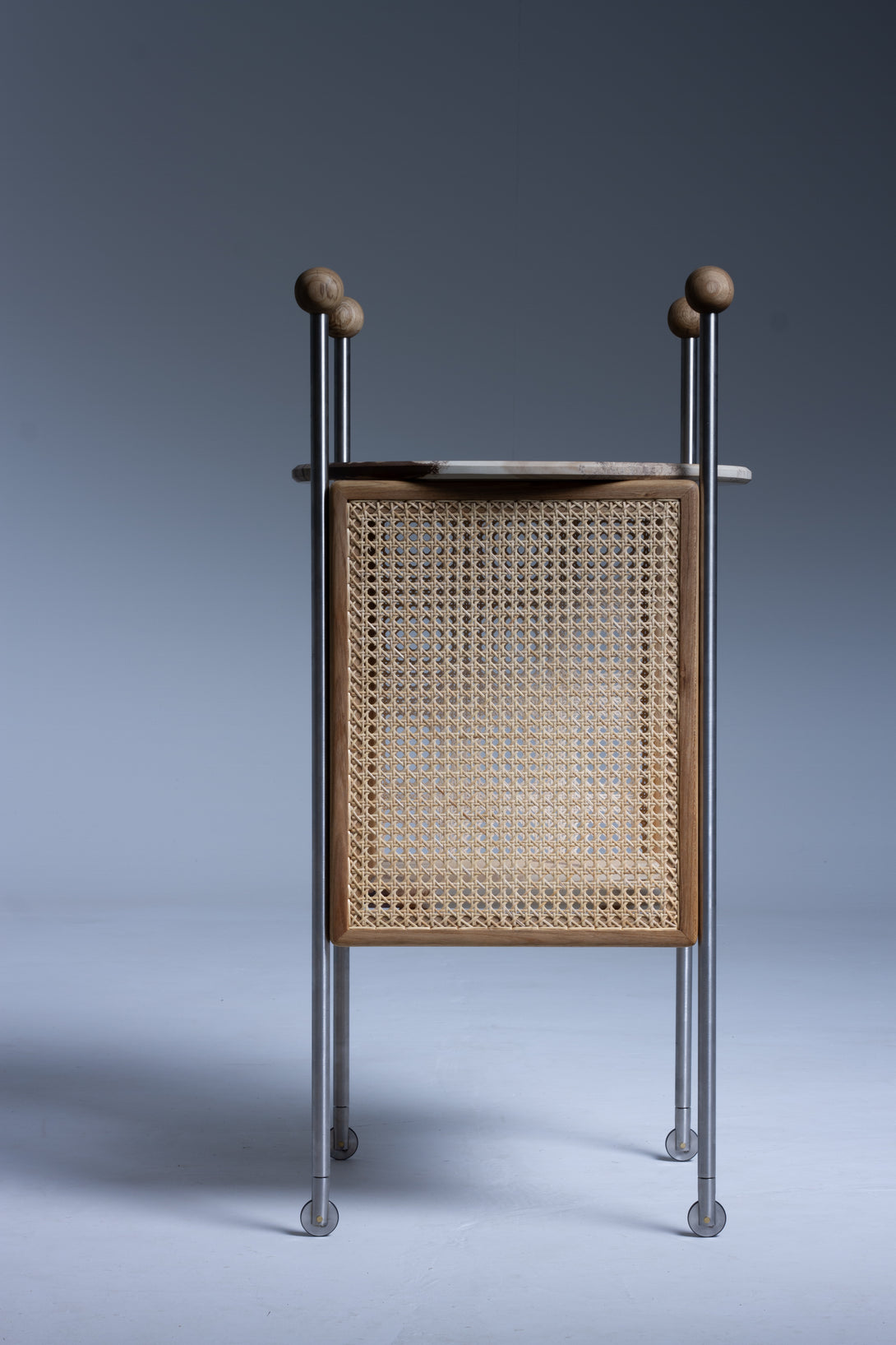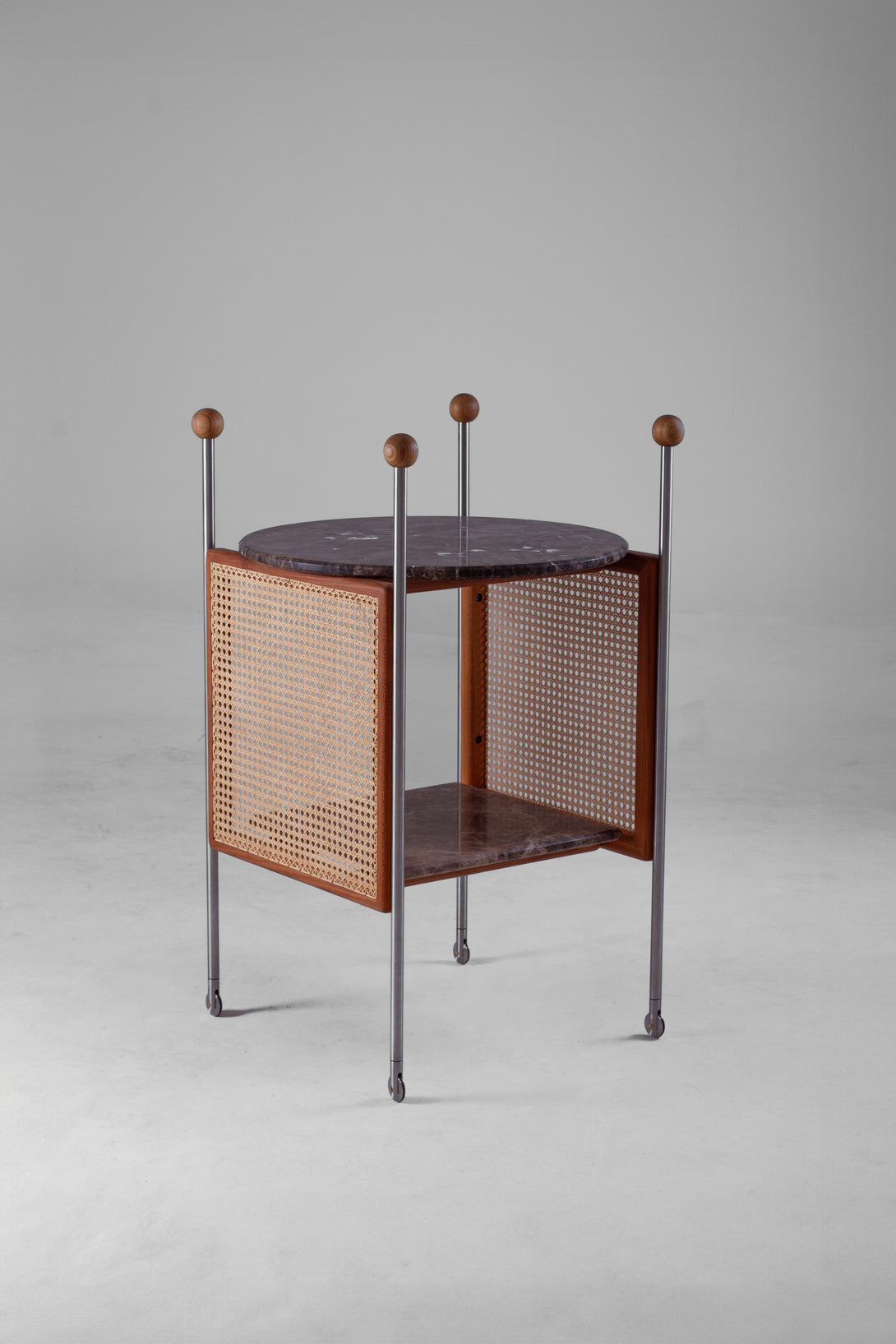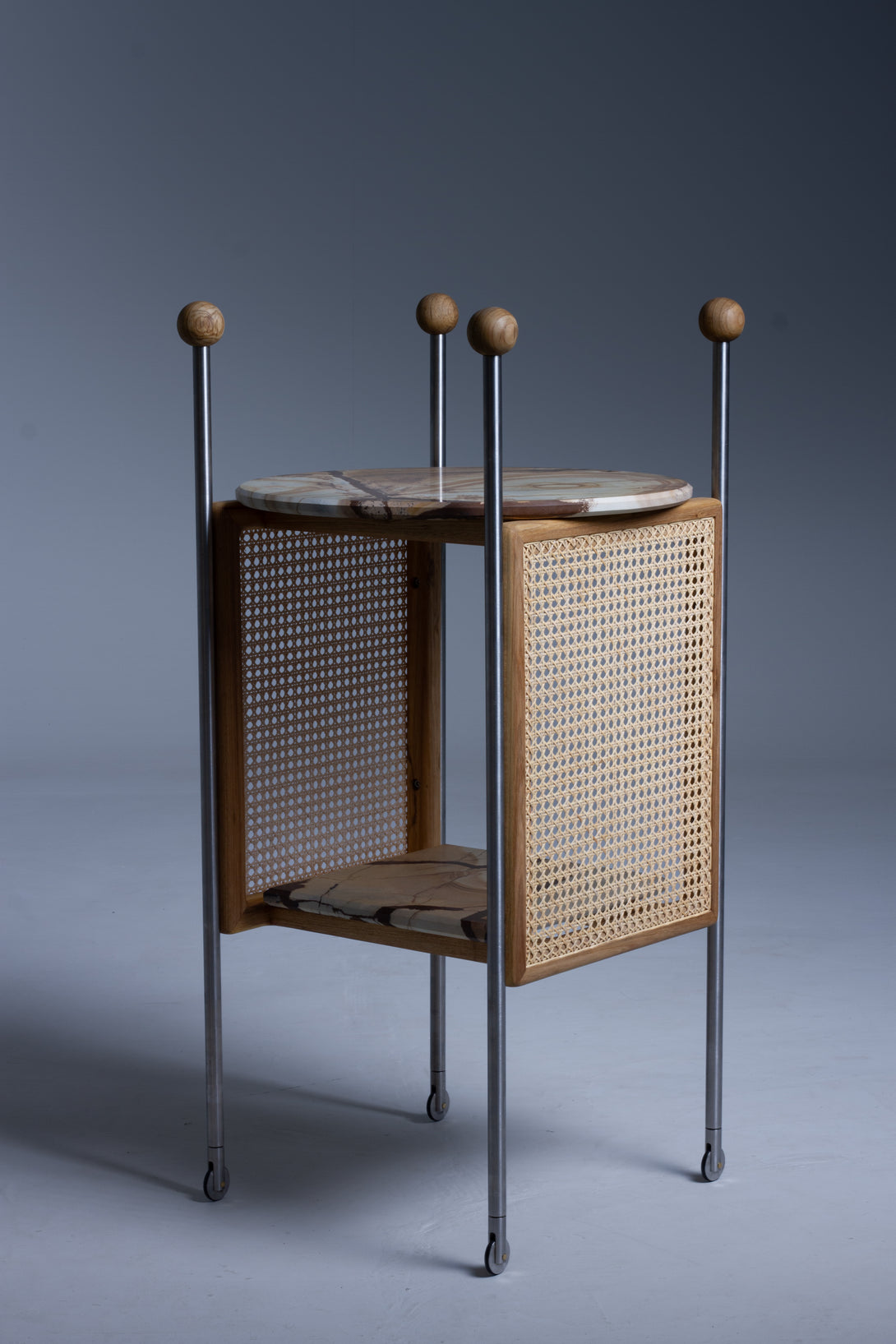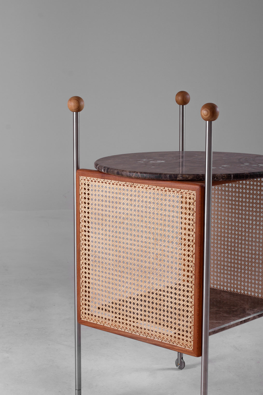 The Bobo bar cart is constructed with a length of 60, a depth of 60, and a height of 100. It is entirely crafted from solid wood. Its structure can be made of stainless steel (polished, brushed, rose, or gold) or painted in black, white, gray, green, and brown. The tops can be crafted from stone, granite, or various types of marble.