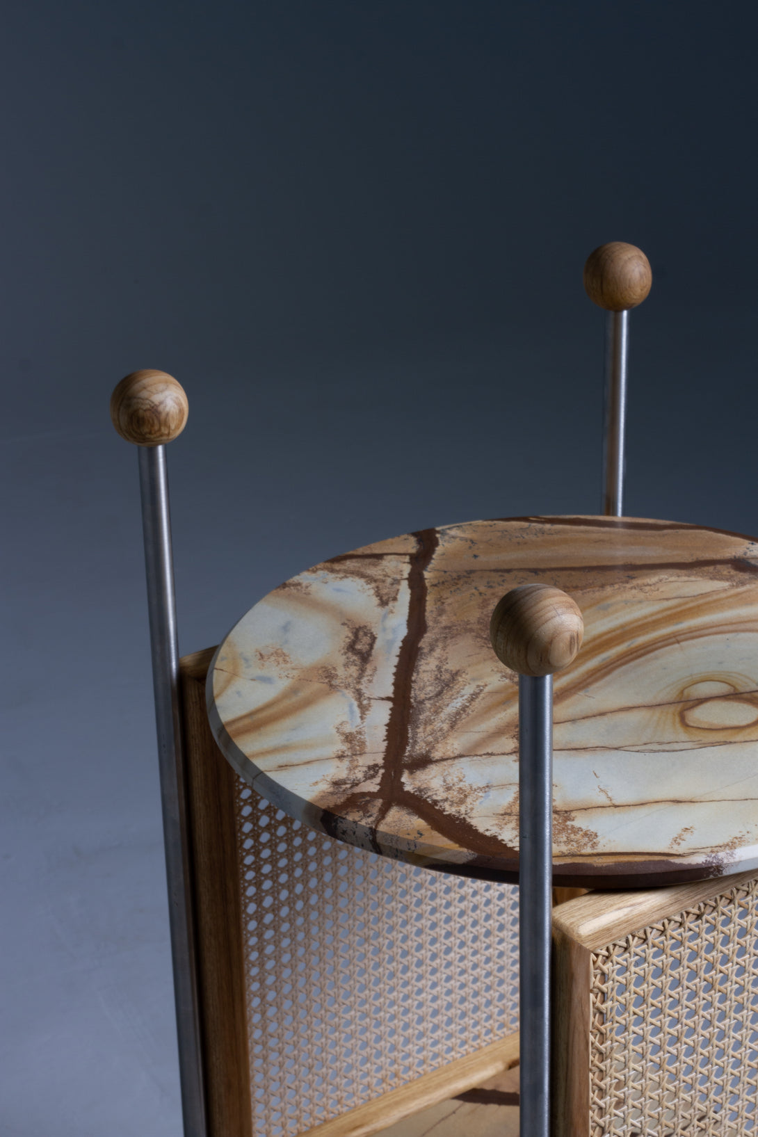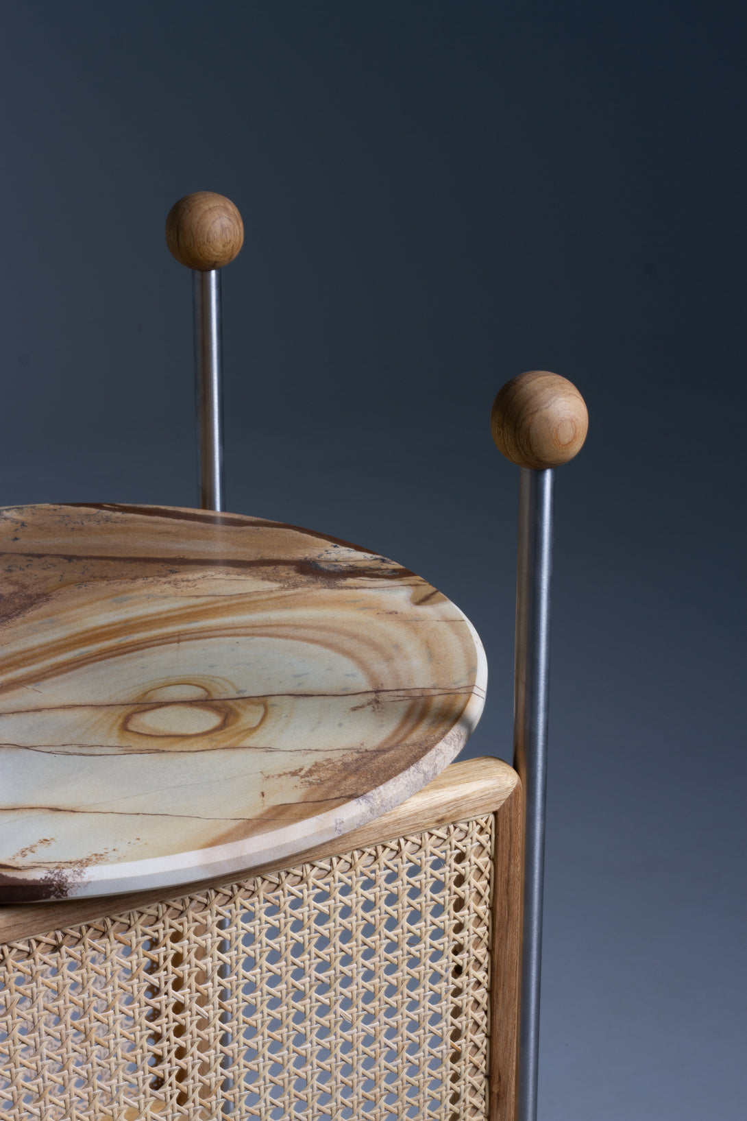 It is entirely crafted from solid wood. Its structure can be made of stainless steel (polished, brushed, rose, or gold) or painted in black, white, gray, green, and brown. The tops can be crafted from stone, granite, or various types of marble.