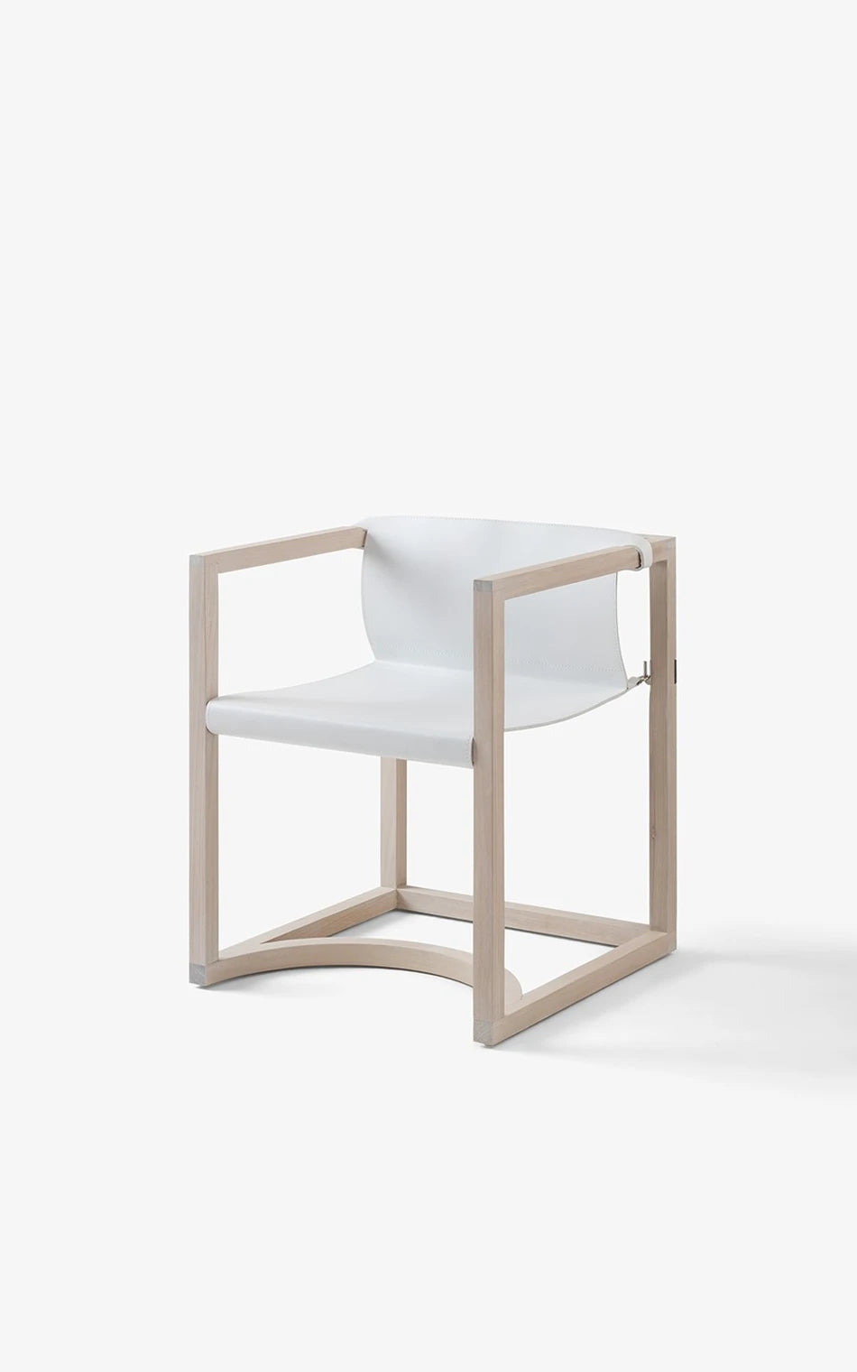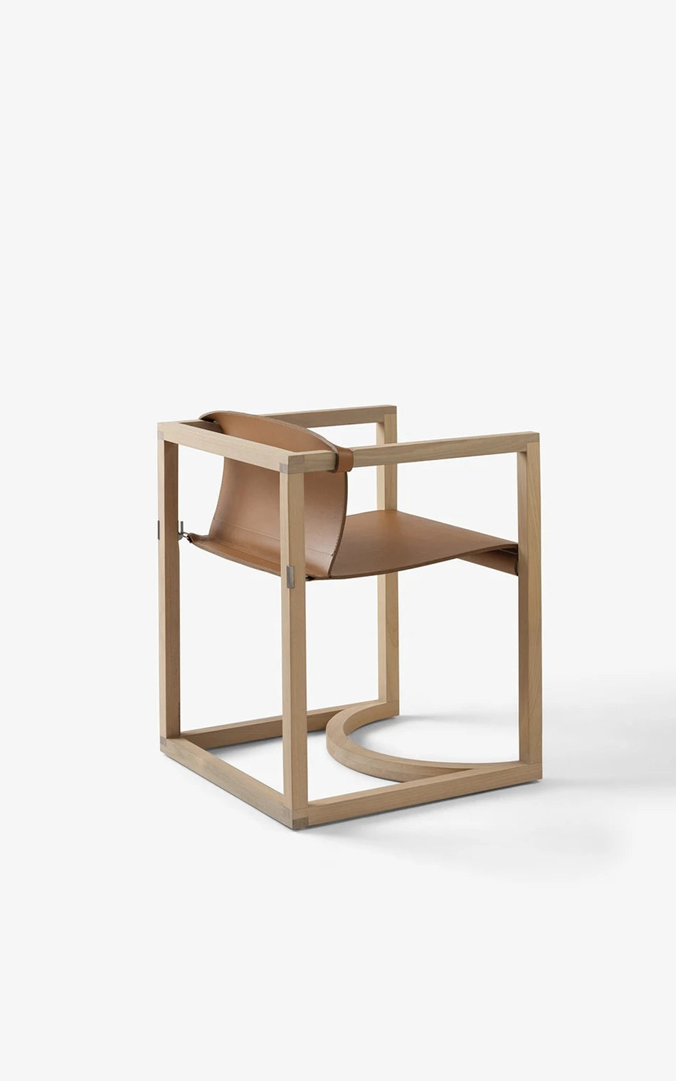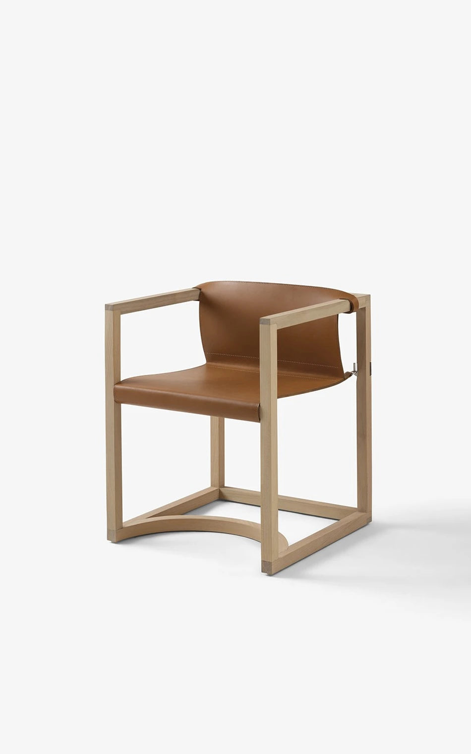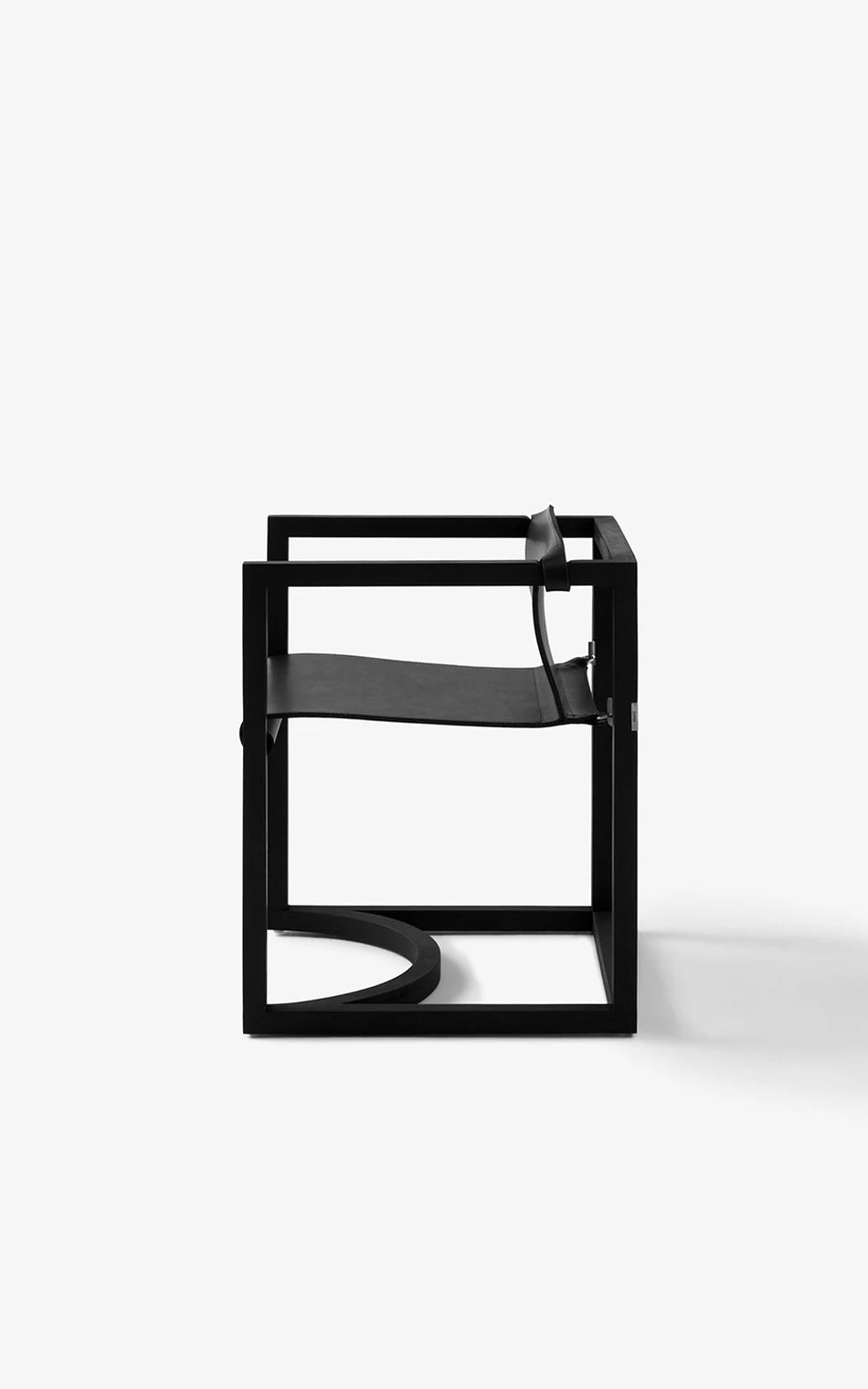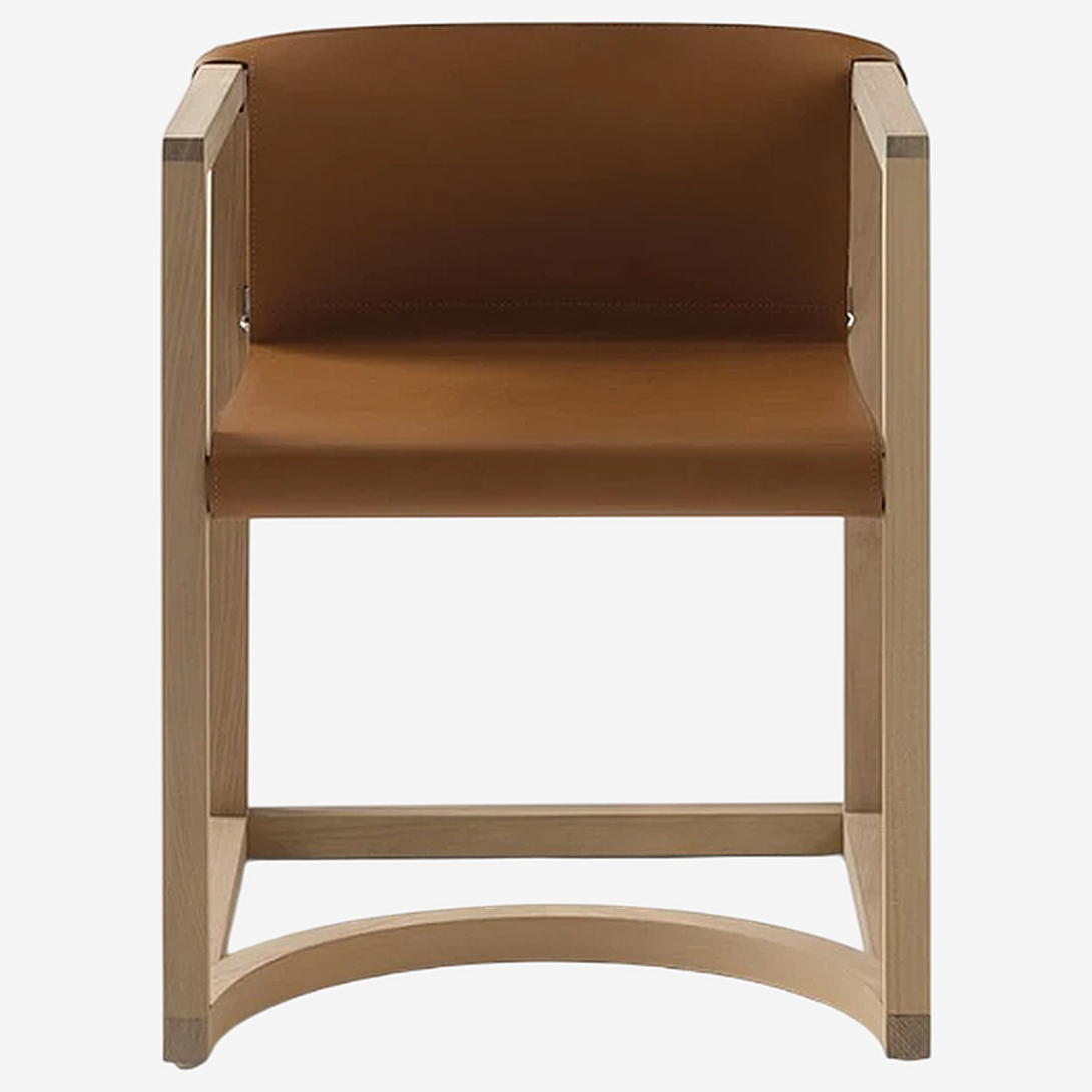 The Capa Chair is a piece that seeks to highlight a simple yet highly detailed geometry. The rigidity of the structure is softened by the suspended leather seat and backrest, attached only at the ends with custom stainless steel fittings that bring subtlety and elegance to the design.