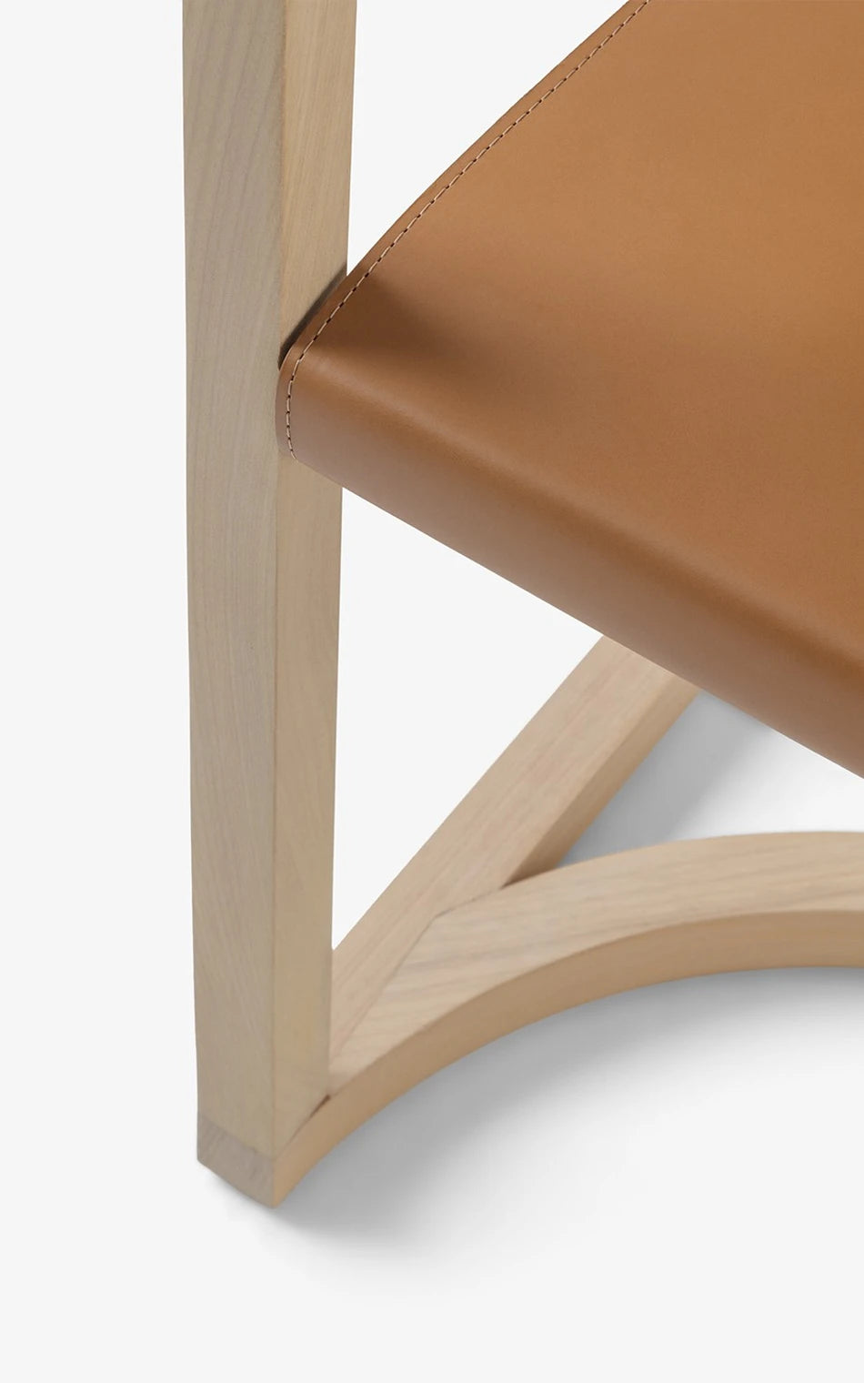 Chair with a solid Tauari wood frame finished with natural oil. Seat and backrest in 100% natural sole leather. Seat attachment details in stainless steel.
