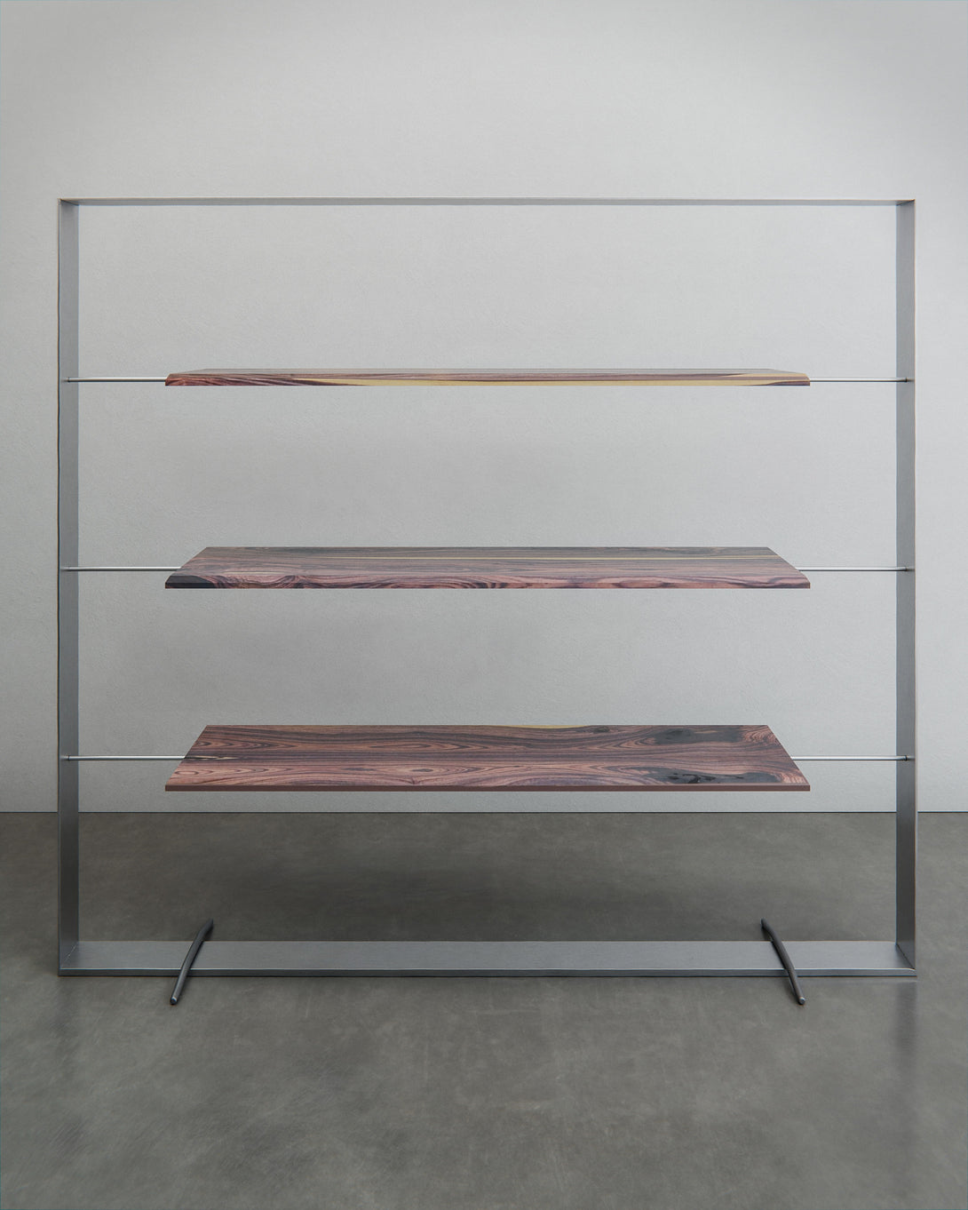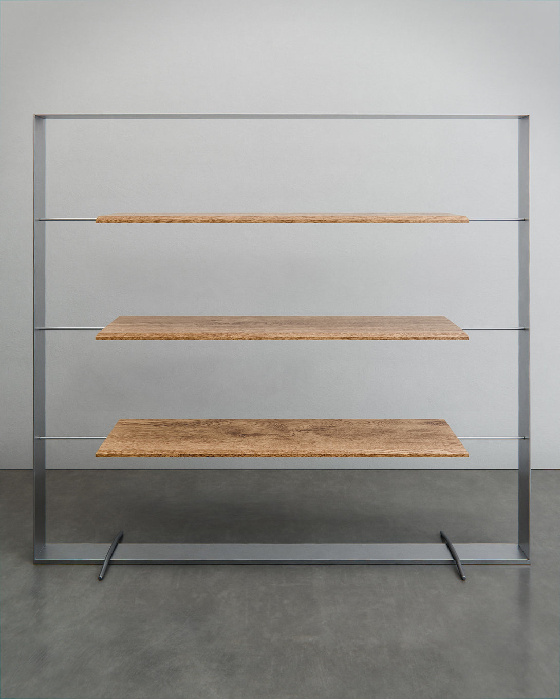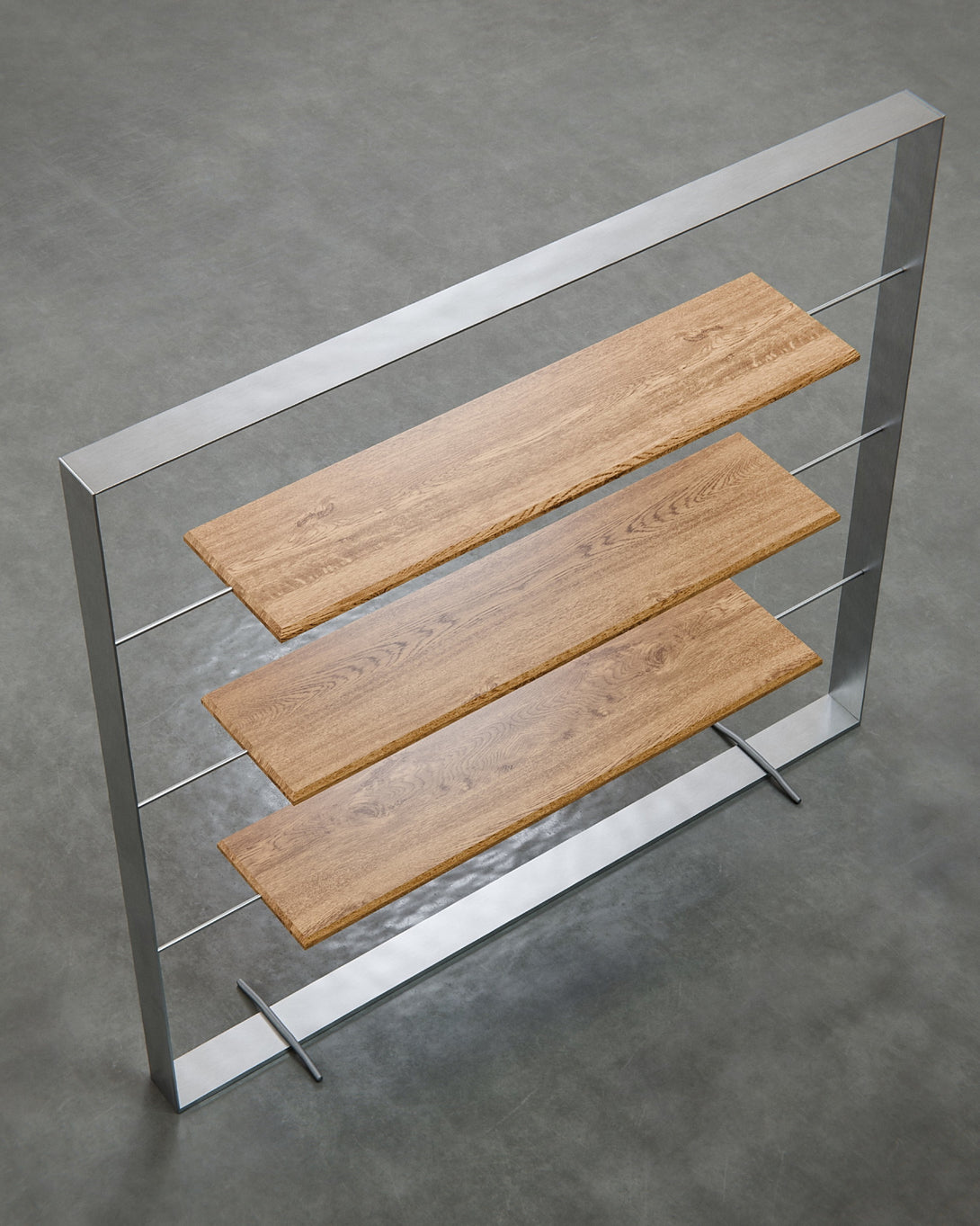 The Cerne shelf is available in various lengths. It is made from solid wood. The structure can be made of stainless steel (polished, brushed, rose, or gold) or painted in black, white, gray, green, and brown. Its prices may vary based on the chosen finishes and lengths.
