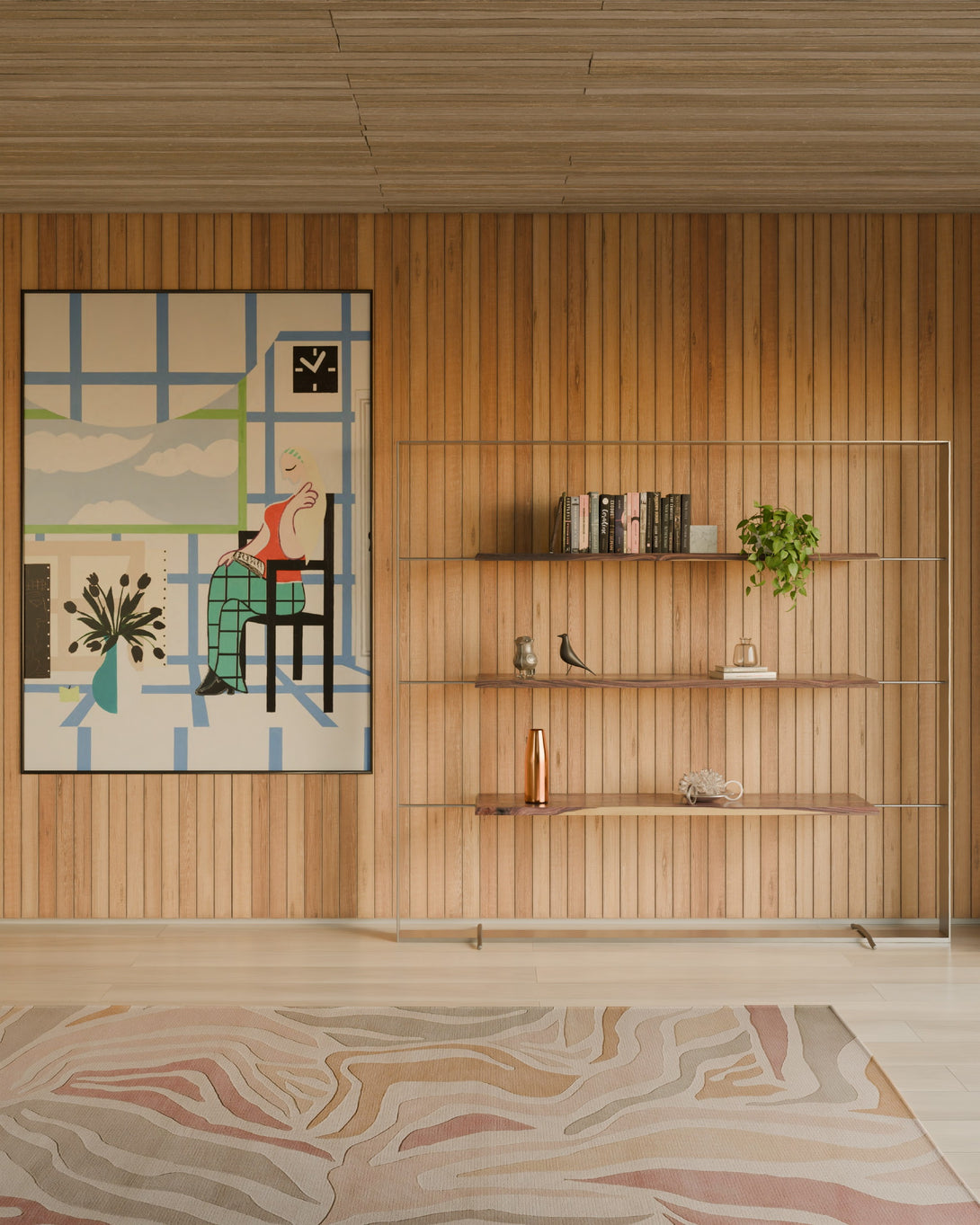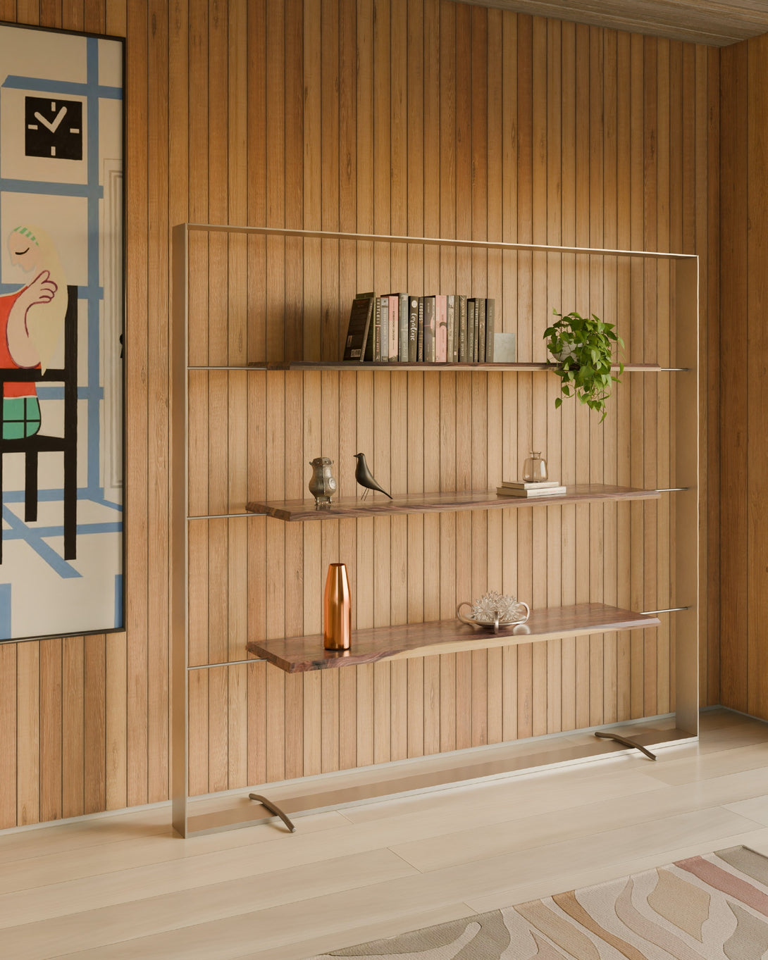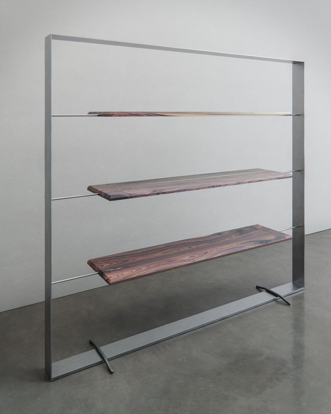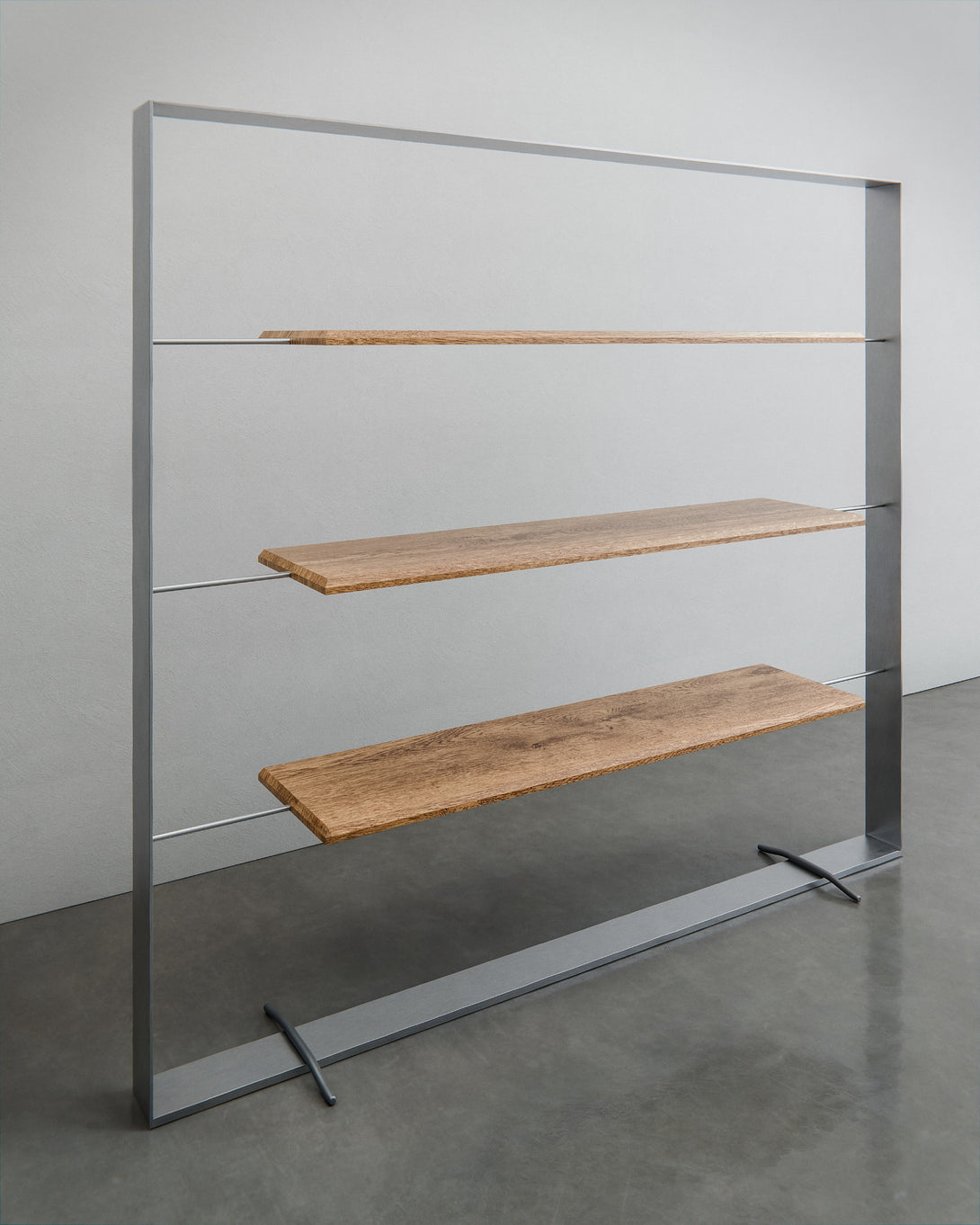 The Cerne shelf is available in various lengths. It is made from solid wood. The structure can be made of stainless steel (polished, brushed, rose, or gold) or painted in black, white, gray, green, and brown. Its prices may vary based on the chosen finishes and lengths.