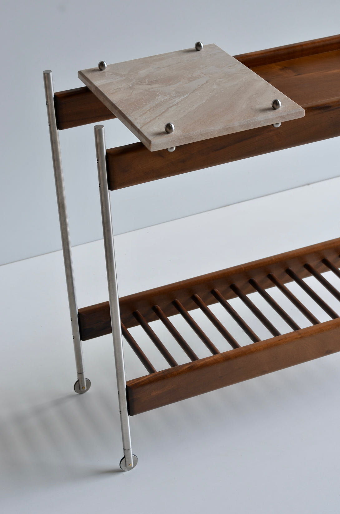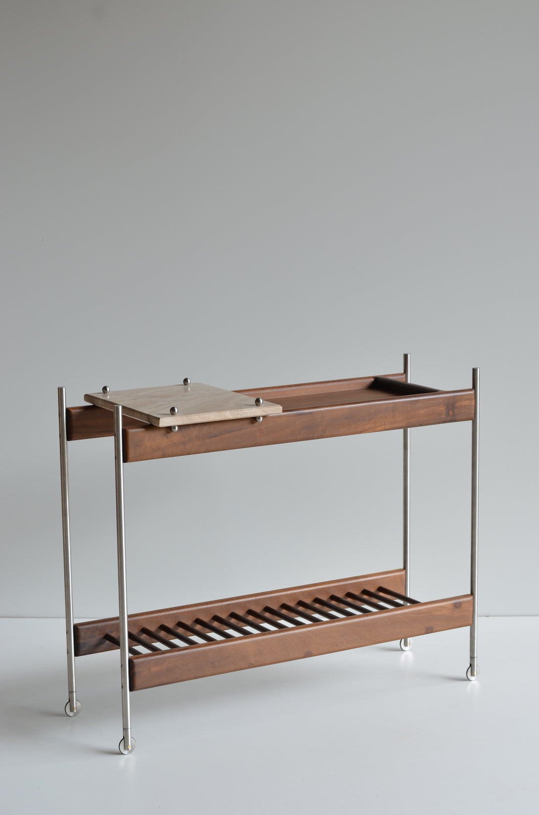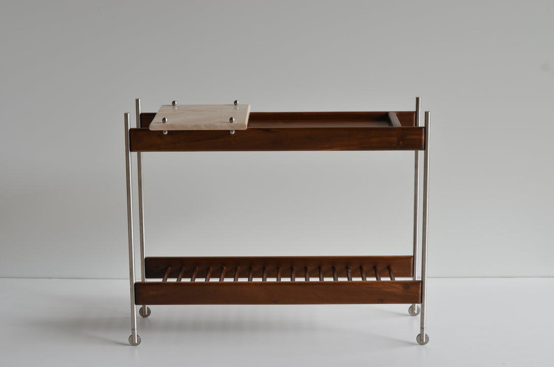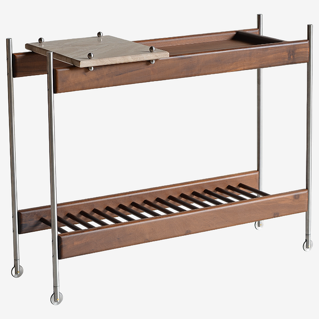 The Estrado bar cart is crafted with a length of 100 cm, a depth of 40 cm, and a height of 80 cm. It is entirely made from solid woods. Its structure can be constructed from stainless steel (polished, brushed, rose, or gold) or painted in black, white, gray, green, and brown. The tray can be crafted from stone, granite, marble, or glass. Prices may vary according to the chosen finishes and dimensions.