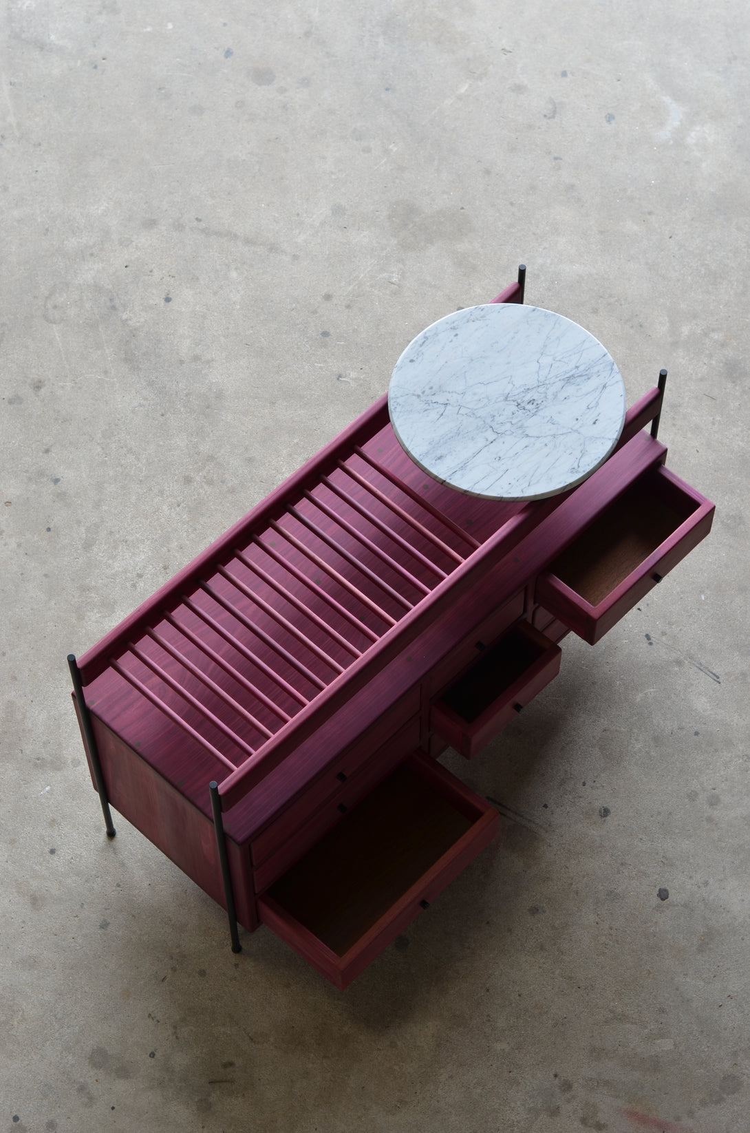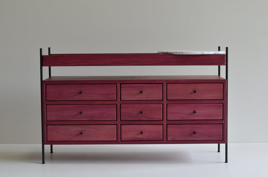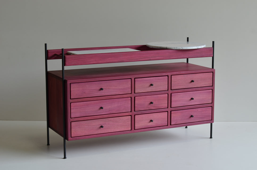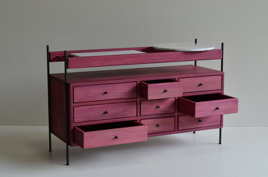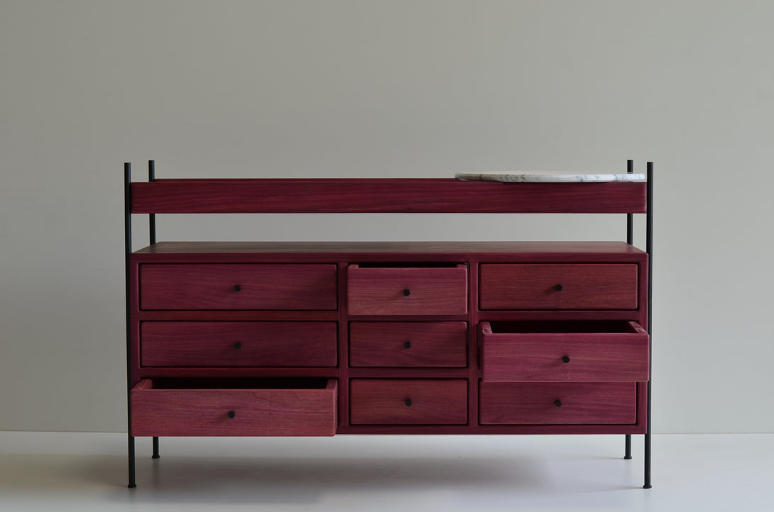 The Estrado dresser is made with lengths ranging from 60 to 360 cm, depths from 42 to 50 cm, and heights between 60 and 80 cm. It is entirely manufactured from solid woods. The structure can be made of stainless steel (polished, brushed, rose, or gold) or painted in black, white, gray, green, and brown. Its prices may vary according to the chosen finishes and lengths.