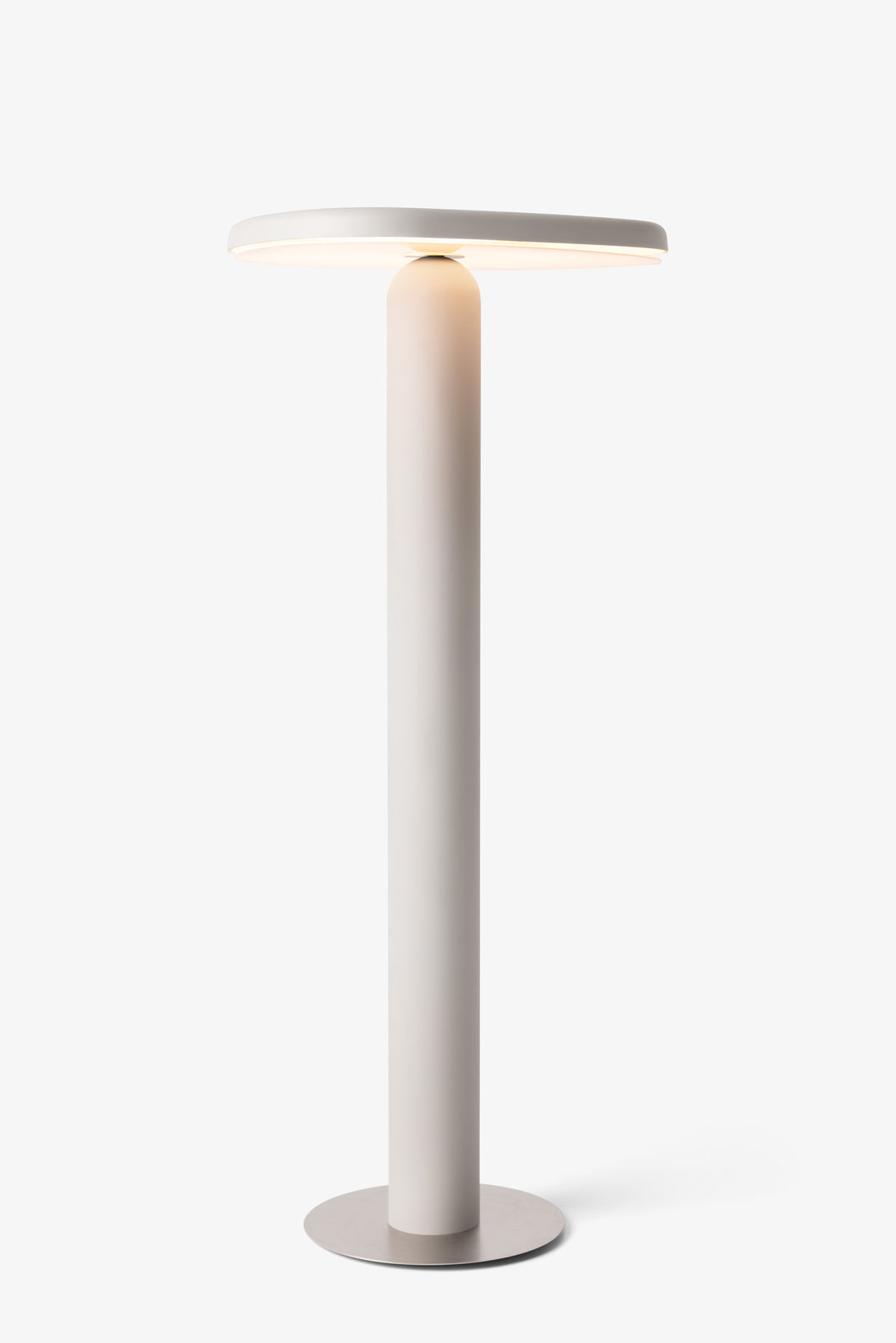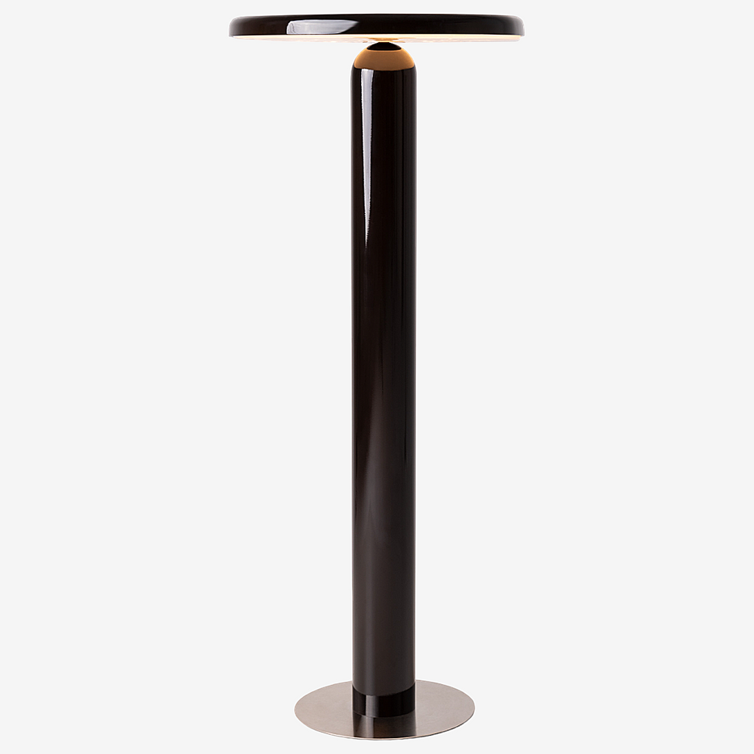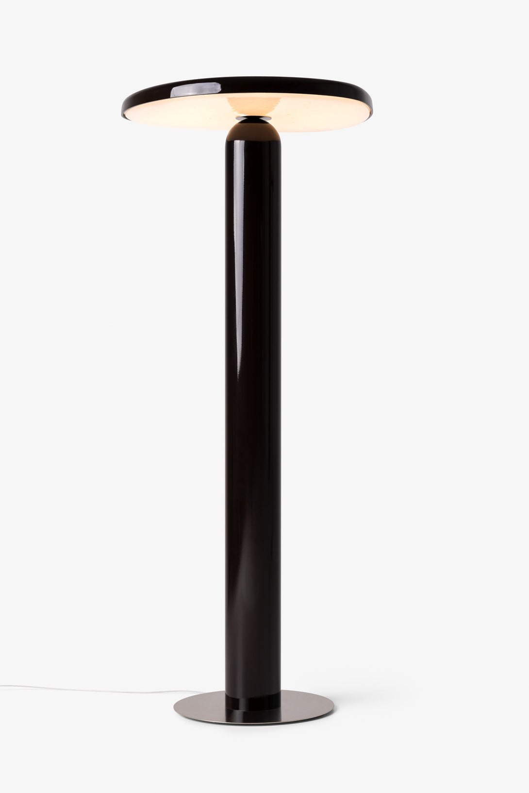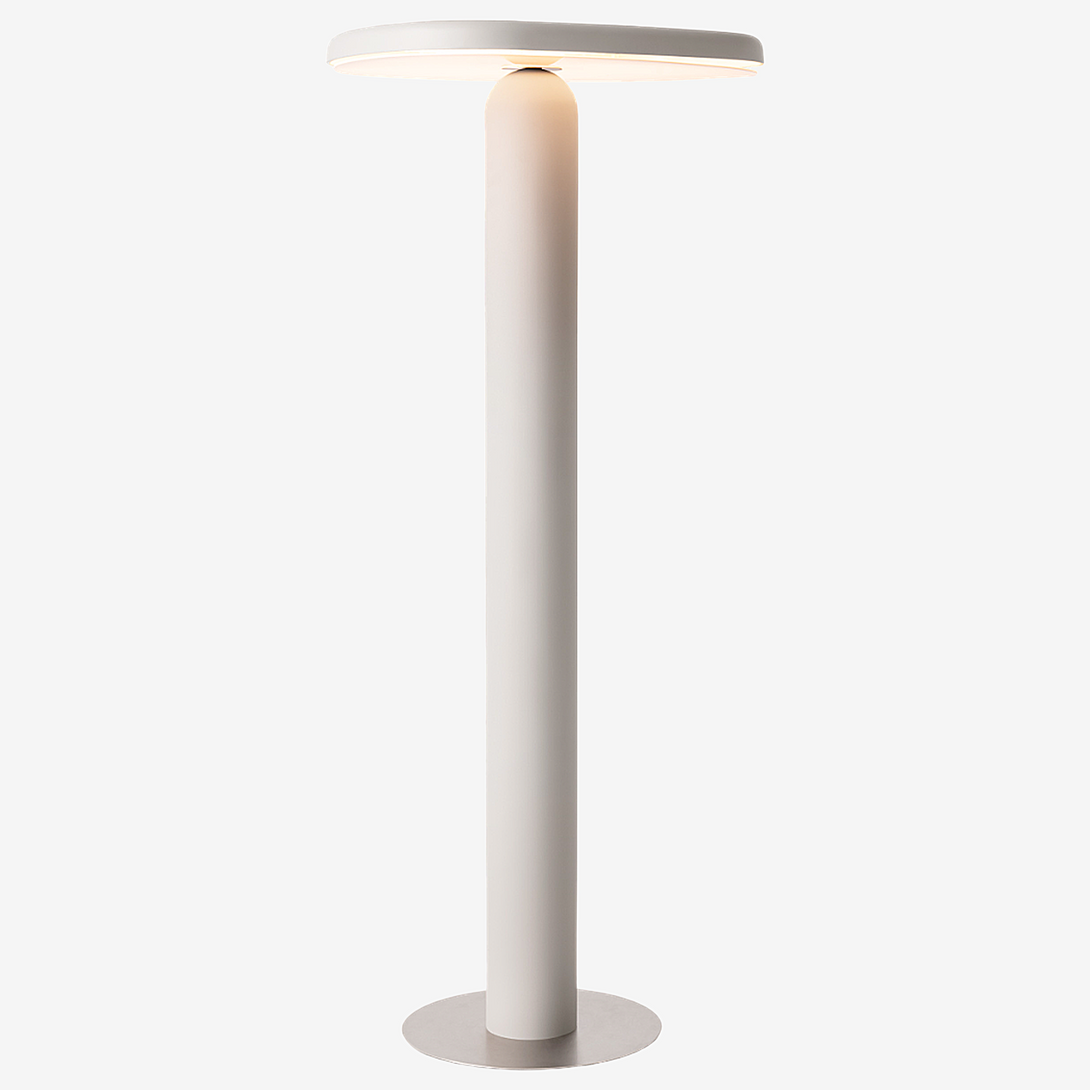 Floor lamp offering diffused light. The body is crafted from aluminum with a matte liquid paint finish and soft-touch varnish available in Off White, Off Black, and Cement versions, or a high gloss varnish for the Café version. It features a clear glass diffuser made through an artisanal casting process and includes a built-in LED.