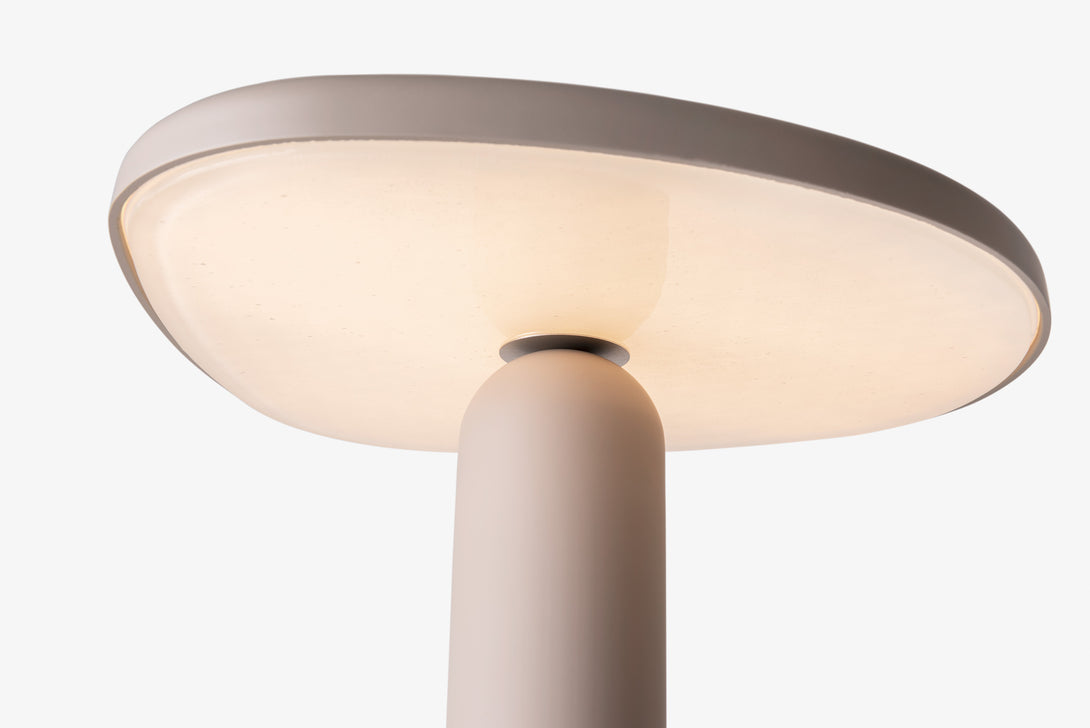 The Fungi #2 Floor Lamp. This piece features a thick and sturdy structure supporting a large dome. This lighting arrangement creates a diffused glow, enhancing the charm of the expansive glass component. The carefully crafted proportions of the Fungi #2 transform it into a striking sculptural statement, perfect for those with a discerning eye for sophisticated design.
