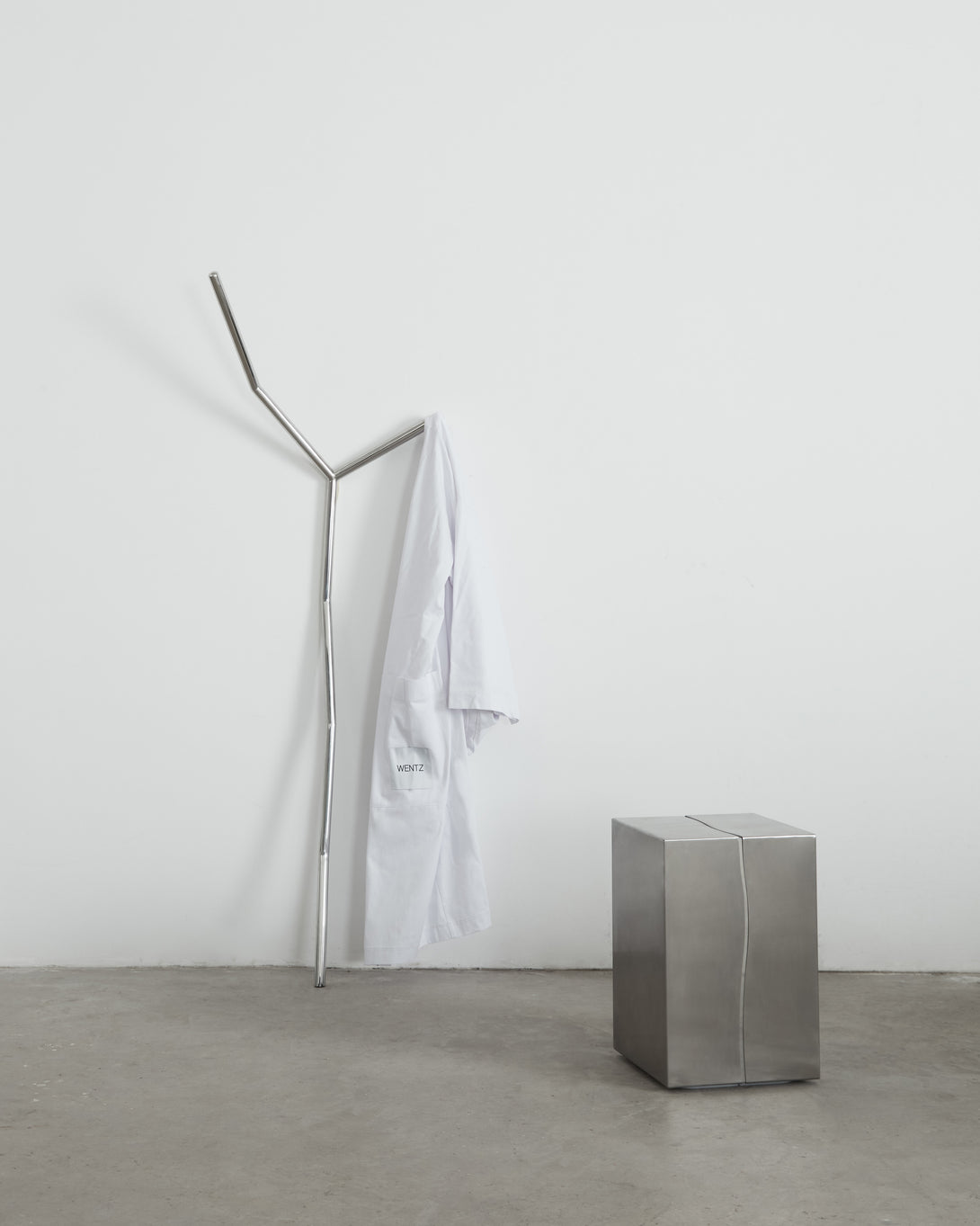 Polished stainless steel coat rack. The piece is wall-mounted and supported on the floor to bear the weights applied to the rack. Wall support made of machined aluminum.