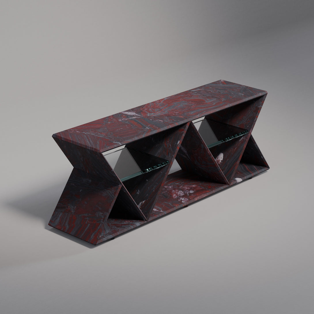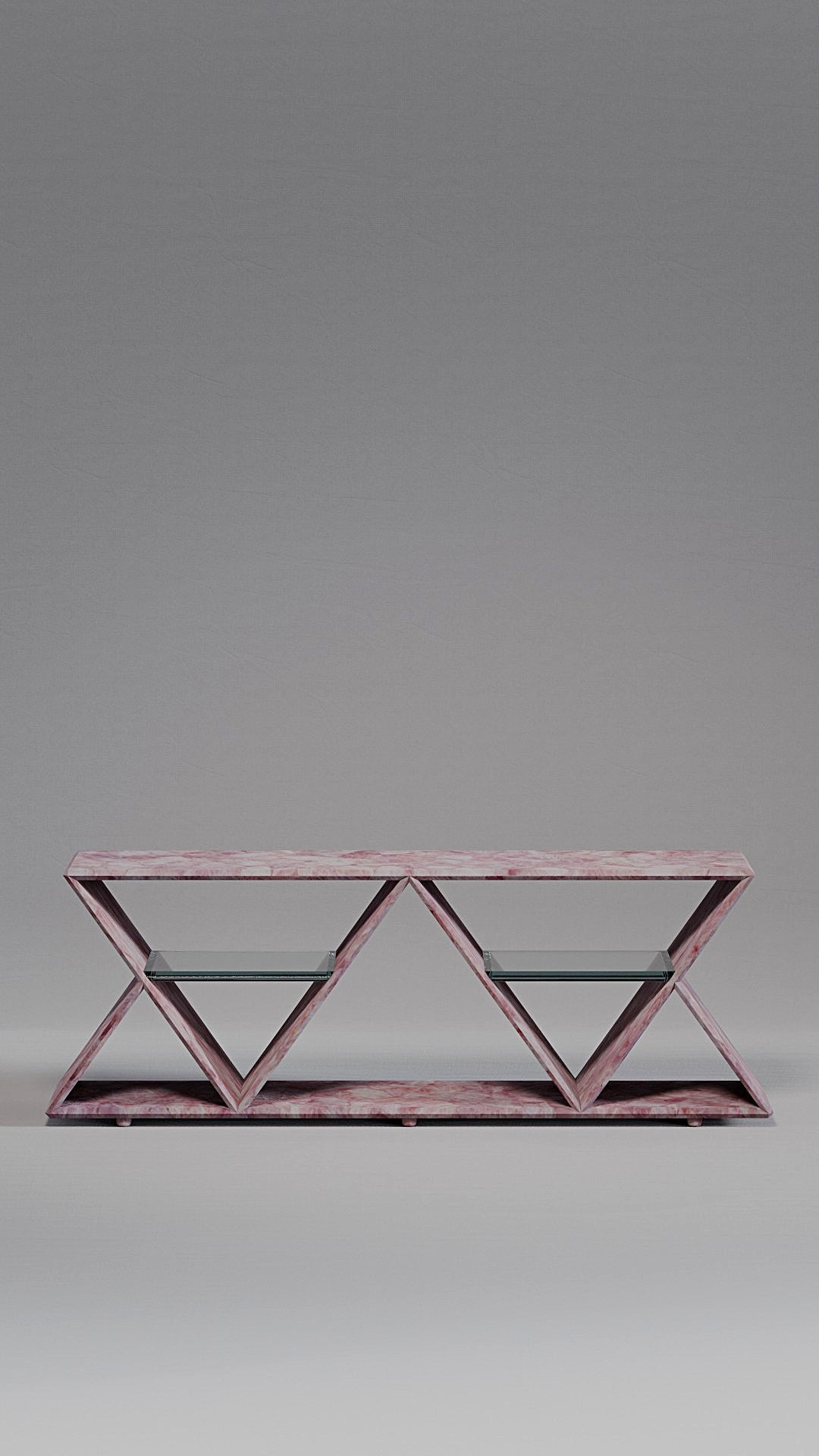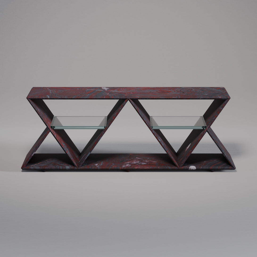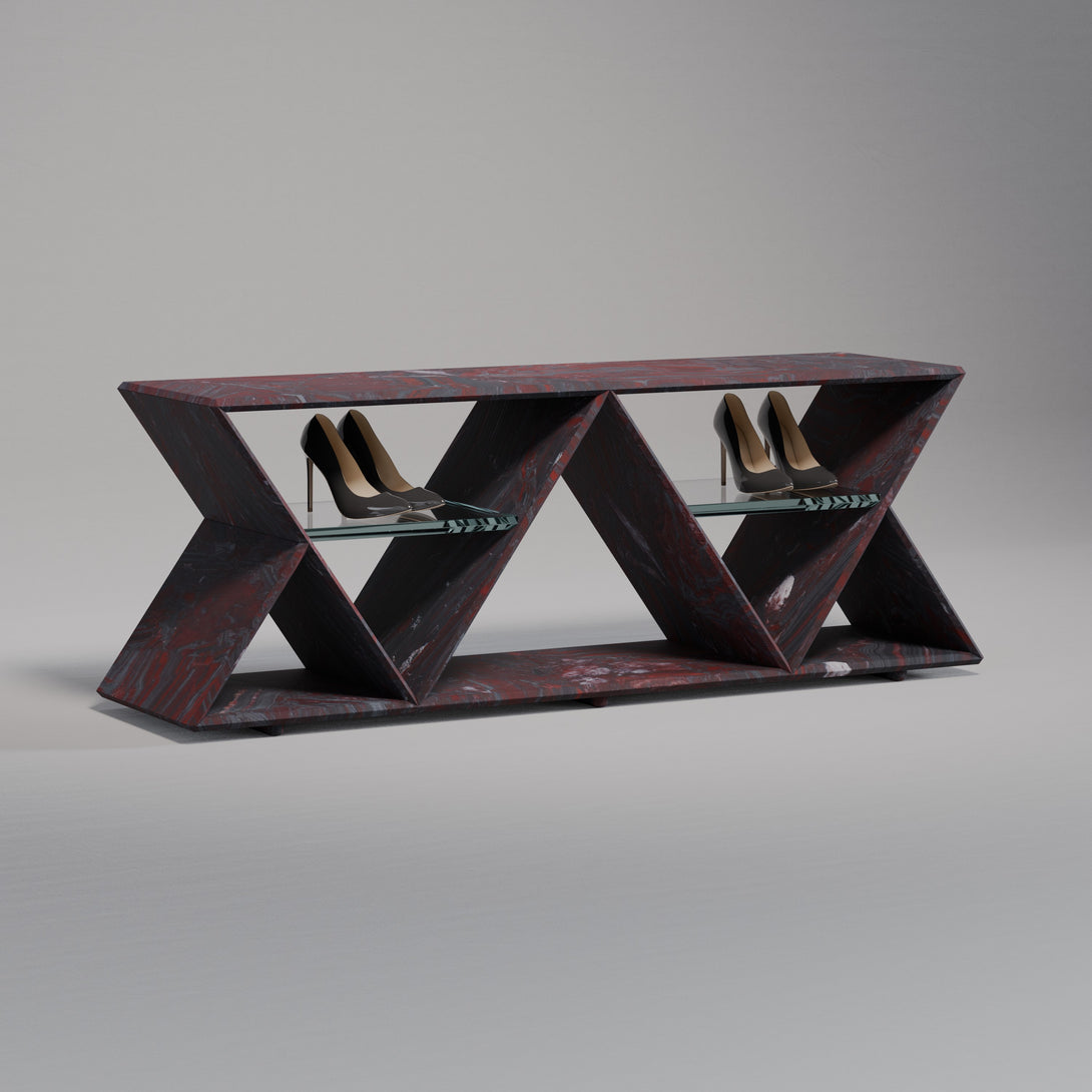 Its standout feature is the geometric structure composed of two inverted triangles, forming a rhythmic silhouette that conveys both modernity and timelessness. Within each triangular frame, a floating glass shelf creates a light visual contrast while offering practical support to organize or display shoes with sophistication.