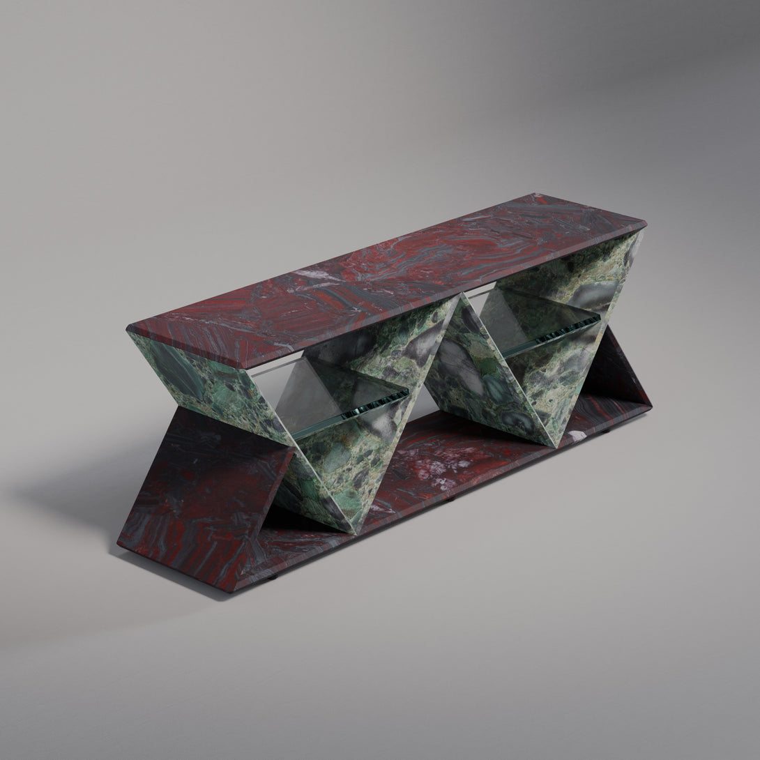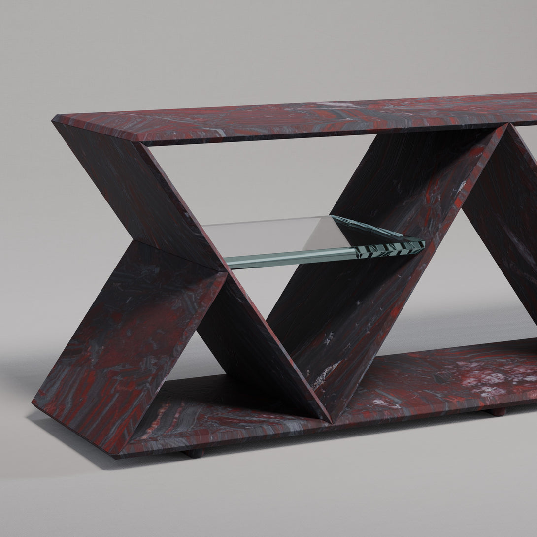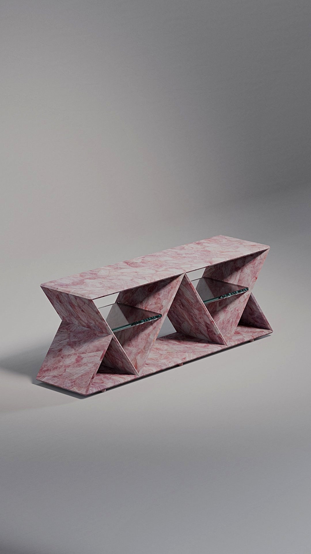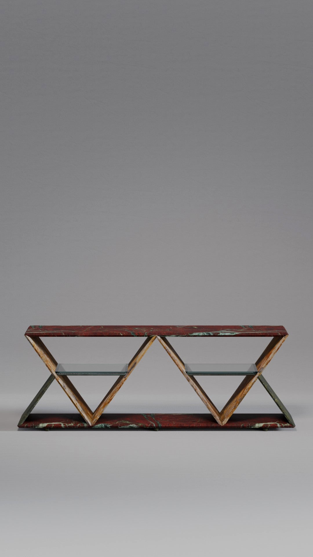 Its standout feature is the geometric structure composed of two inverted triangles, forming a rhythmic silhouette that conveys both modernity and timelessness. Within each triangular frame, a floating glass shelf creates a light visual contrast while offering practical support to organize or display shoes with sophistication.