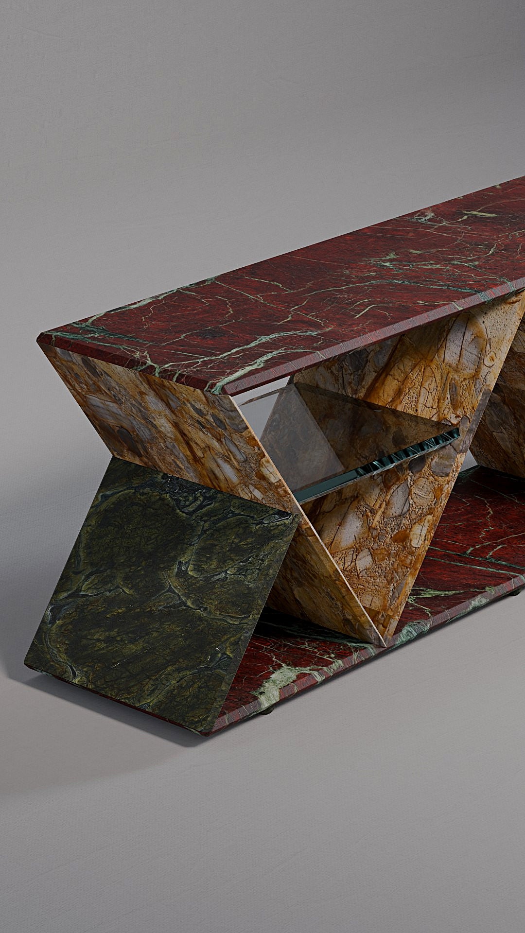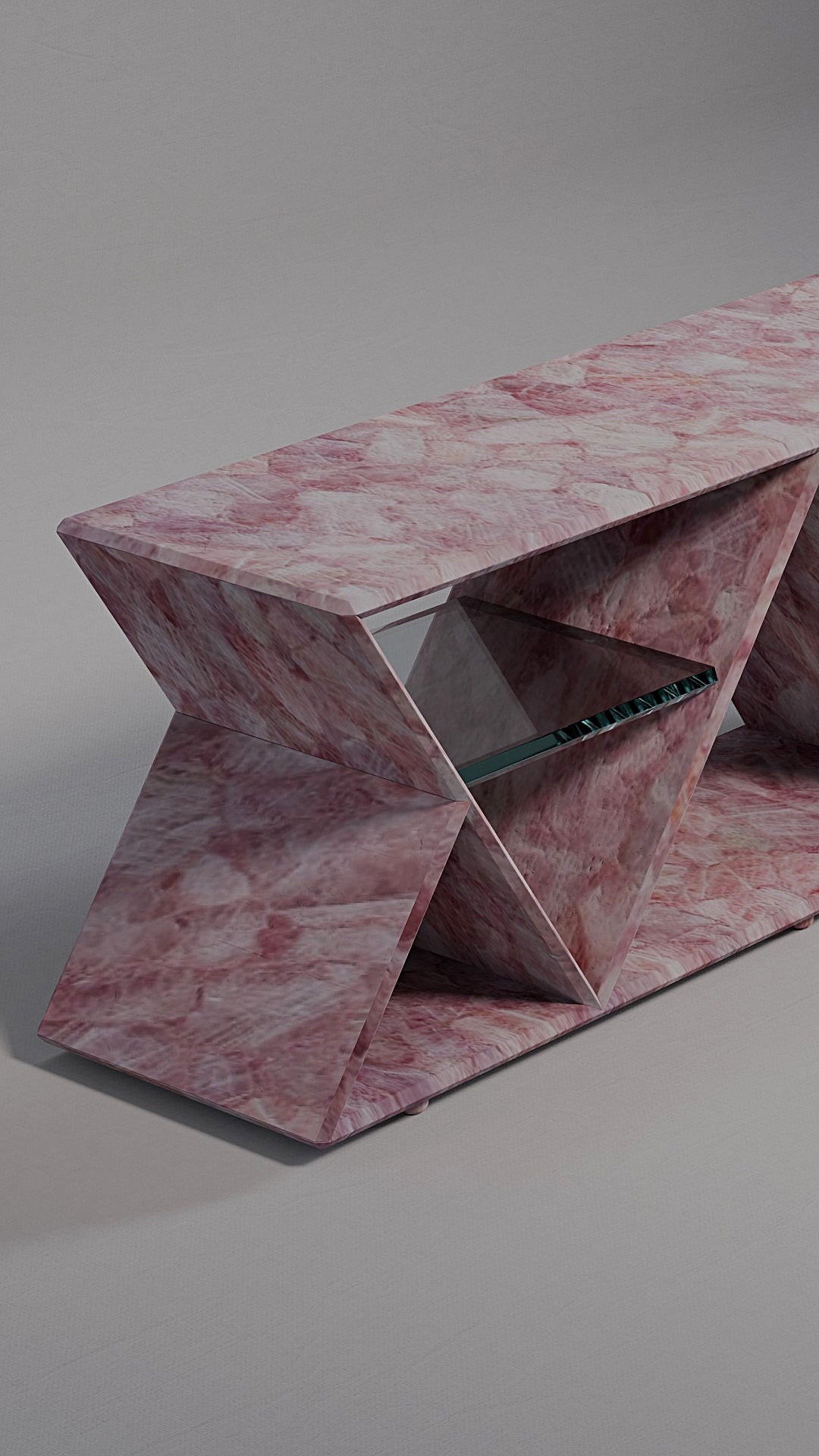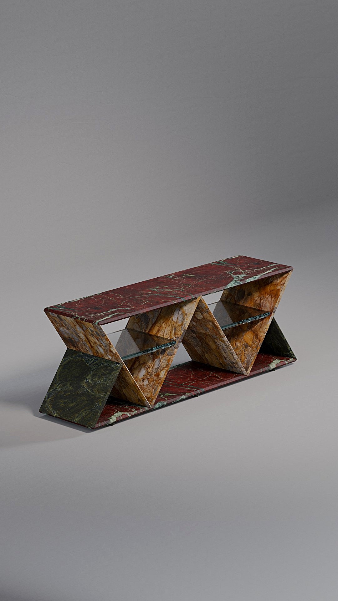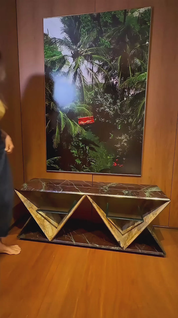 Its standout feature is the geometric structure composed of two inverted triangles, forming a rhythmic silhouette that conveys both modernity and timelessness. Within each triangular frame, a floating glass shelf creates a light visual contrast while offering practical support to organize or display shoes with sophistication.