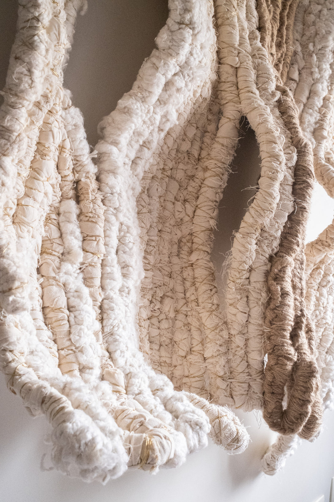 The Mãe wall tapestry is a sophisticated handcrafted piece that combines cotton, silk, and brass in its composition. The cotton provides a soft and durable base, while the silk adds a subtle sheen. Brass details offer an elegant metallic touch, creating a harmonious contrast with the textile fibers.
