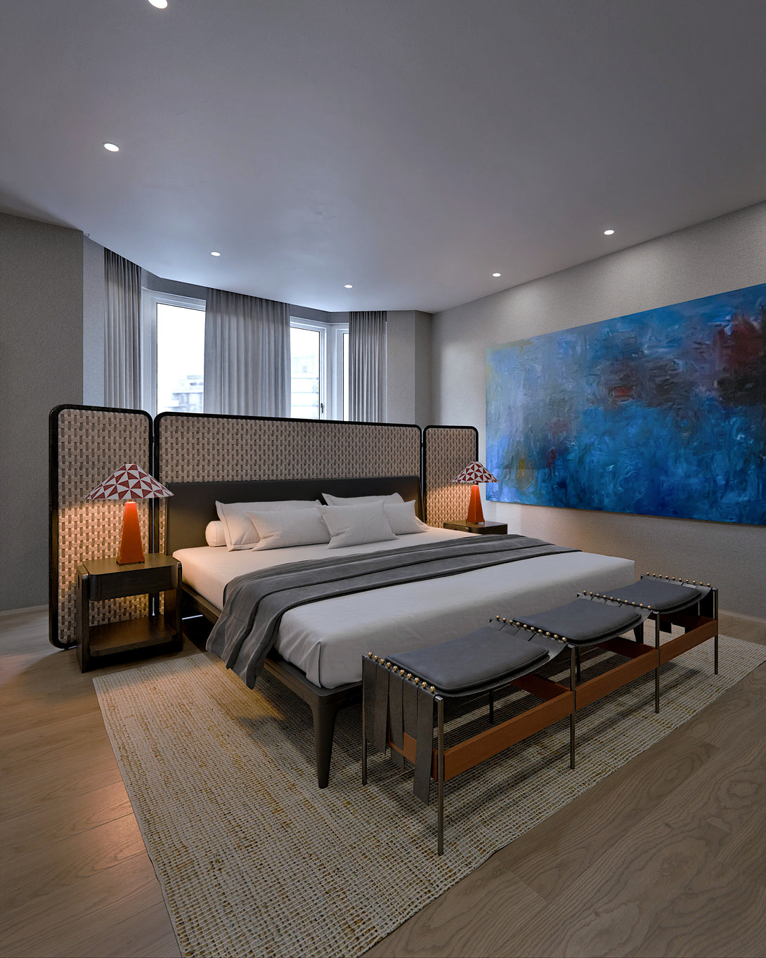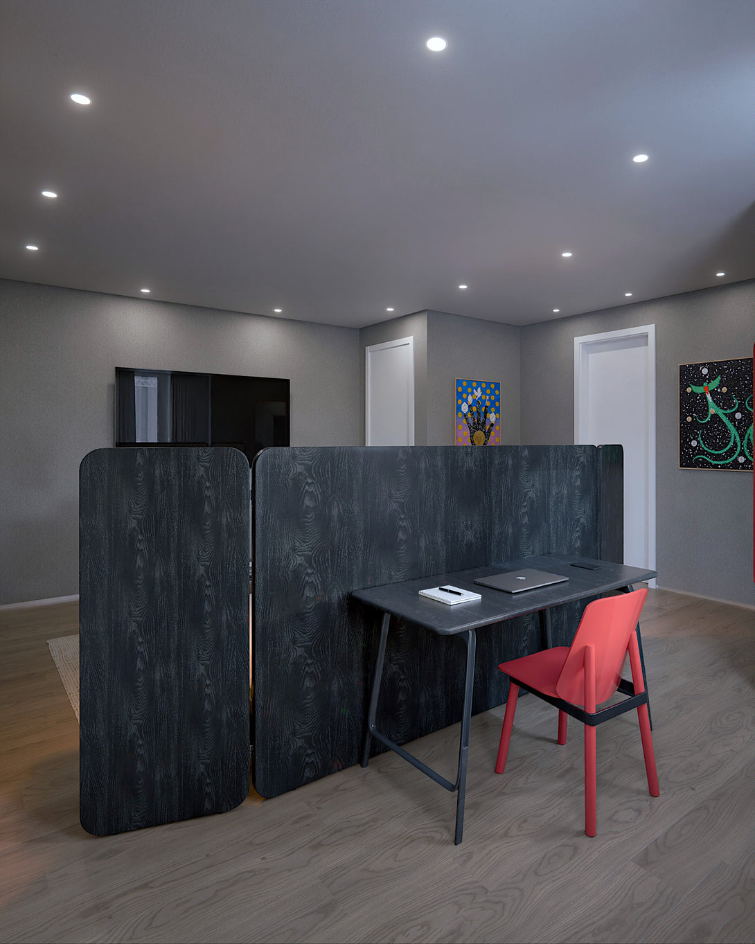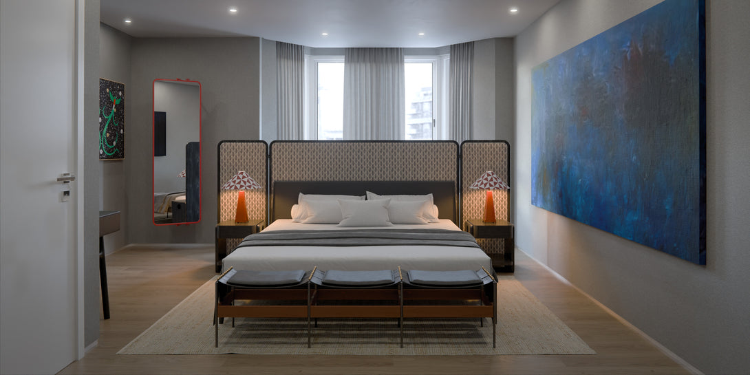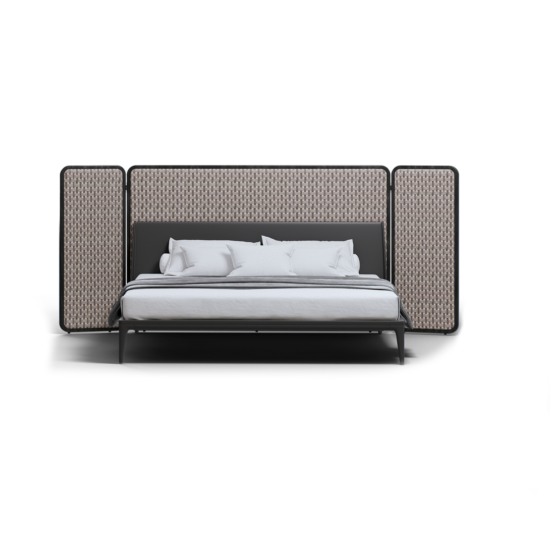 The Marcele folding screen is crafted from Ebonized wood and adorned with Jacquard Fabric Greta Black. With a keen focus on durability and a unique aesthetic appeal, this folding screen requires 60 days to be produced, resulting in an exclusive and sophisticated piece.
