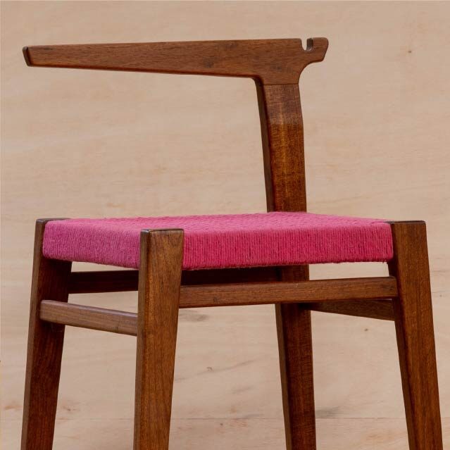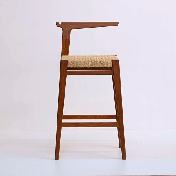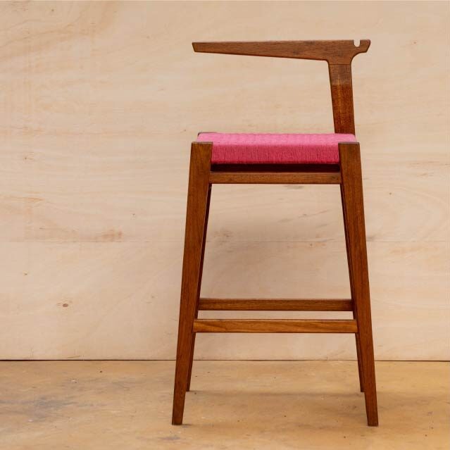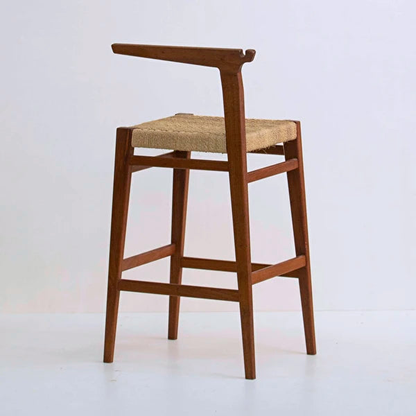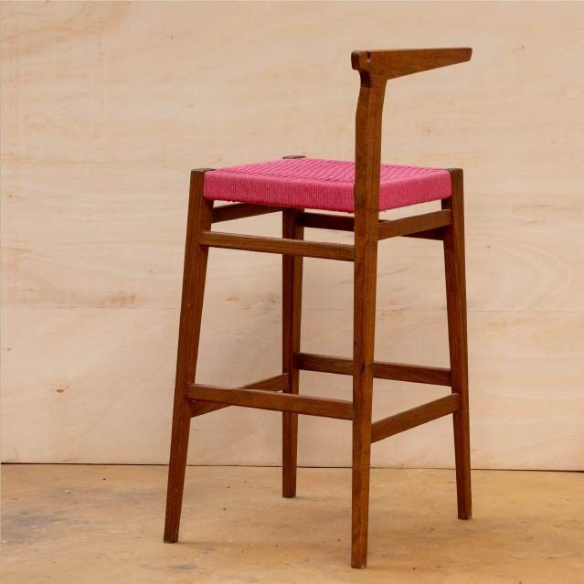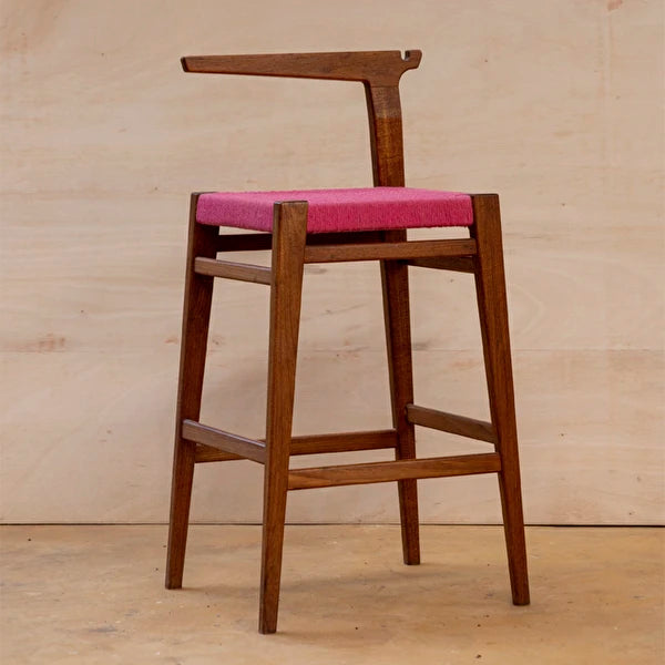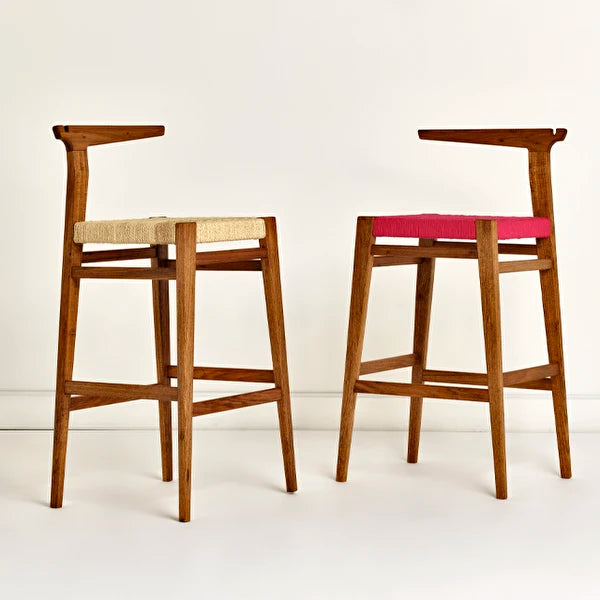 High Natural Stool. Artisanally crafted from solid wood, the backrest can be produced from either the right or left rear leg, creating a beautiful composition when used side by side. The seat is handwoven and can be made in a variety of colors and materials, depending on the client's project needs.