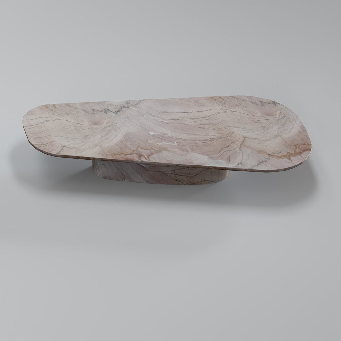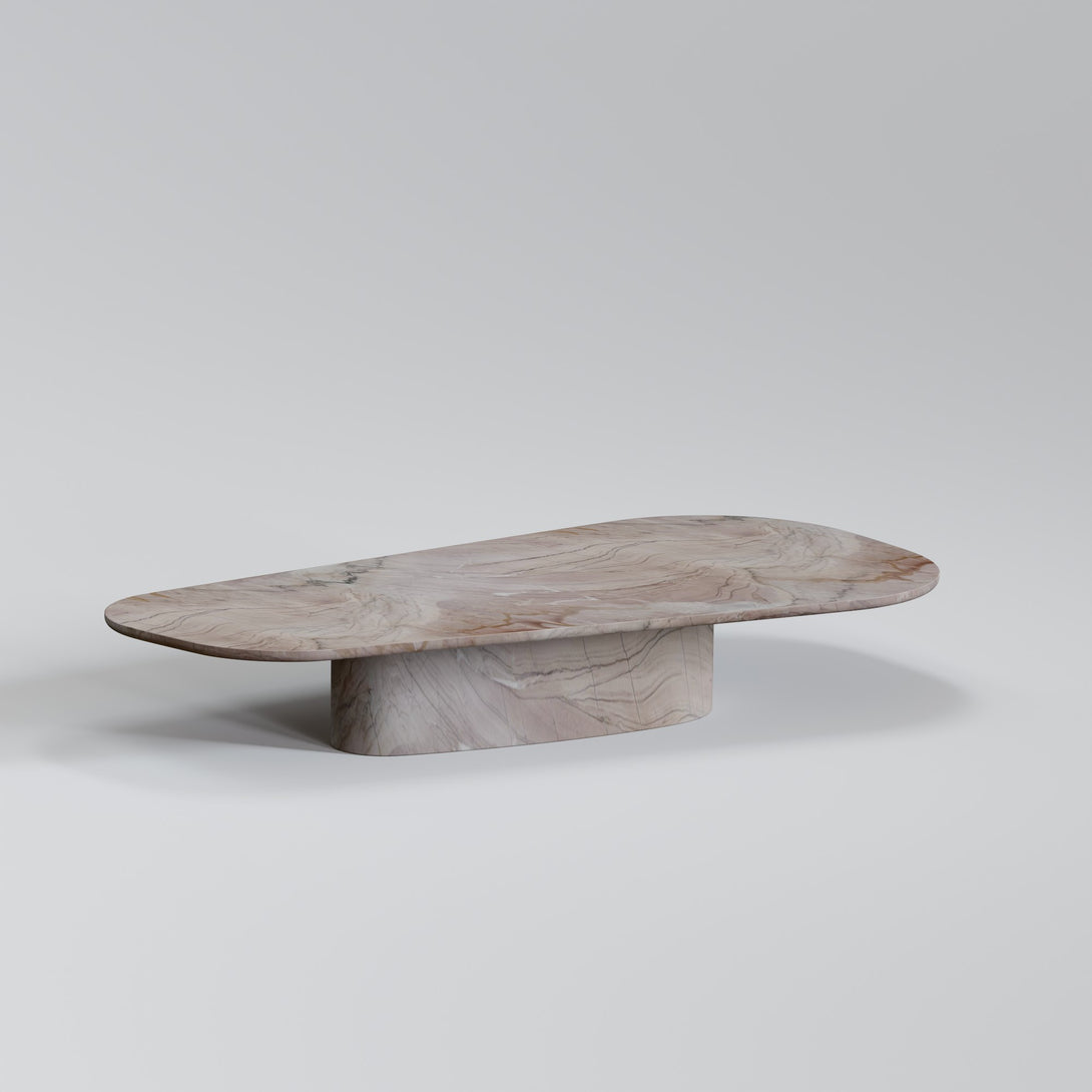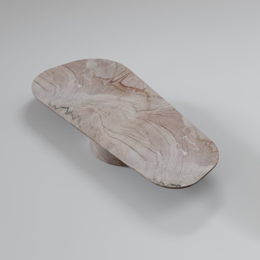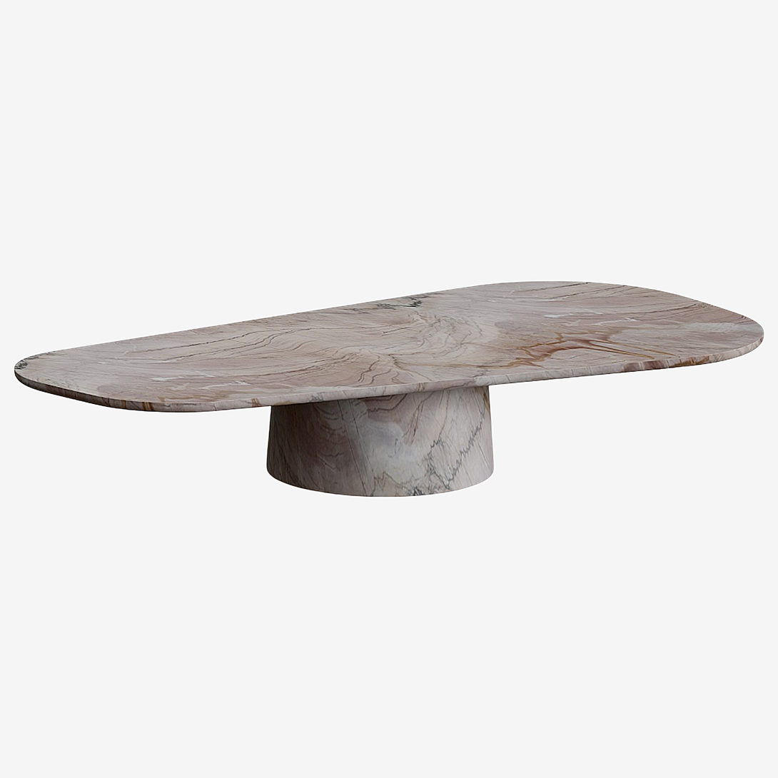 Sculpted from Negroni stone, this coffee table combines the strength of natural materials with organic, fluid forms. Its sinuous design evokes landscapes shaped by time, bringing a sense of balance between the raw and the refined. The surface features unique veining and earthy tones that range from deep wine to rust and rich brown — a vibrant palette that makes each piece truly one of a kind.