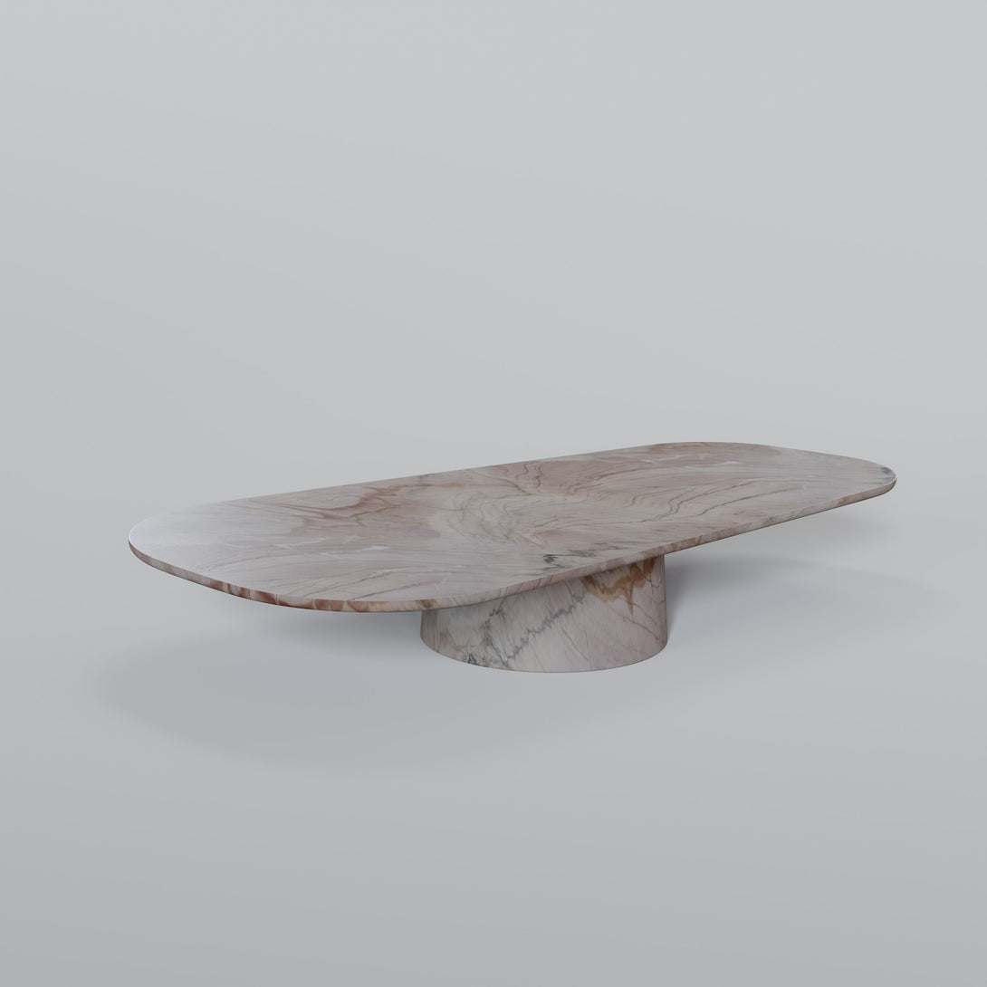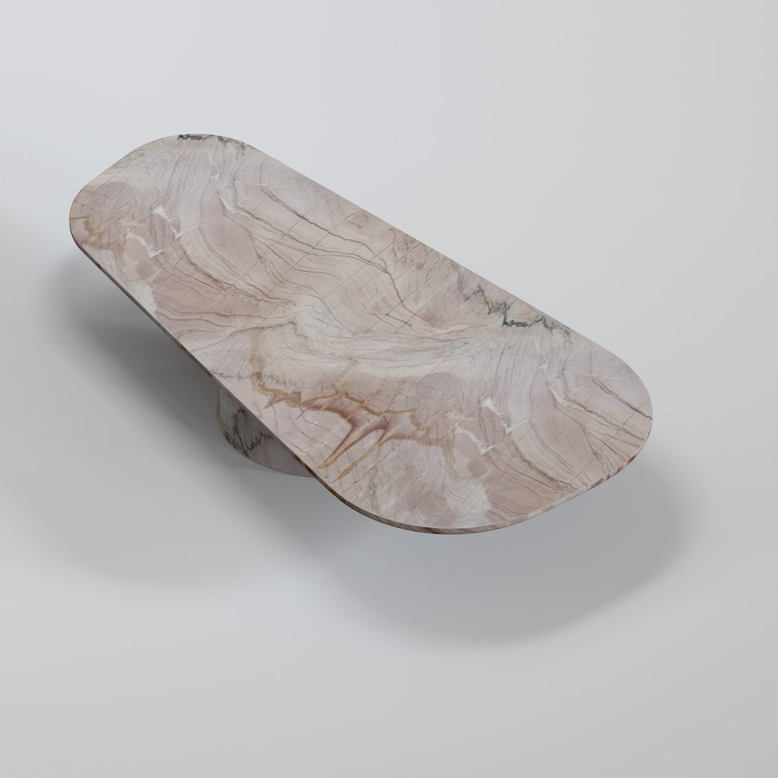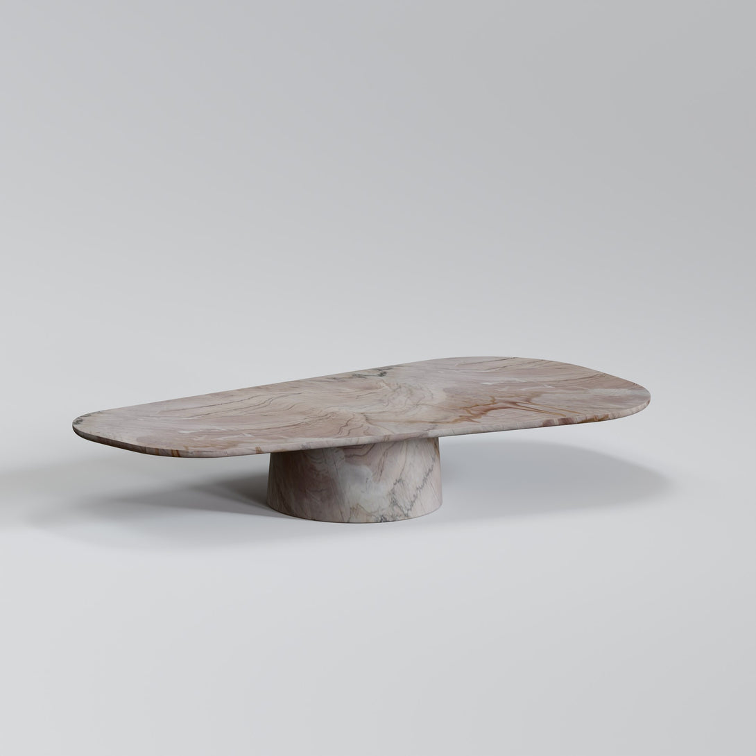 Sculpted from Negroni stone, this coffee table combines the strength of natural materials with organic, fluid forms. Its sinuous design evokes landscapes shaped by time, bringing a sense of balance between the raw and the refined. The surface features unique veining and earthy tones that range from deep wine to rust and rich brown — a vibrant palette that makes each piece truly one of a kind.