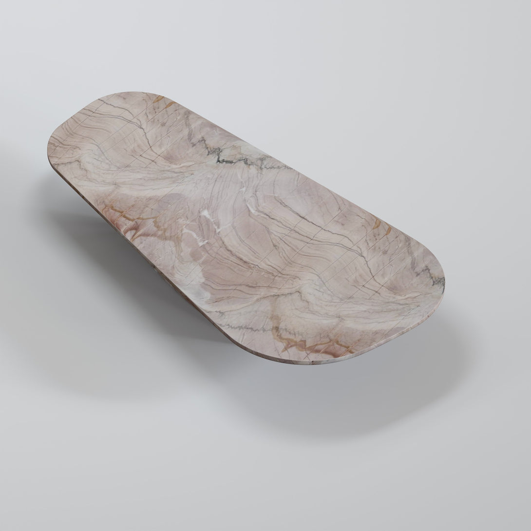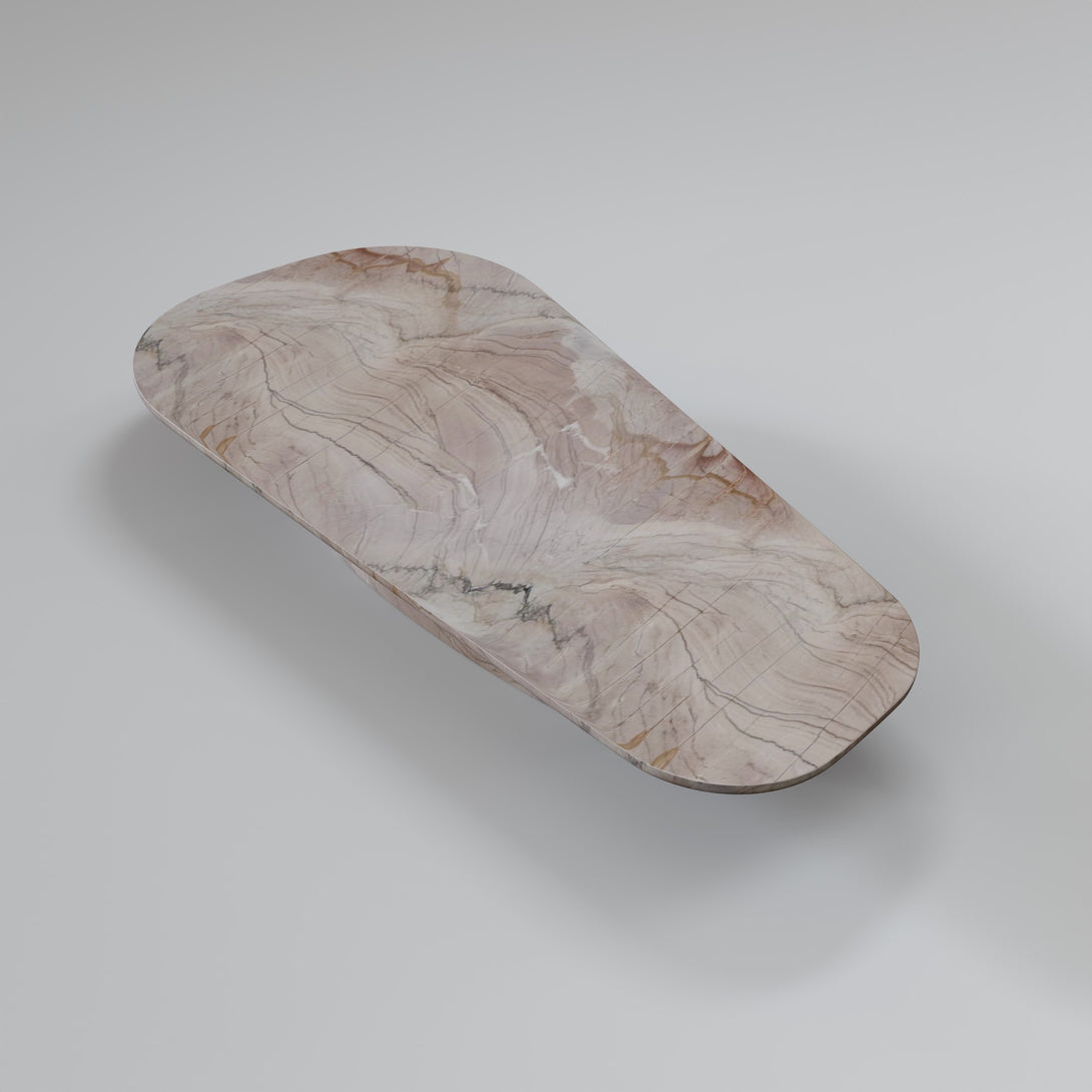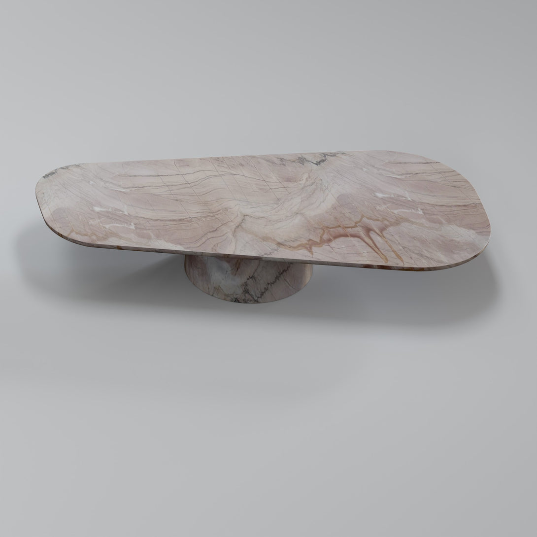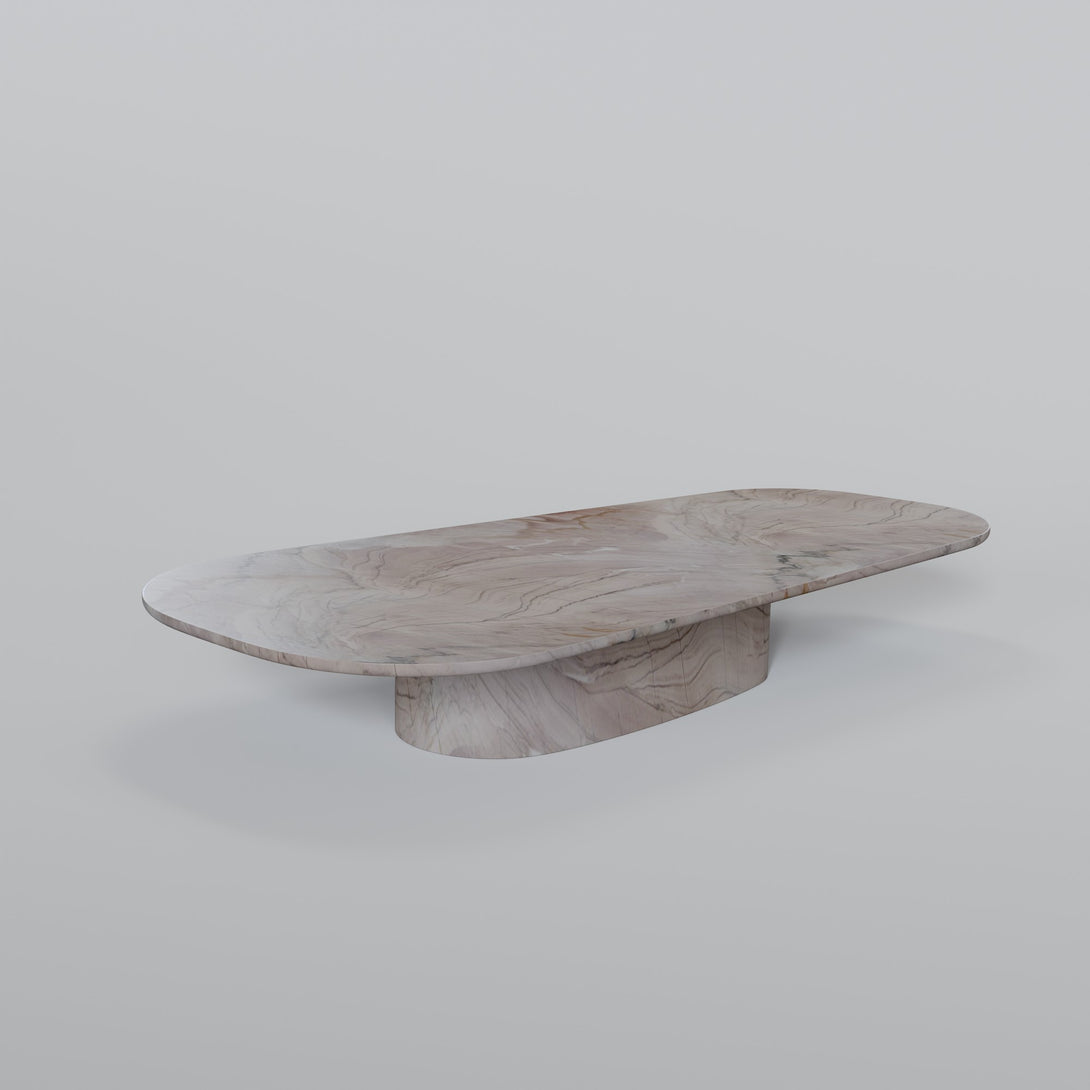 Sculpted from Negroni stone, this coffee table combines the strength of natural materials with organic, fluid forms. Its sinuous design evokes landscapes shaped by time, bringing a sense of balance between the raw and the refined. The surface features unique veining and earthy tones that range from deep wine to rust and rich brown — a vibrant palette that makes each piece truly one of a kind.