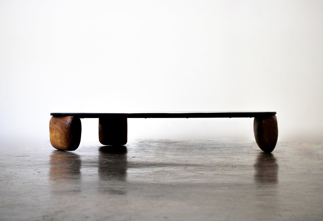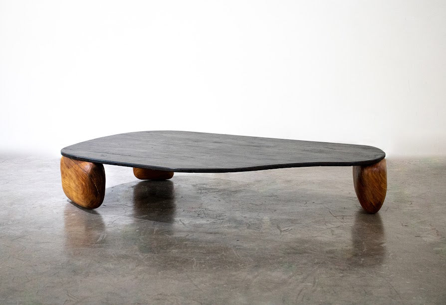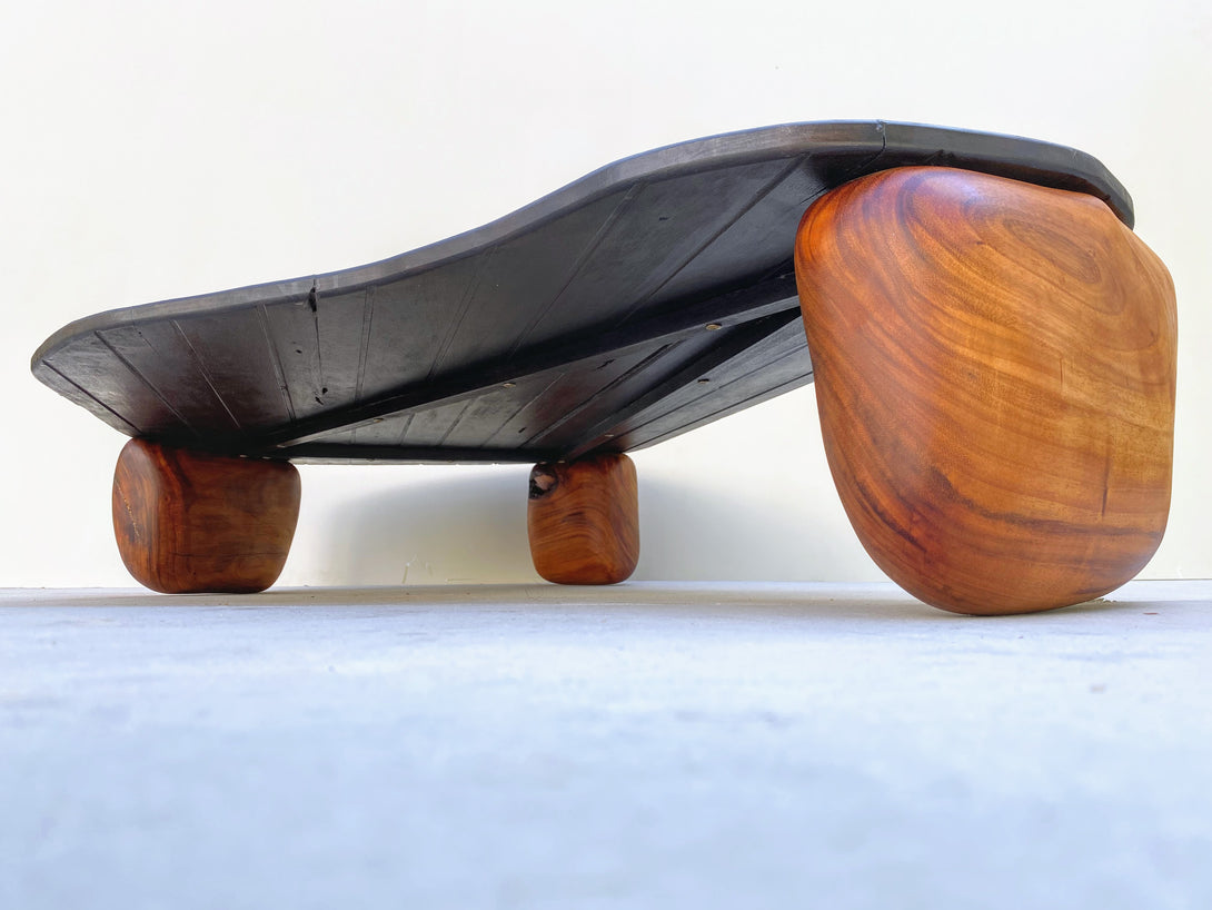 Crafted from old carbonized tobacco ipe floorboards and meticulously hand-carved Vinhático wood legs.