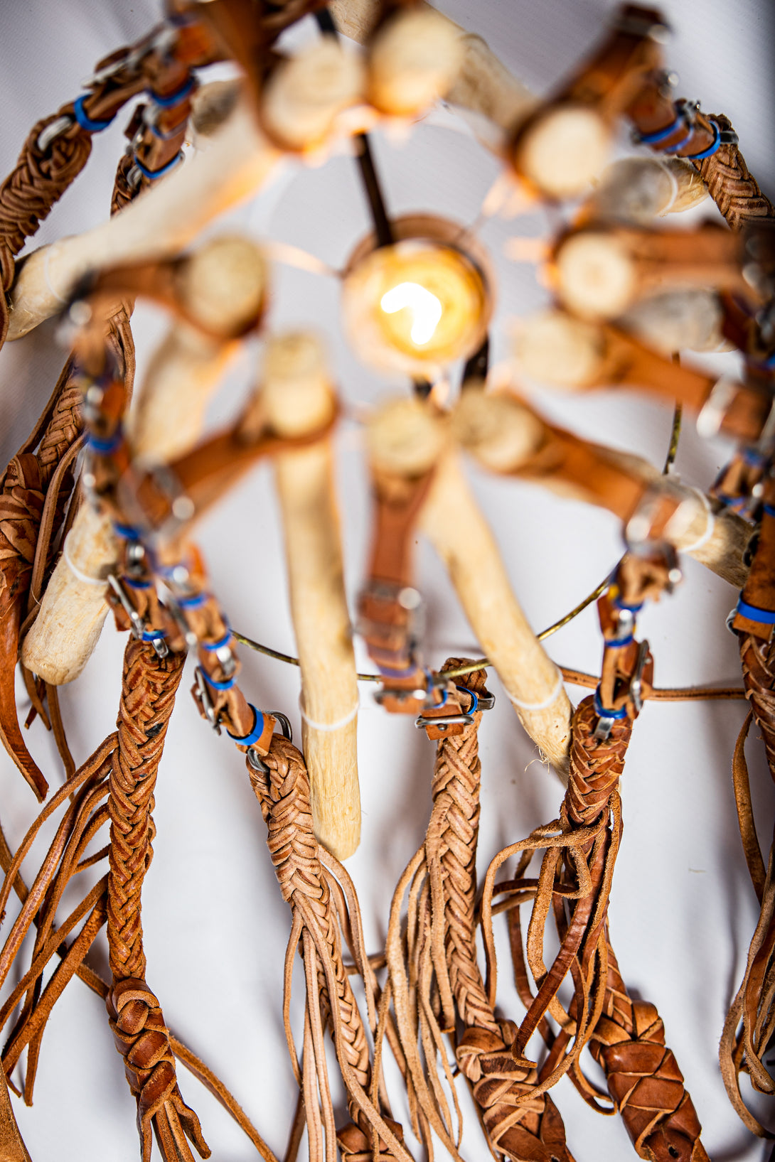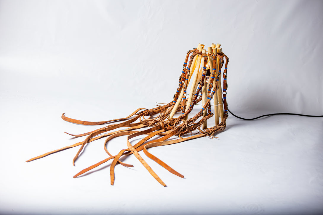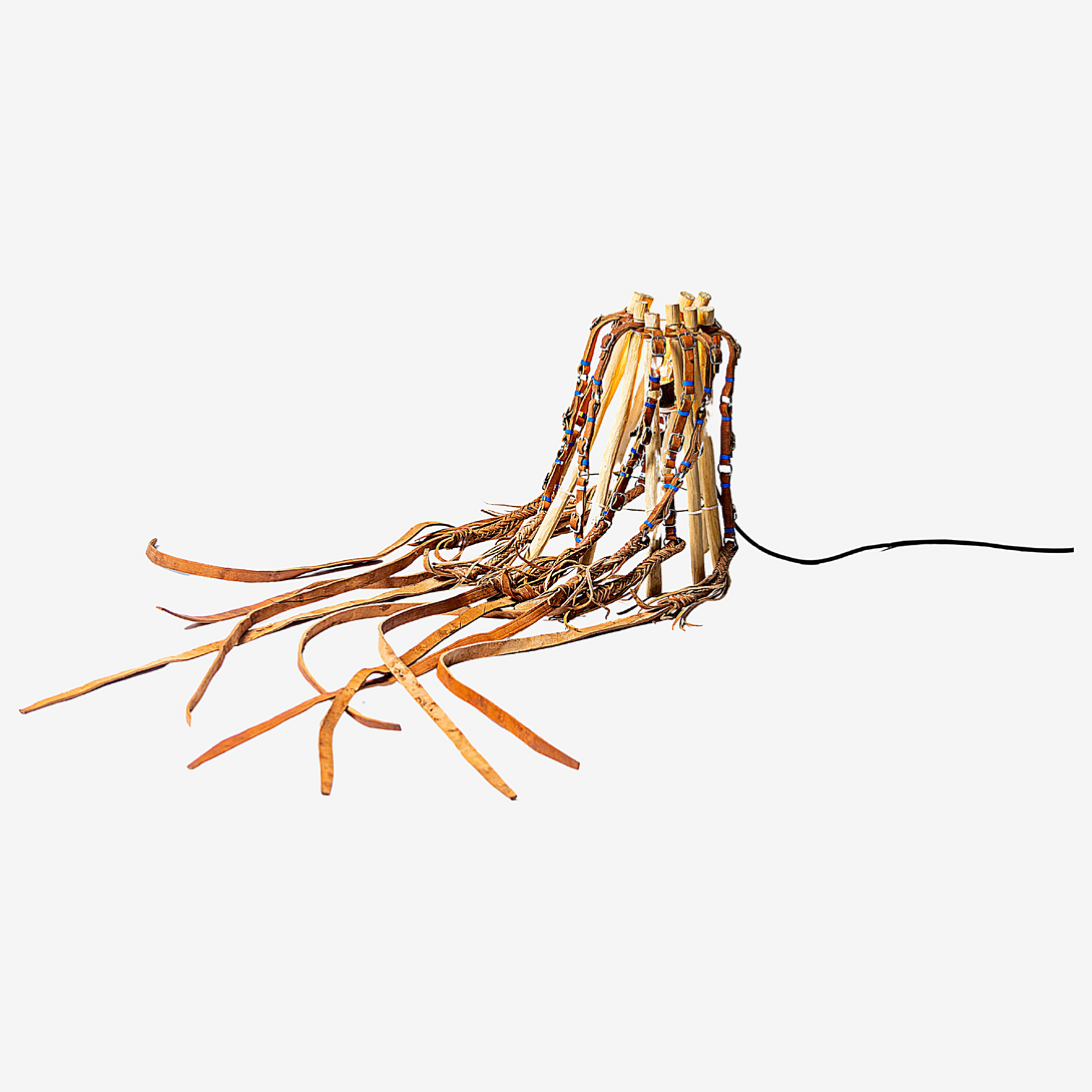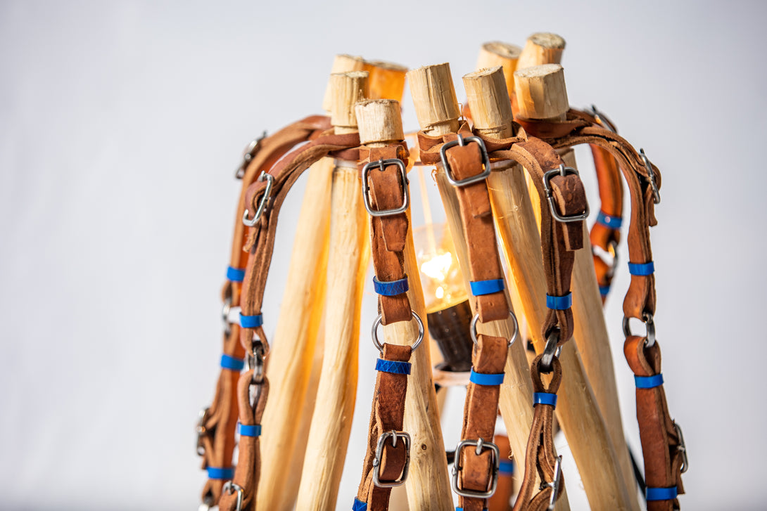 The Rebenque light fixture is a unique and autonomous piece that showcases a fascinating experimental design. Crafted from the fusion of traditional leather whips, typically found in popular markets in the backlands of Alagoas, this lamp stands as a brilliant example of human ability to turn seemingly simple materials into something extraordinary.