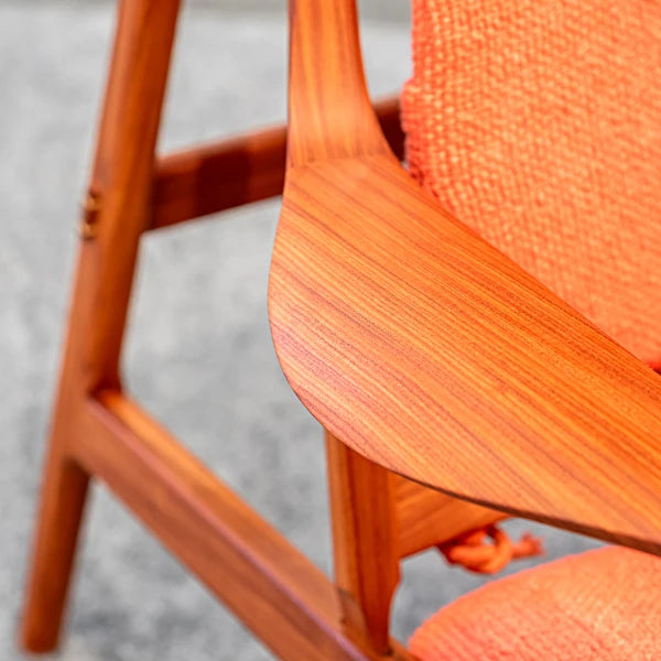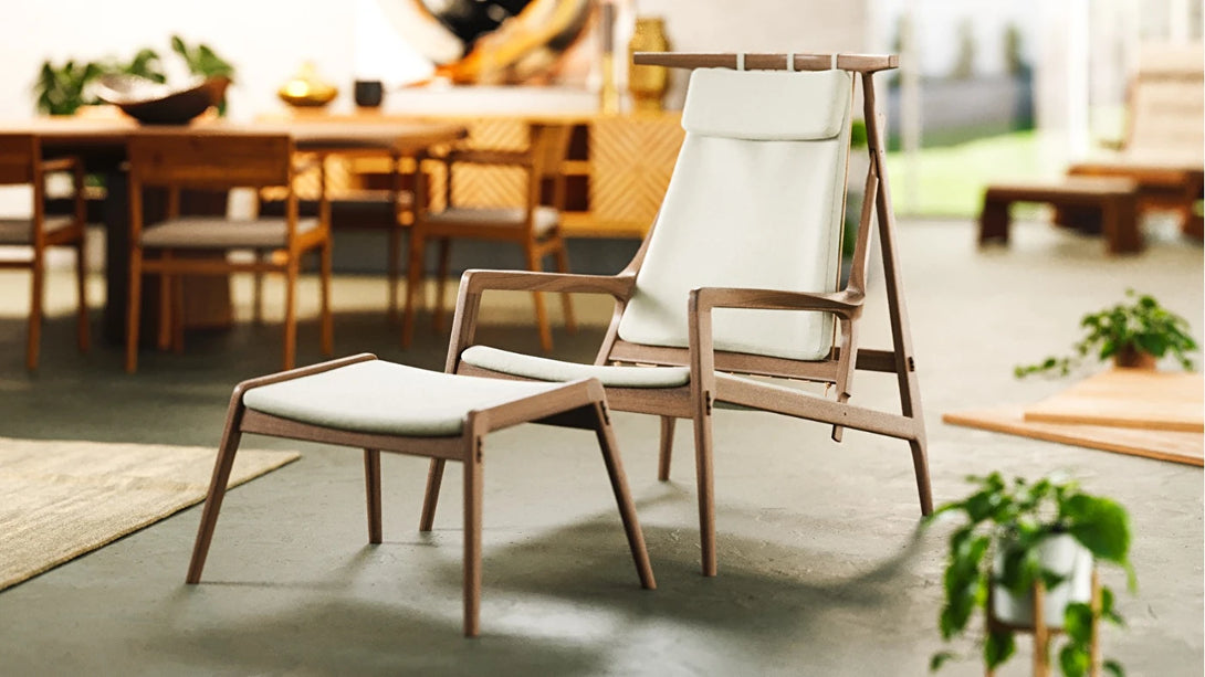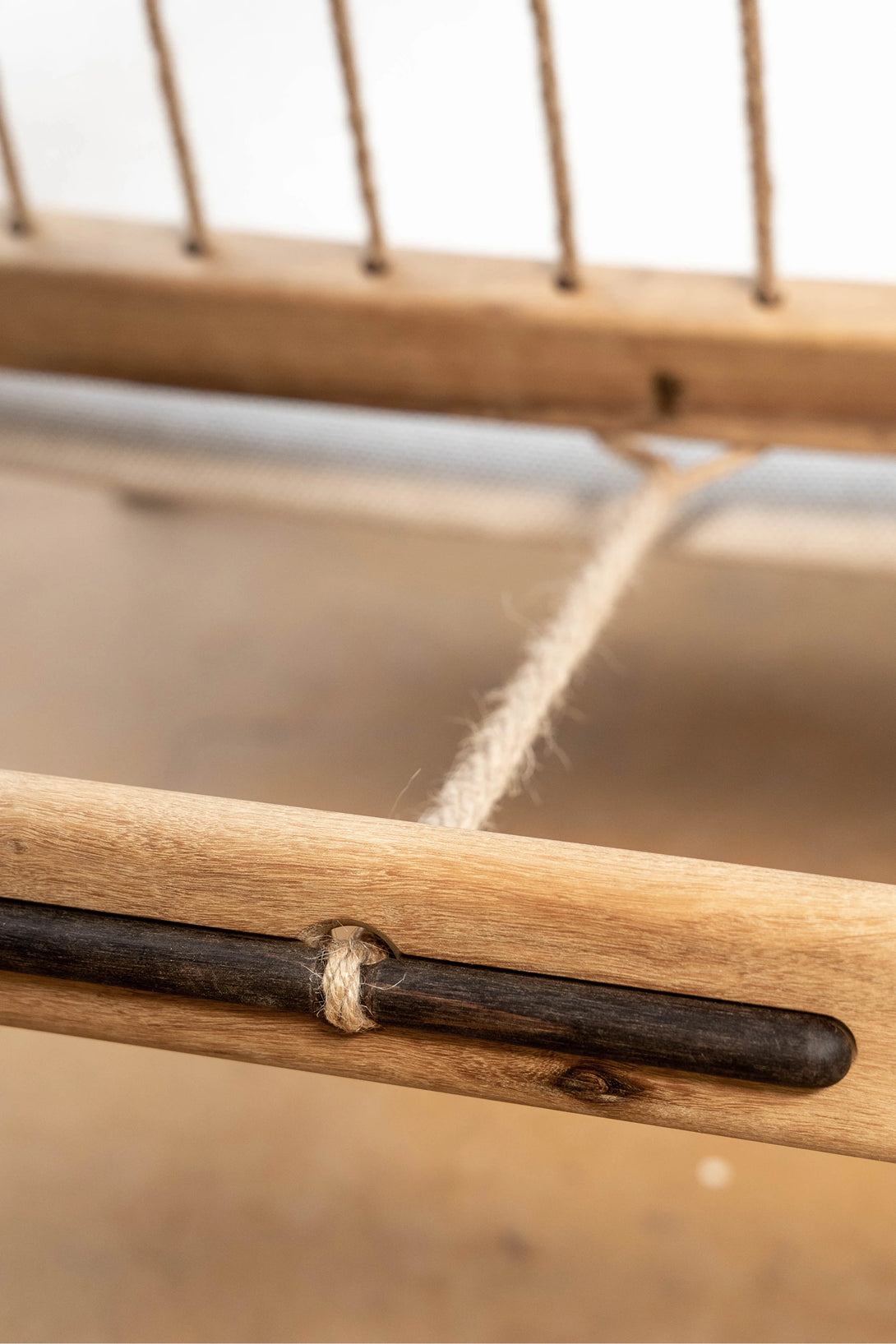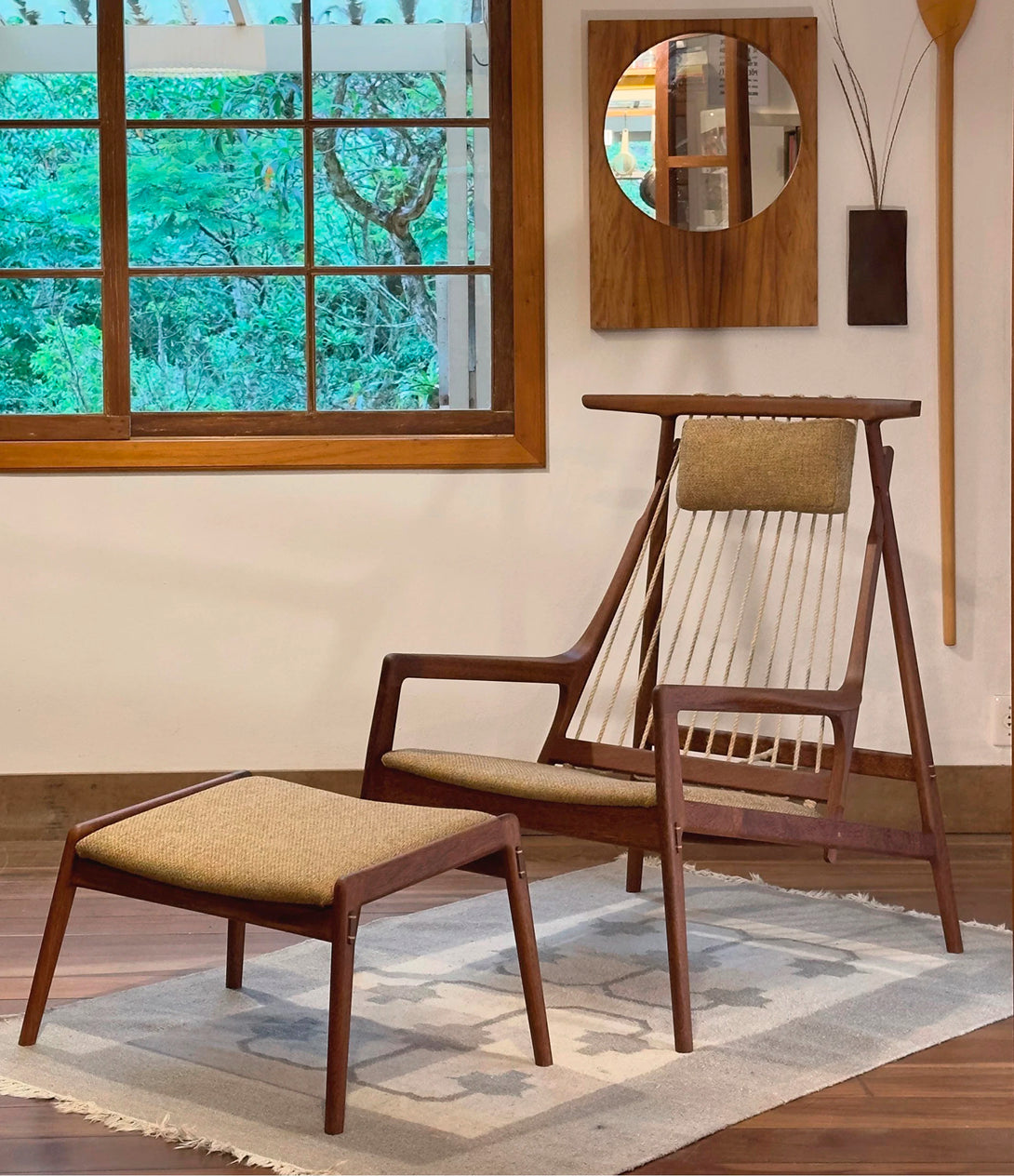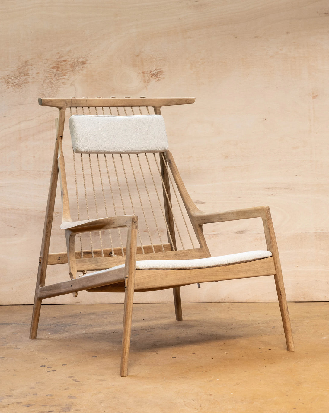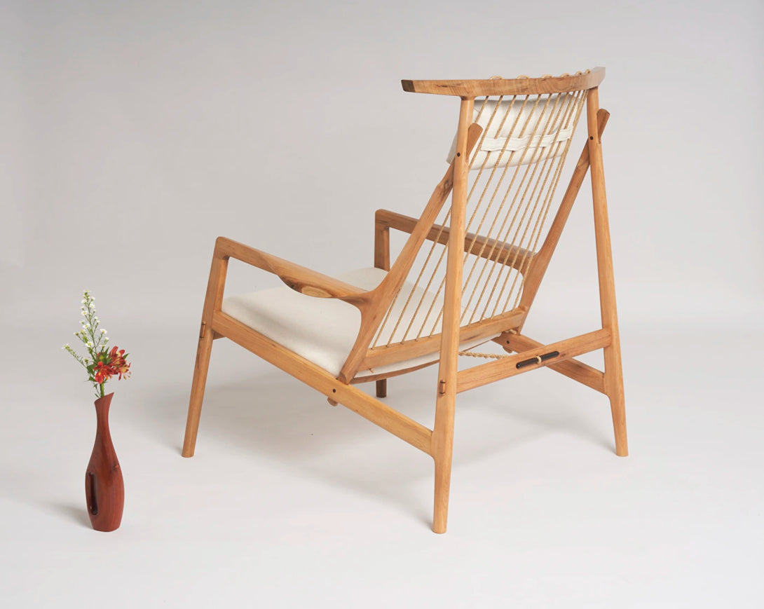 Contemporary armchair crafted from solid tropical wood with a comfortably padded seat. Its backrest, made of ropes tensioned by a small lever located at the back of the chair, ensures comfort that adapts to the act of reclining. It can be used with or without a padded backrest over the ropes and with a movable head cushion. It can be paired with an ottoman. Available in different wood species, ropes, or fabrics. This armchair is signed and numbered.