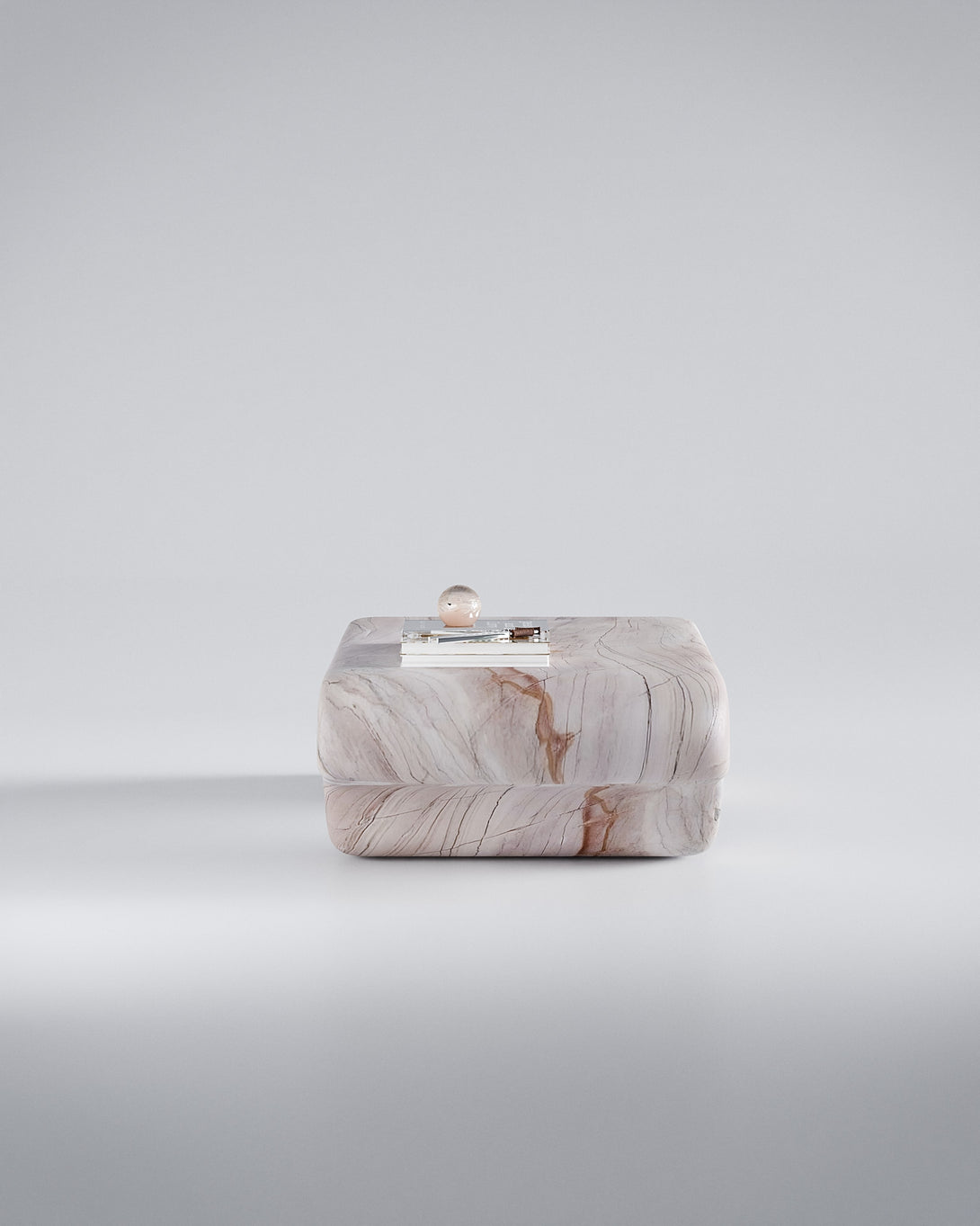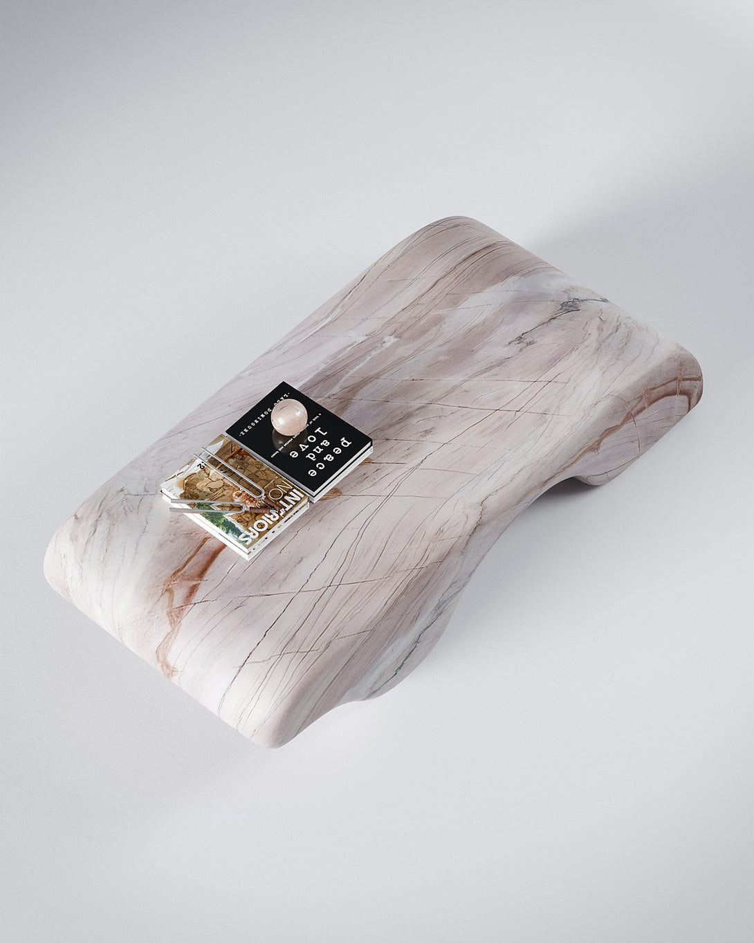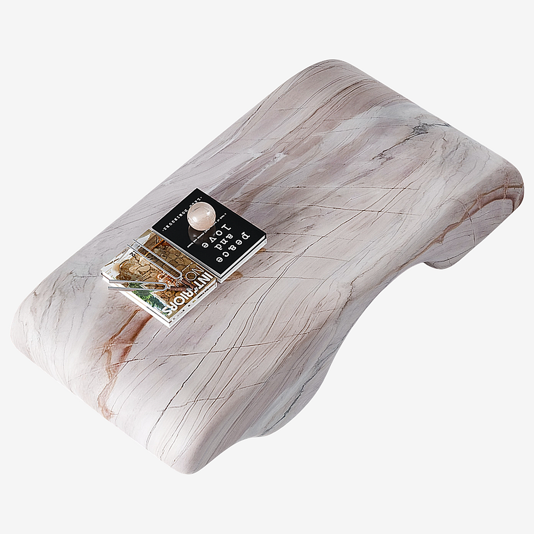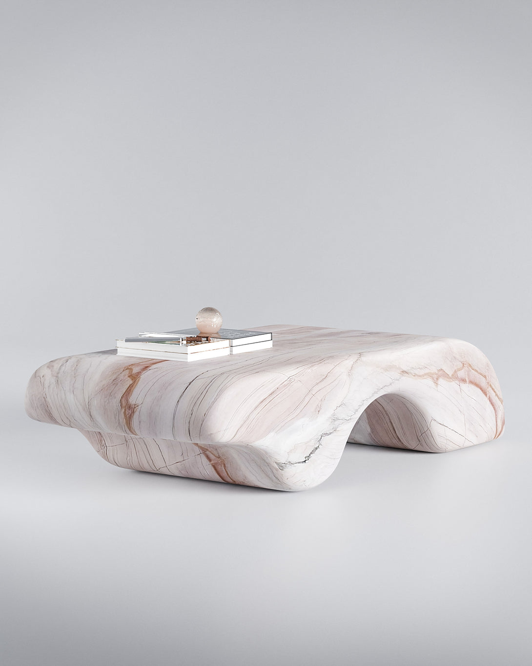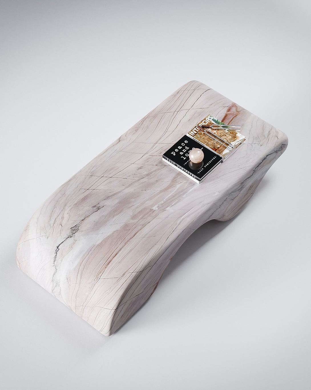 With gentle curves and a sculptural presence, this coffee table is carved from Negroni natural stone, featuring a polished finish and striking veining. Its low, fluid design evokes geological forms shaped by time, bringing a sense of lightness and movement to a solid, weighty material.