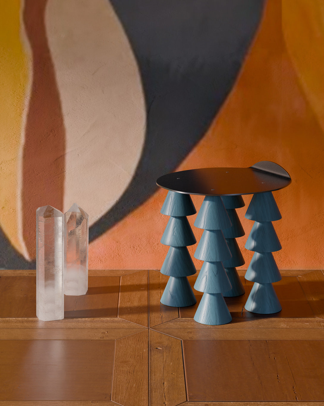 Introducing the Stool N1 from the "CENA" collection, an example of sculptural furniture that celebrates the plurality and authenticity of our existence. The Stool 01 is a unique composition that combines volumetry, and geometric forms in a surreal manner. Its legs are made of solid Tauarí wood, known for its durability and natural beauty.