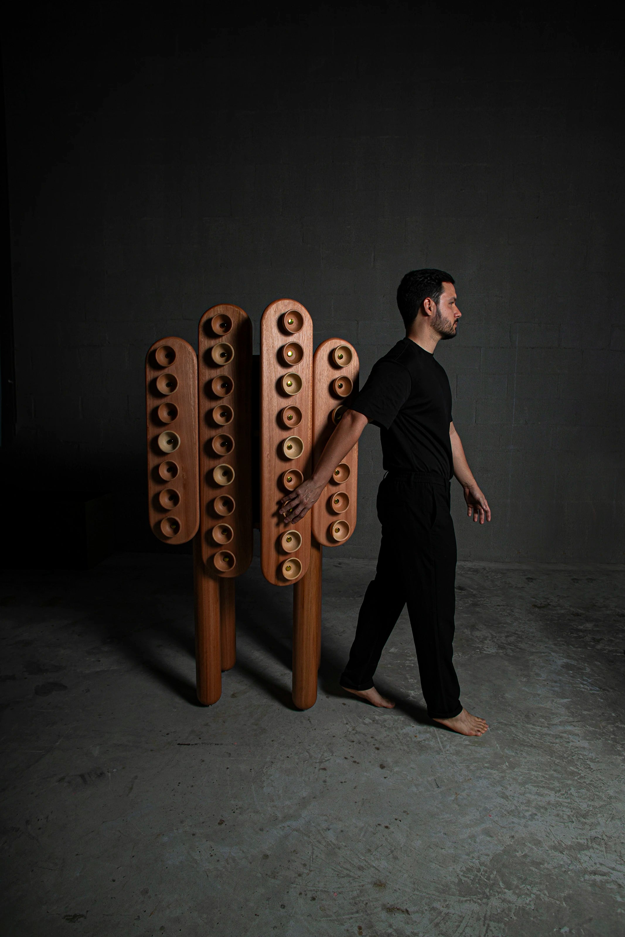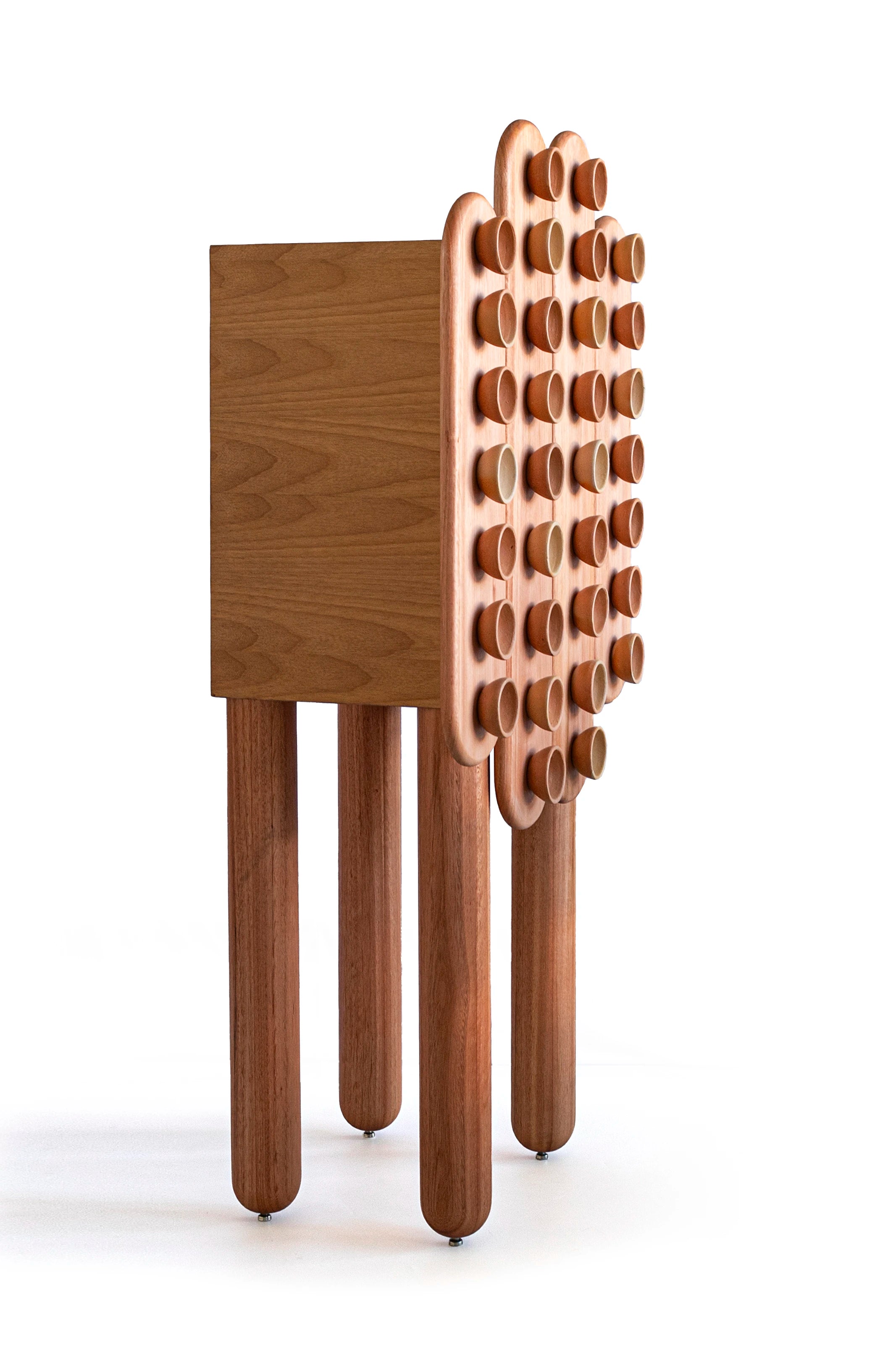 Fornada is a cabinet conceived as a piece of memory and affection. Inspired by the traditional way of baking empadas, a typical dish from the city of Goiás, the piece captures the artisanal gestures of cooks and ceramicists, transforming them into a language of design. The wooden structure provides solidity and presence, while the ceramic elements—produced in partnership with local artisans—appear as textures and reliefs, evoking freshly baked trays and also functioning as handles. Between utility and expression, it is both a piece of furniture and a sculpture: a daily altar dedicated to the culinary and artisanal culture of the cerrado.