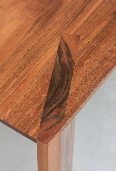 La función por encima de la forma. La mesa de comedor Chanfro, el último lanzamiento de Studio Reyes, presenta un diseño asertivo, limpio y lineal. Aunque su apariencia es simple, los detalles sutiles de los chaflanes en el tablero y las patas requieren una artesanía compleja, lo que resalta aún más la belleza de la madera maciza de Muiracatiara. Cada fragmento de madera dialoga con los demás de una manera inesperada, creando una armonía visual que impresiona.