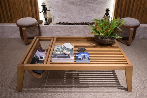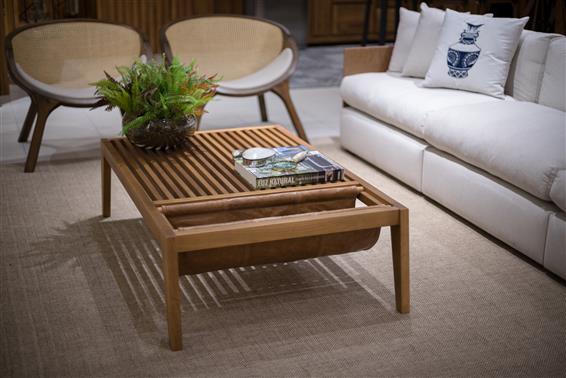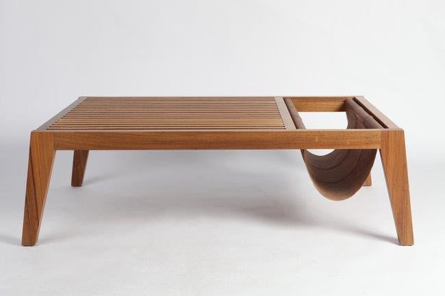 Una mesa de centro elaborada con listones de madera que realzan su belleza, realizada por el reconocido diseñador Zanini De Zanine . Su robusta estructura de madera maciza garantiza durabilidad y estabilidad, mientras que la funda de cuero natural aporta un toque de sofisticación y comodidad.