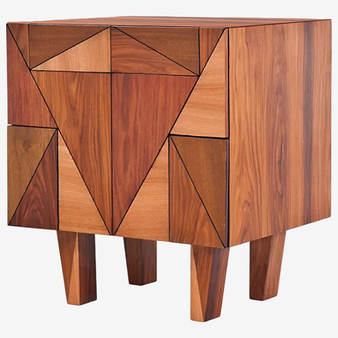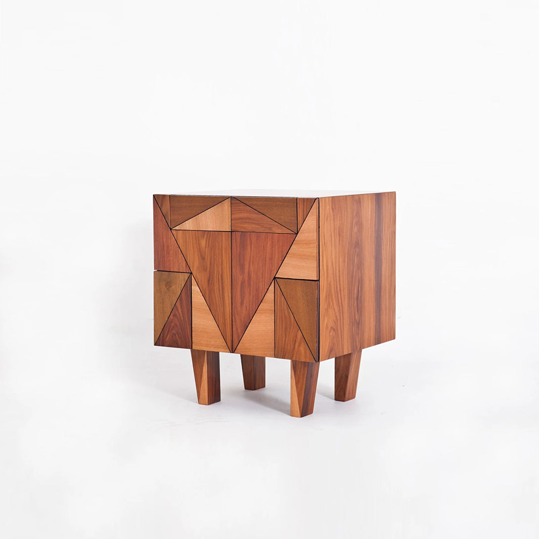 La mesita de noche Little Secret es una encantadora pieza revestida en chapa de madera natural. Su diseño presenta formas geométricas en el frente, aportando un toque moderno y elegante.