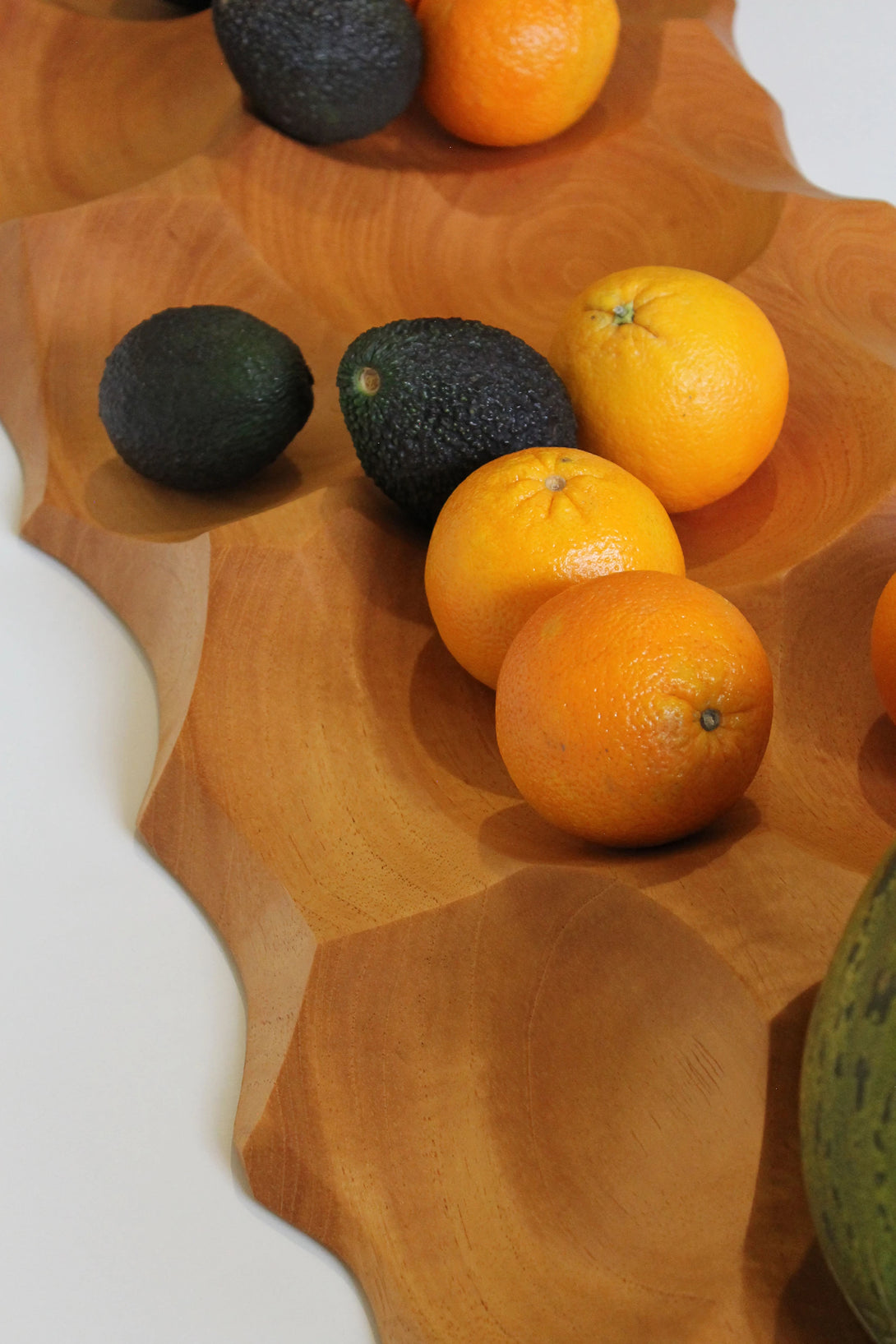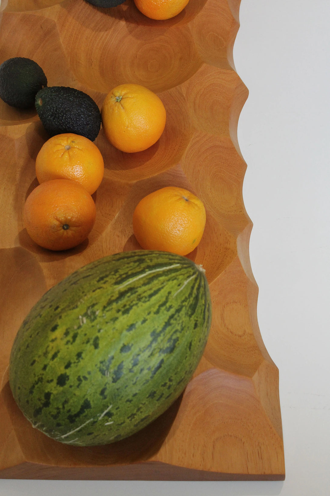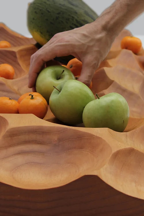 La concepción de la pieza se logró a través de la sustracción de volúmenes esféricos de un bloque de madera, creando una serie de huecos que sirven de almacenamiento para frutas y otros objetos.