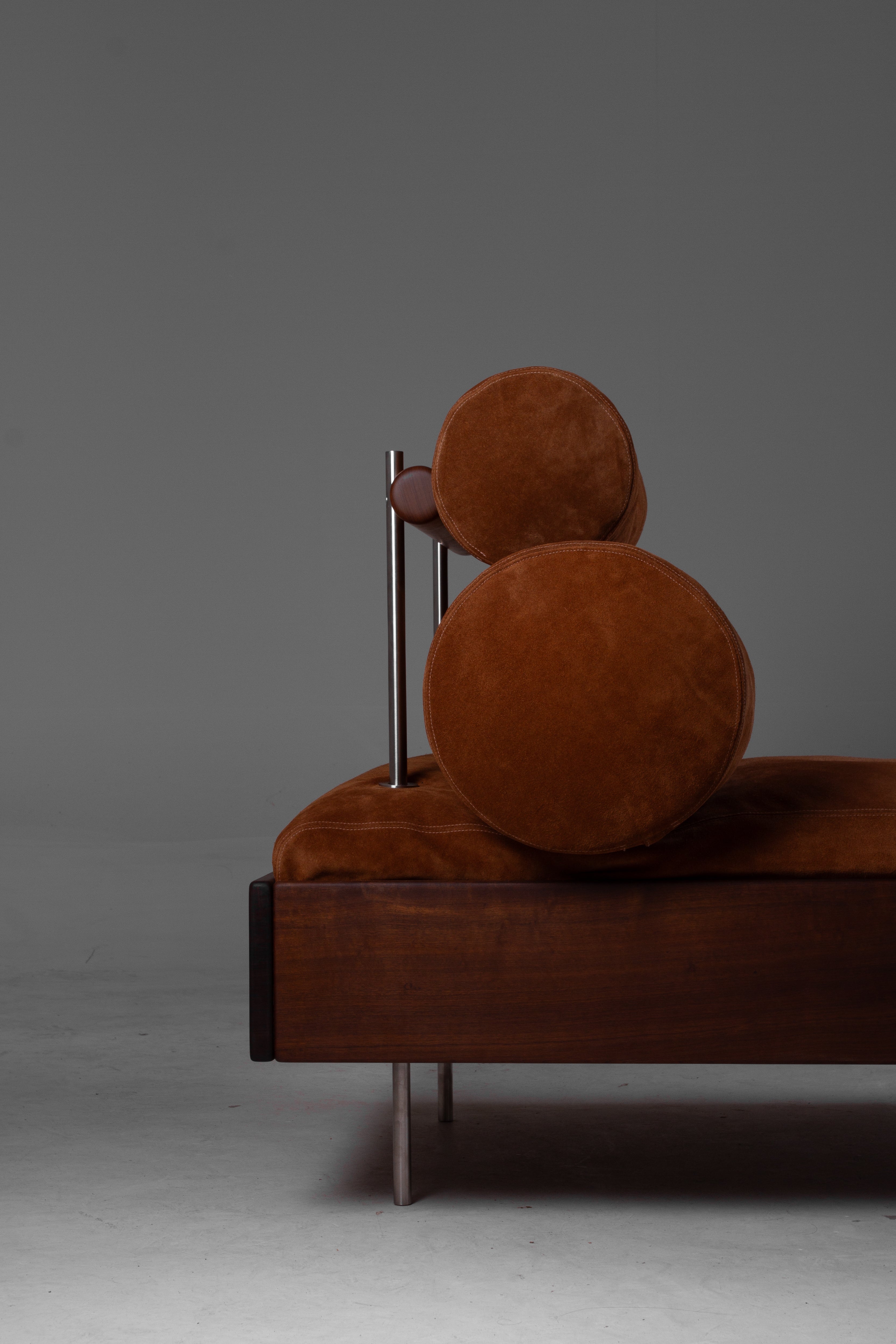 Está elaborado en madera maciza en opciones como violeta, sucupira, tauarí y carbonizado. Puede tapizarse en tela, bouclé o cuero. La estructura puede ser de acero inoxidable (pulido, cepillado, rosa o dorado) y disponible en pintura electrostática en negro, blanco, gris, verde y marrón.