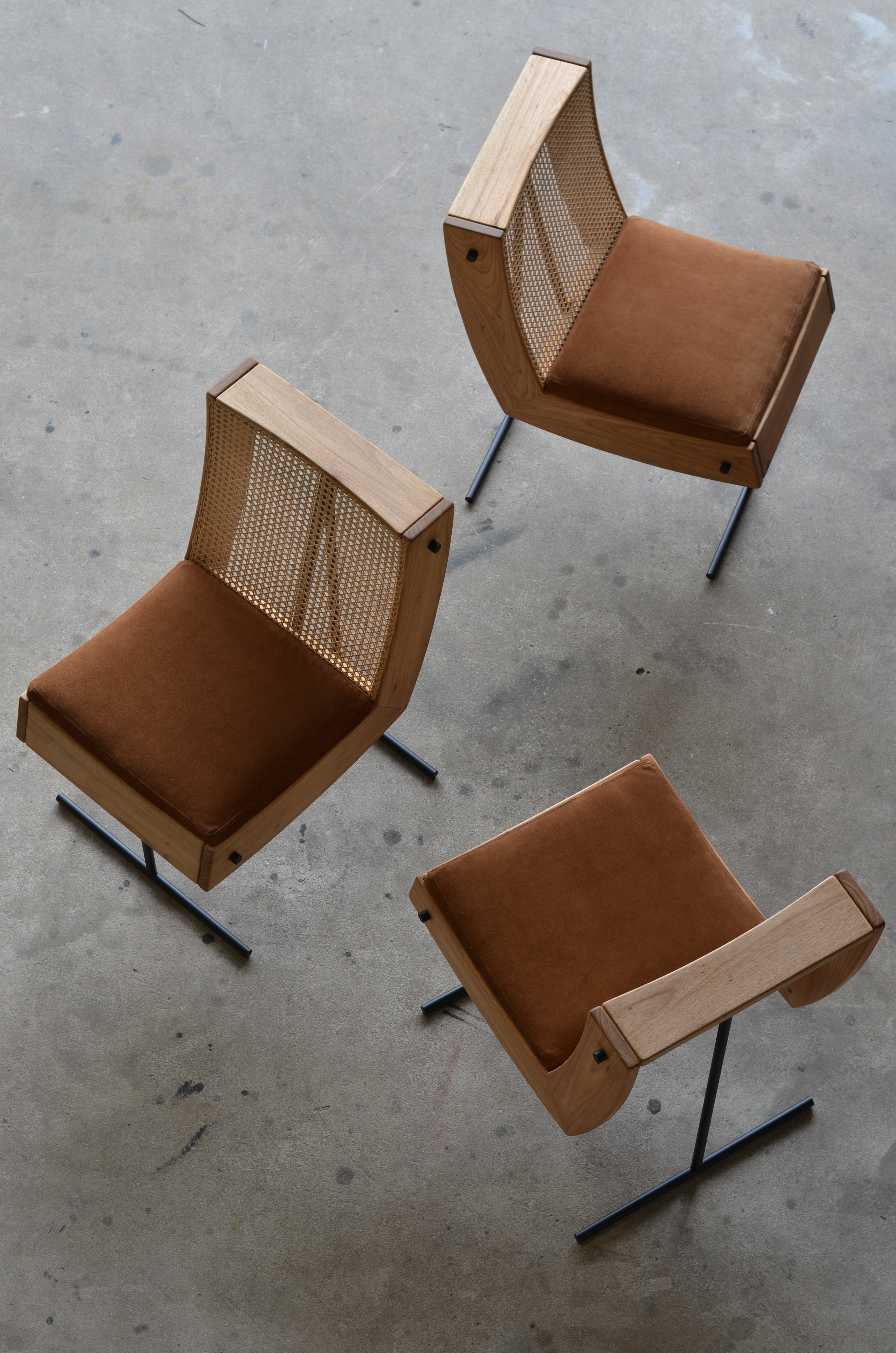 La silla Benja está elaborada con maderas macizas de alta calidad, disponible en opciones como violeta, sucupira, tauarí y carbonizado. El asiento puede estar elaborado con paja negra natural o sintética, o tapizado en lino, lona, cuero o gamuza.