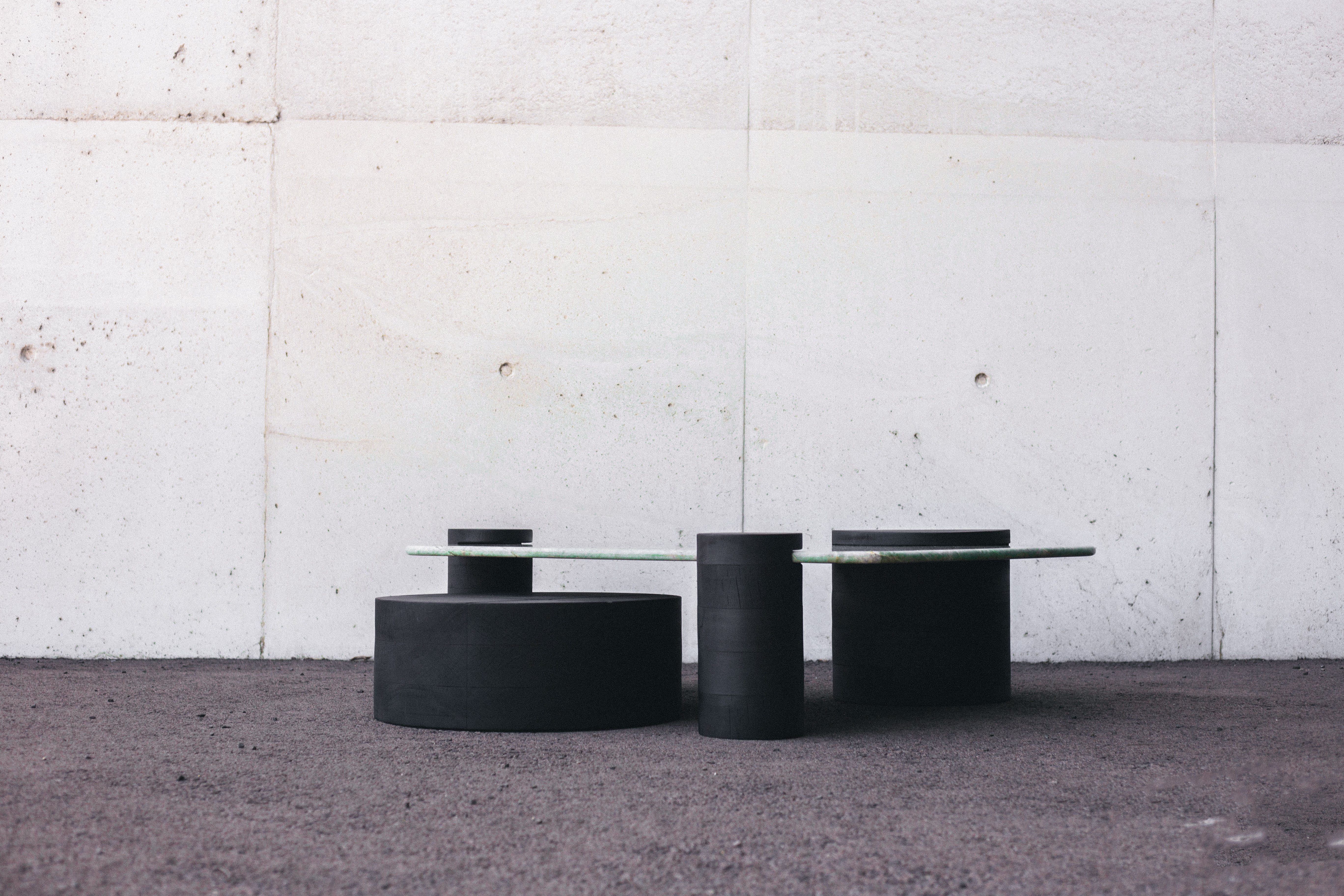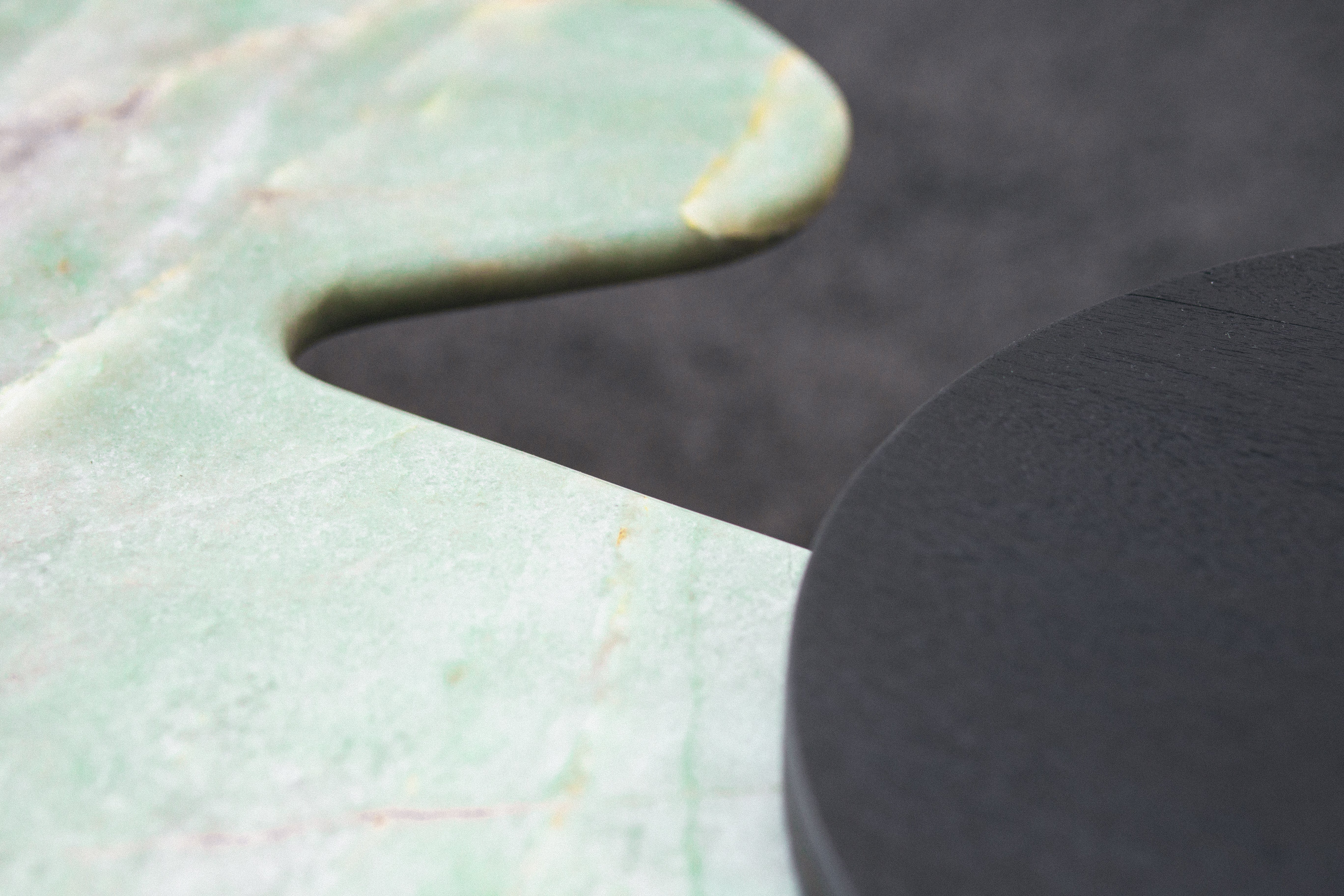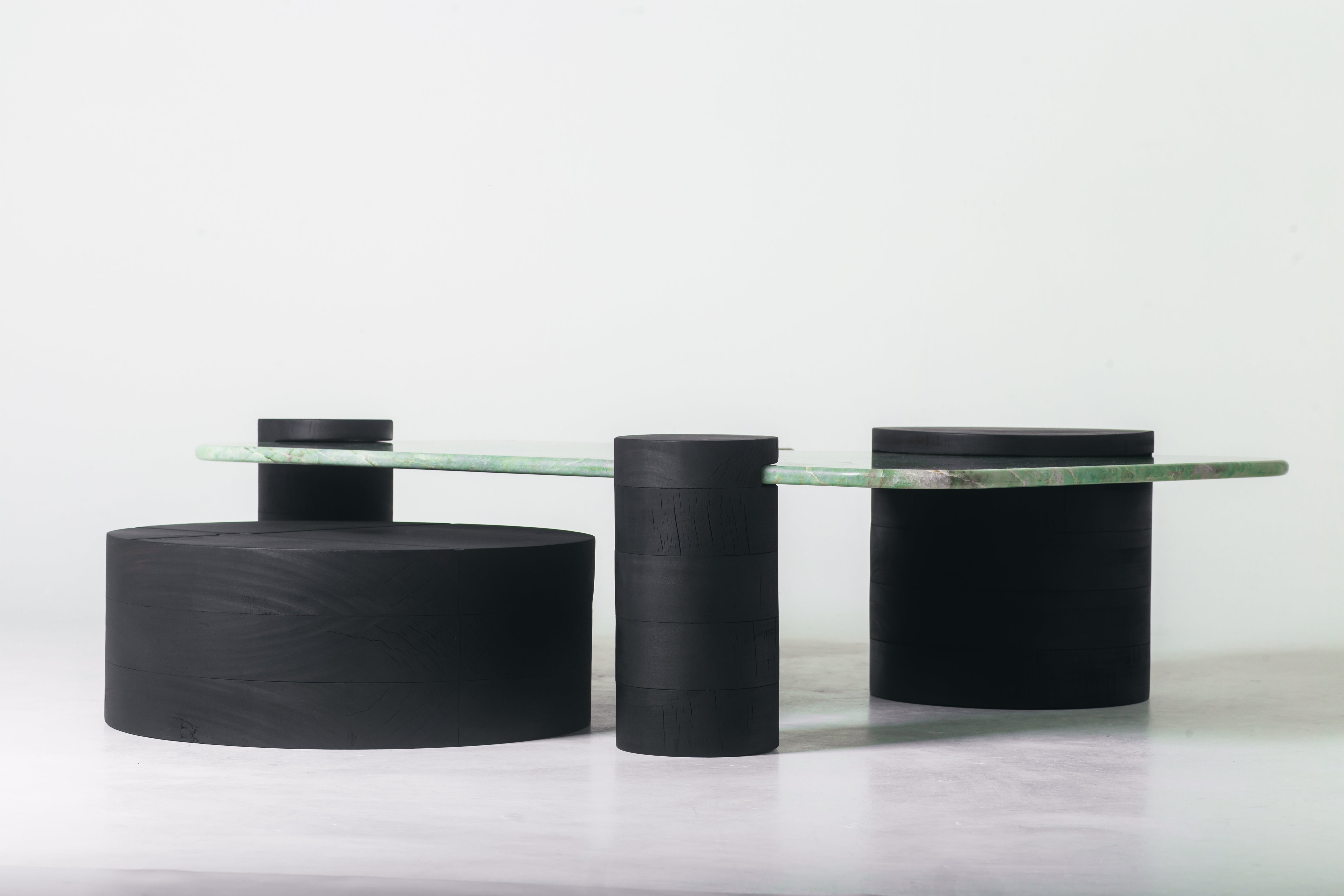 Tablero en piedra natural brasileña (Garapeira) y bases en madera maciza carbonizada.