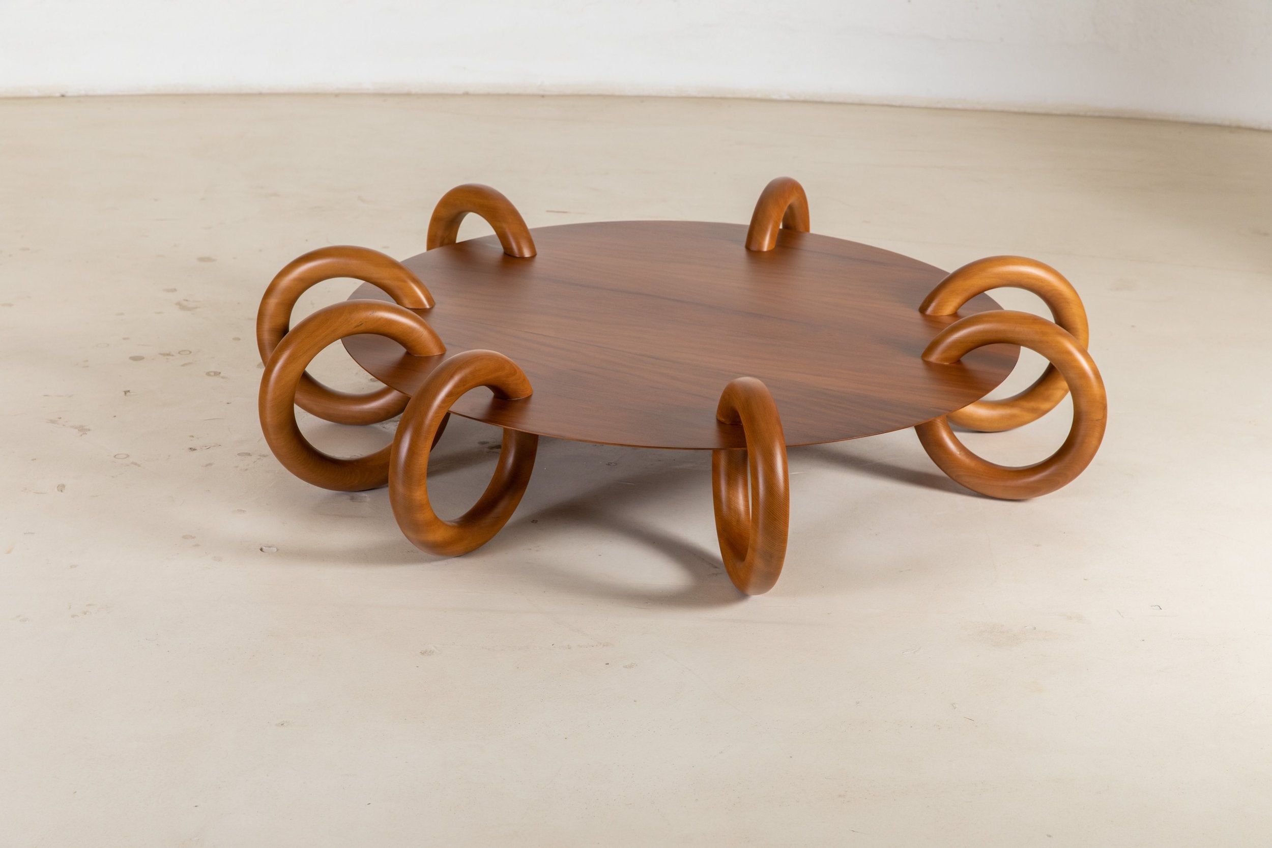 La mesa de centro Carrapato presenta una elegante superficie circular sostenida por varios anillos de madera independientes conectados a la parte superior. Este diseño único e innovador no solo proporciona una base estable, sino que también crea un efecto visual intrigante y dinámico. Los anillos de madera añaden textura y un toque artístico, convirtiendo la mesa en un punto focal sofisticado.
