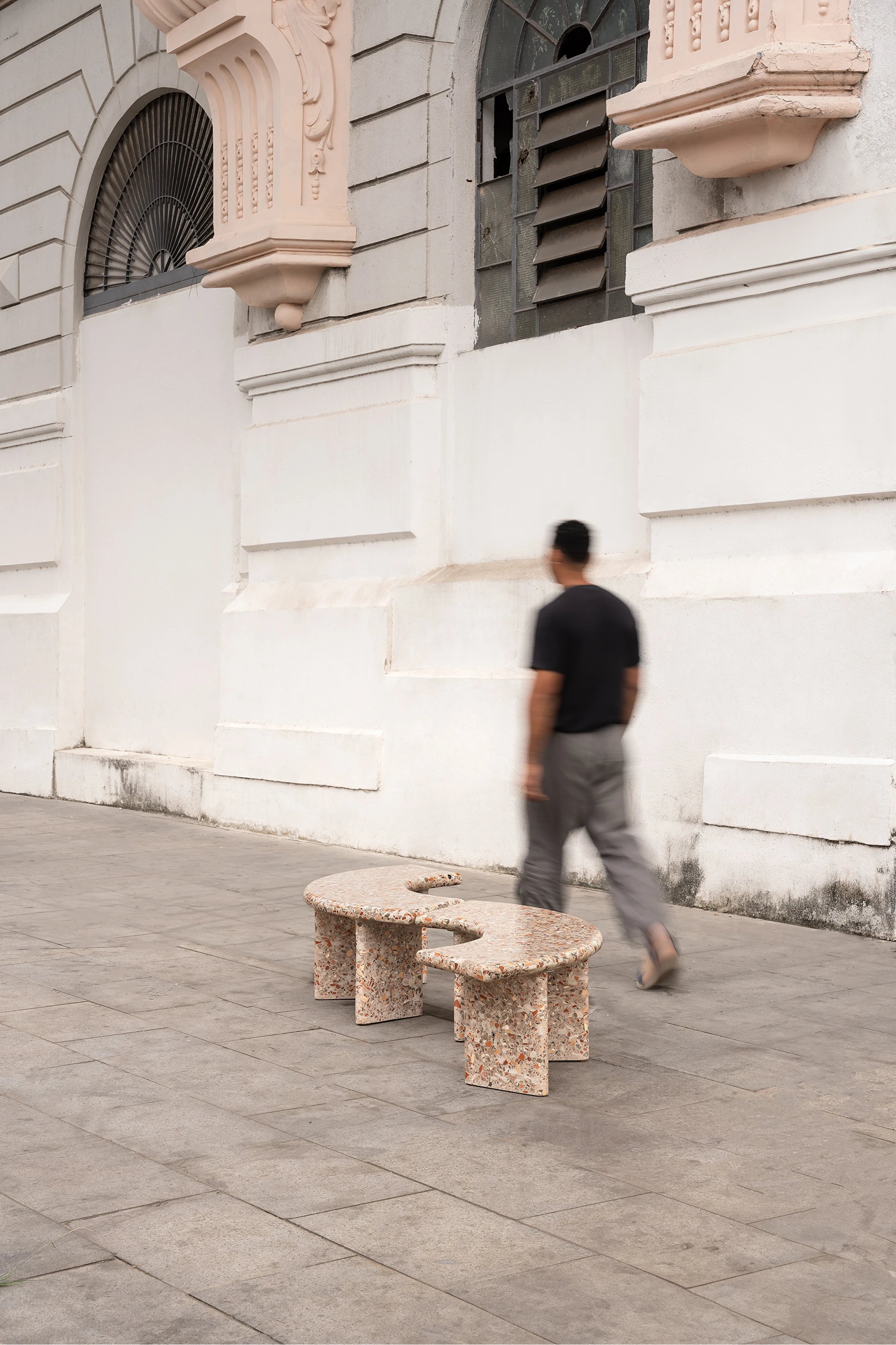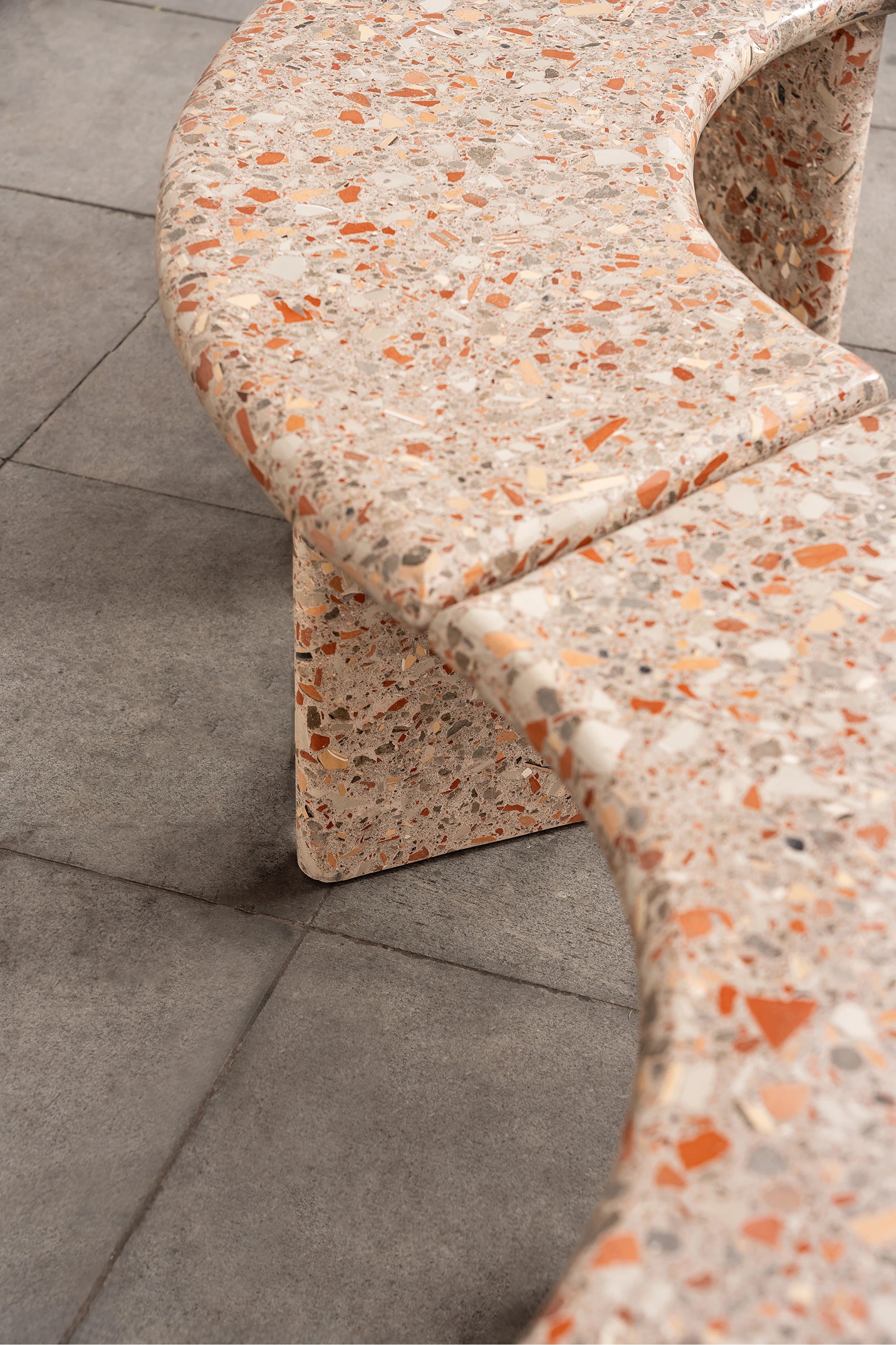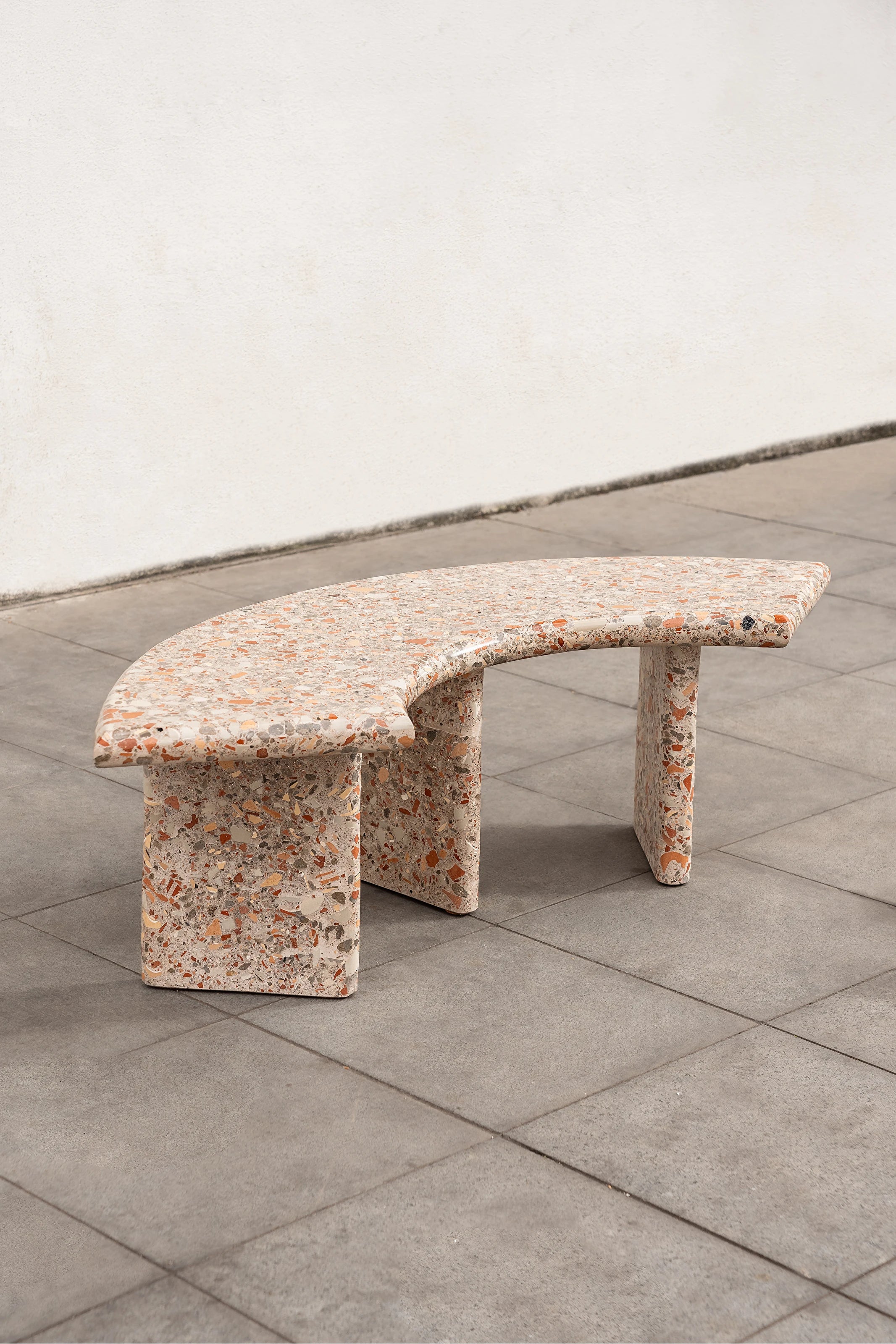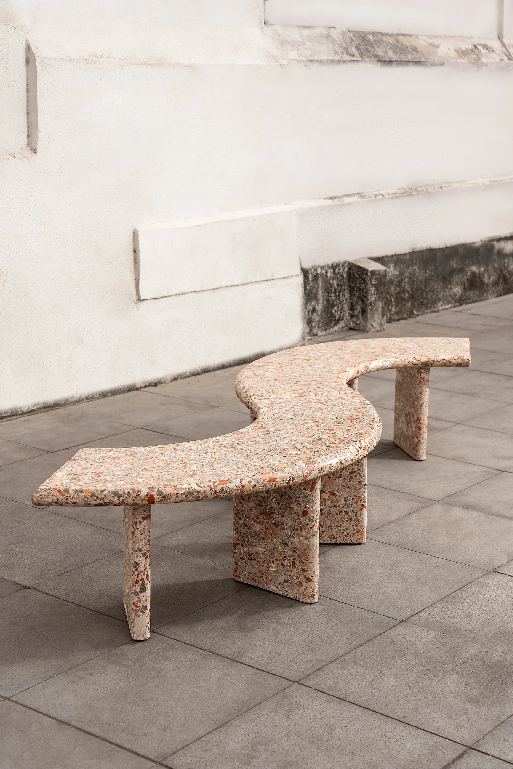 The Brut collection transforms demolition waste — such as ceramic, tiles, and mortar — into recycled concrete furniture. Its centerpiece is the curved modular bench, which can be combined to form continuous shapes or a perfect circle with three modules. Designed for both indoor and outdoor spaces, the bench authentically showcases the reclaimed materials in a brutalist aesthetic of simple, honest forms.