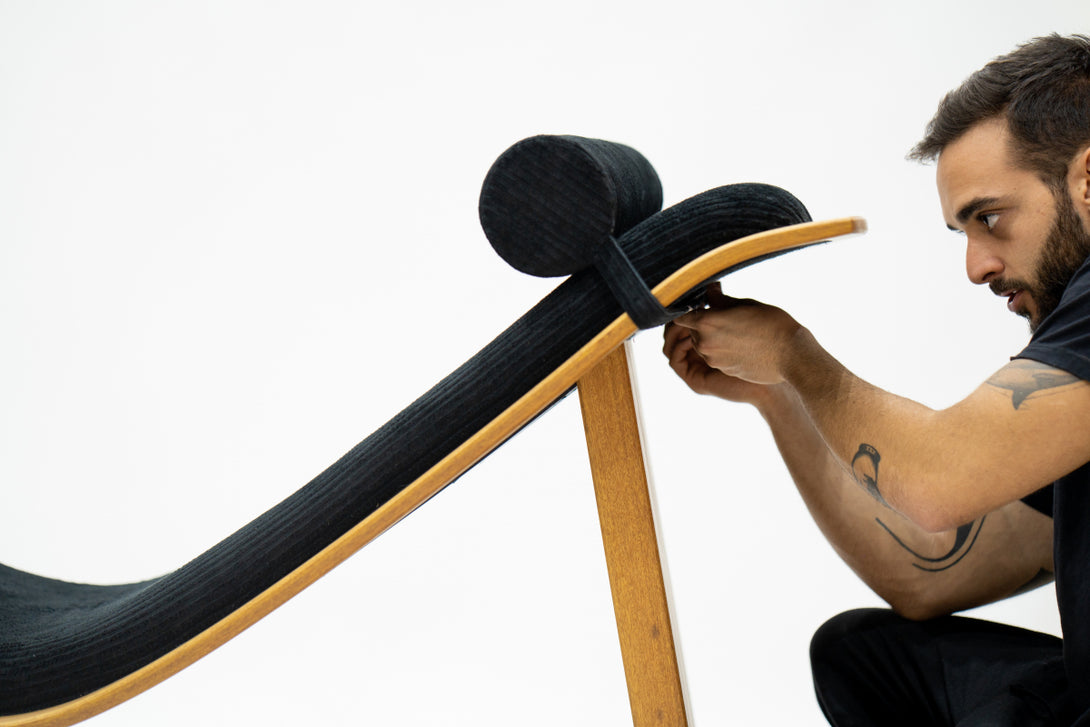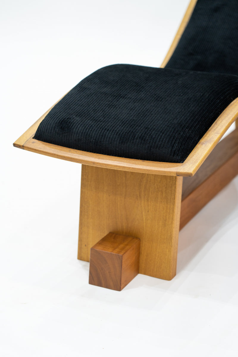 Madera de Itaúba, acabado al aceite natural y tejido cotelê de terciopelo de algodón.