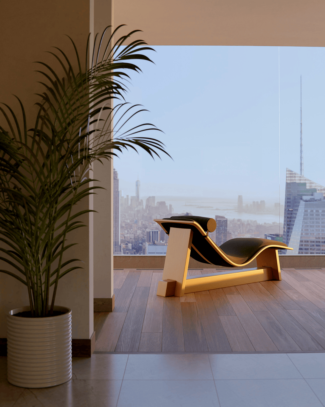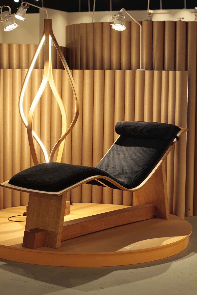 La Chaise Neguev explora el uso de curvas a través de la técnica de laminación de madera, permitiendo grandes curvas con un espesor de madera mínimo, dando como resultado un diseño ligero y orgánico en el asiento, en contraste con su base robusta.