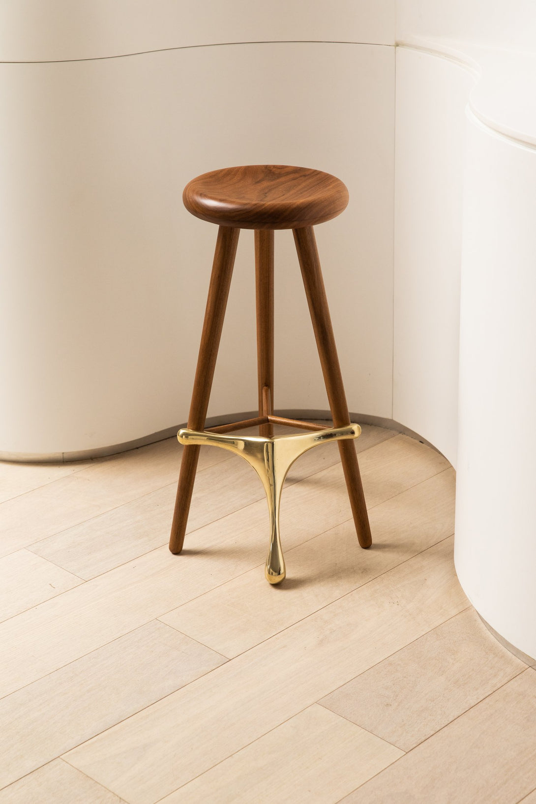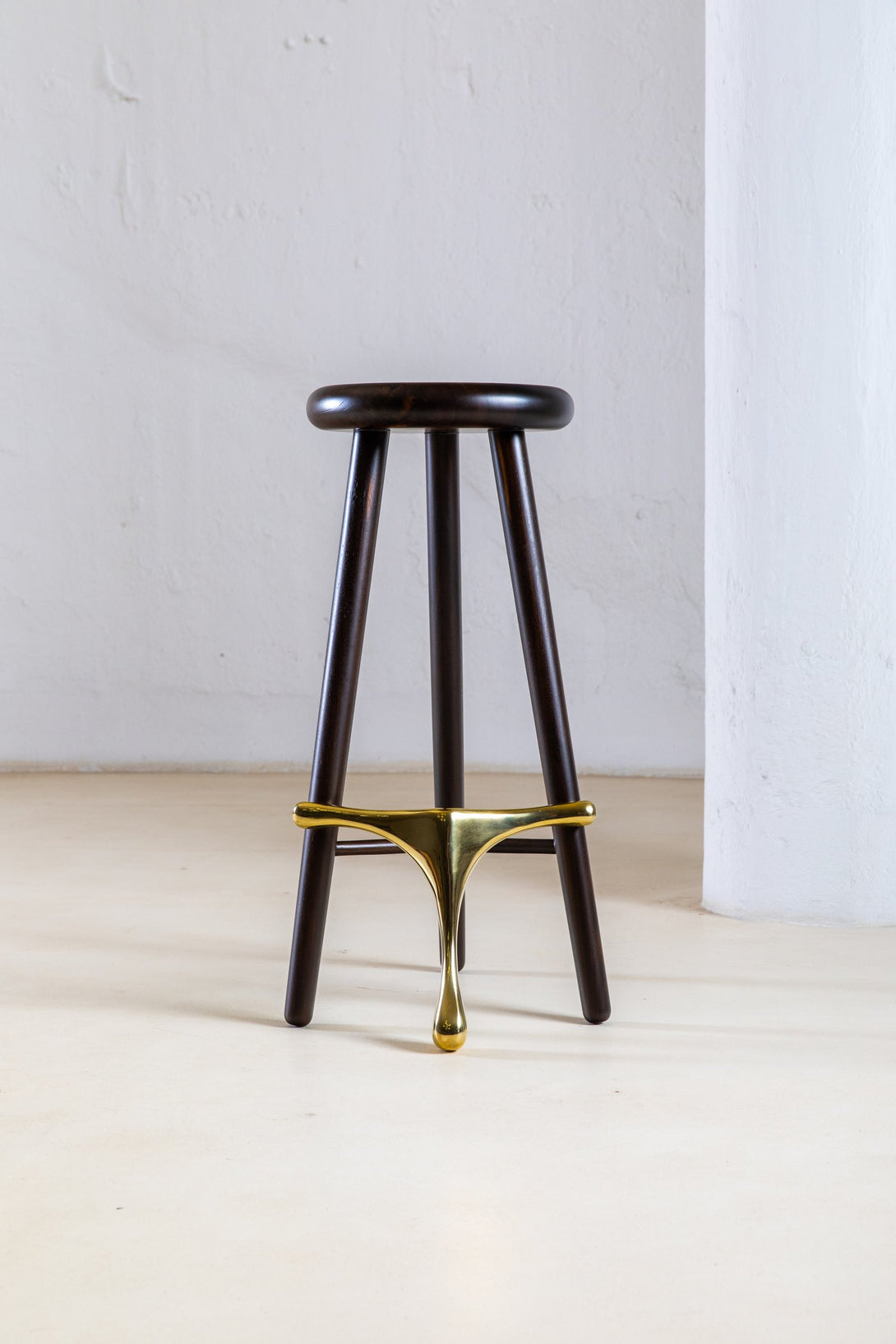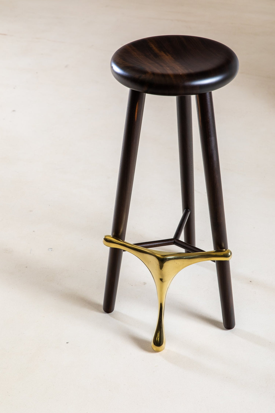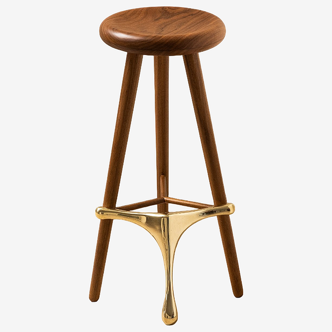 Este taburete elegante y moderno presenta un diseño minimalista con un asiento de madera pulida y tres patas de madera cónicas. Un componente de latón conecta las patas y sirve como reposapiés y estructura de soporte, lo que le aporta sofisticación. El asiento redondo y plano es cómodo y el reposapiés de latón realza el atractivo estético. Combinando un diseño contemporáneo con materiales clásicos, es versátil para distintos estilos de interior.