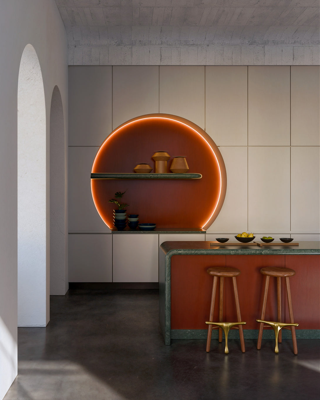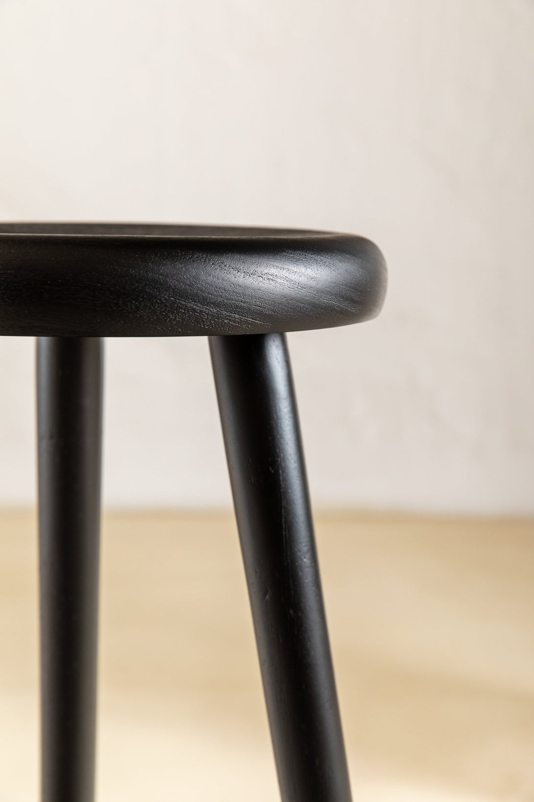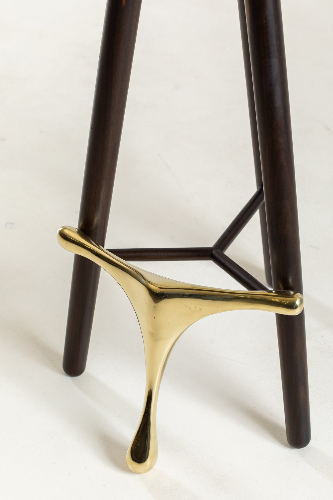 Este taburete elegante y moderno presenta un diseño minimalista con un asiento de madera pulida y tres patas de madera cónicas. Un componente de latón conecta las patas y sirve como reposapiés y estructura de soporte, lo que le aporta sofisticación. El asiento redondo y plano es cómodo y el reposapiés de latón realza el atractivo estético. Combinando un diseño contemporáneo con materiales clásicos, es versátil para distintos estilos de interior.