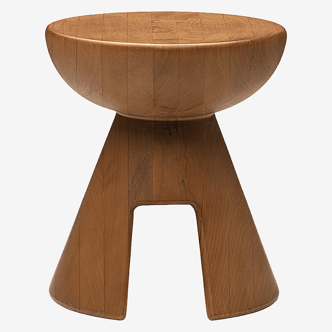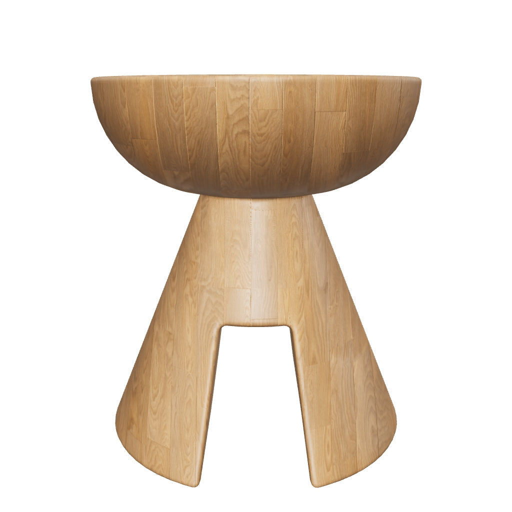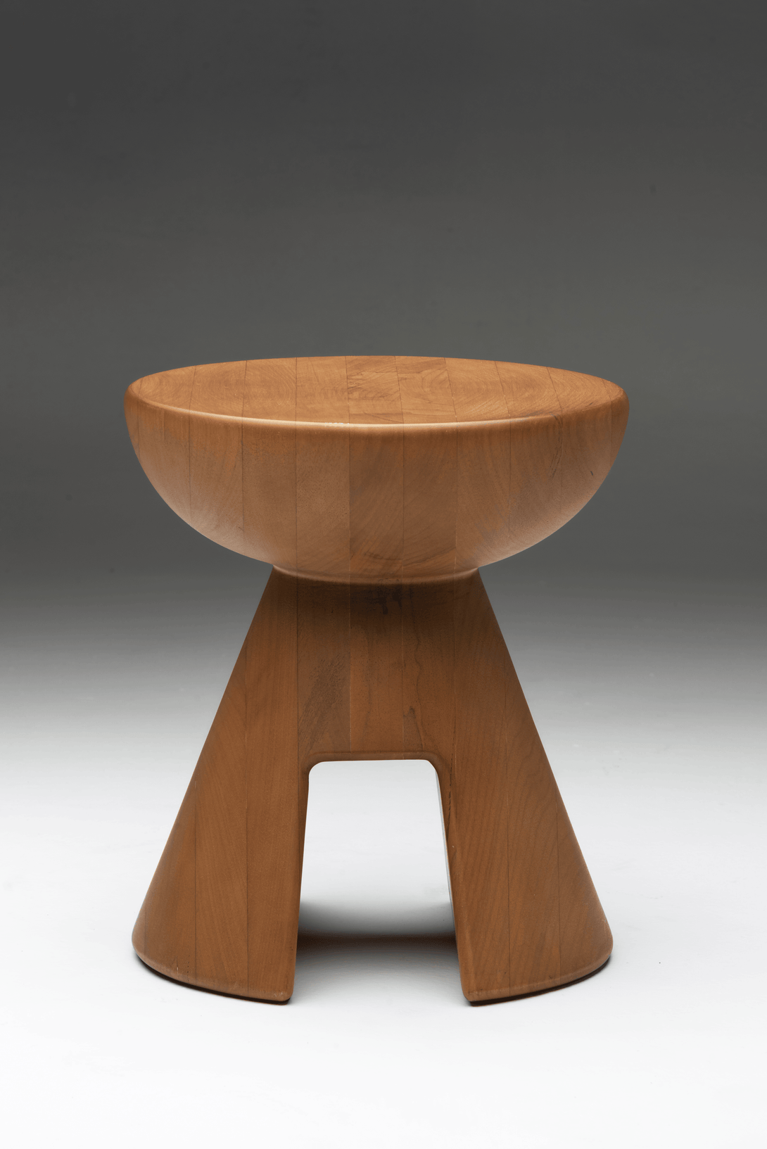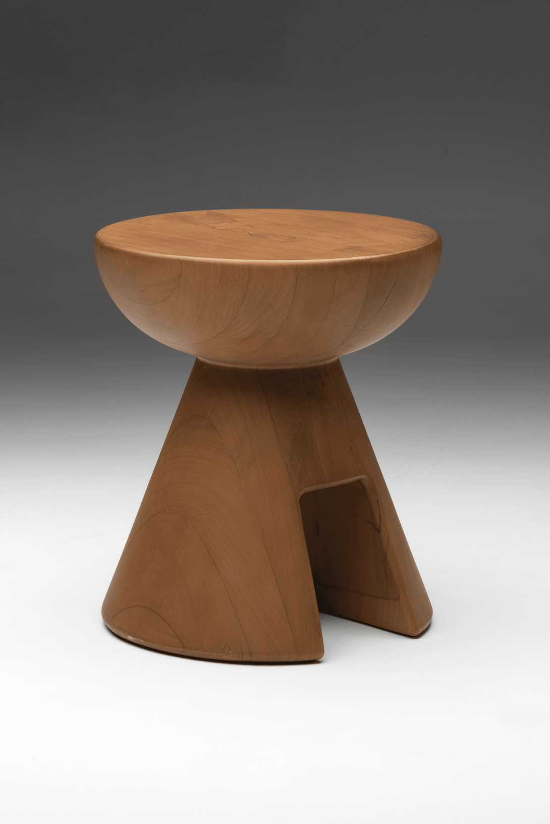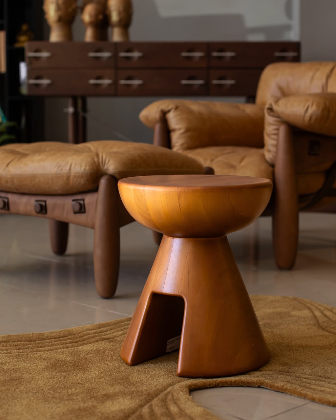 Taburete fabricado en madera de Mel con tratamiento de alta tecnología. Presenta un diseño versátil en forma de reloj de arena, apto para usarse como taburete, mesa auxiliar, en combinación como mesa de centro, entre otras posibilidades.