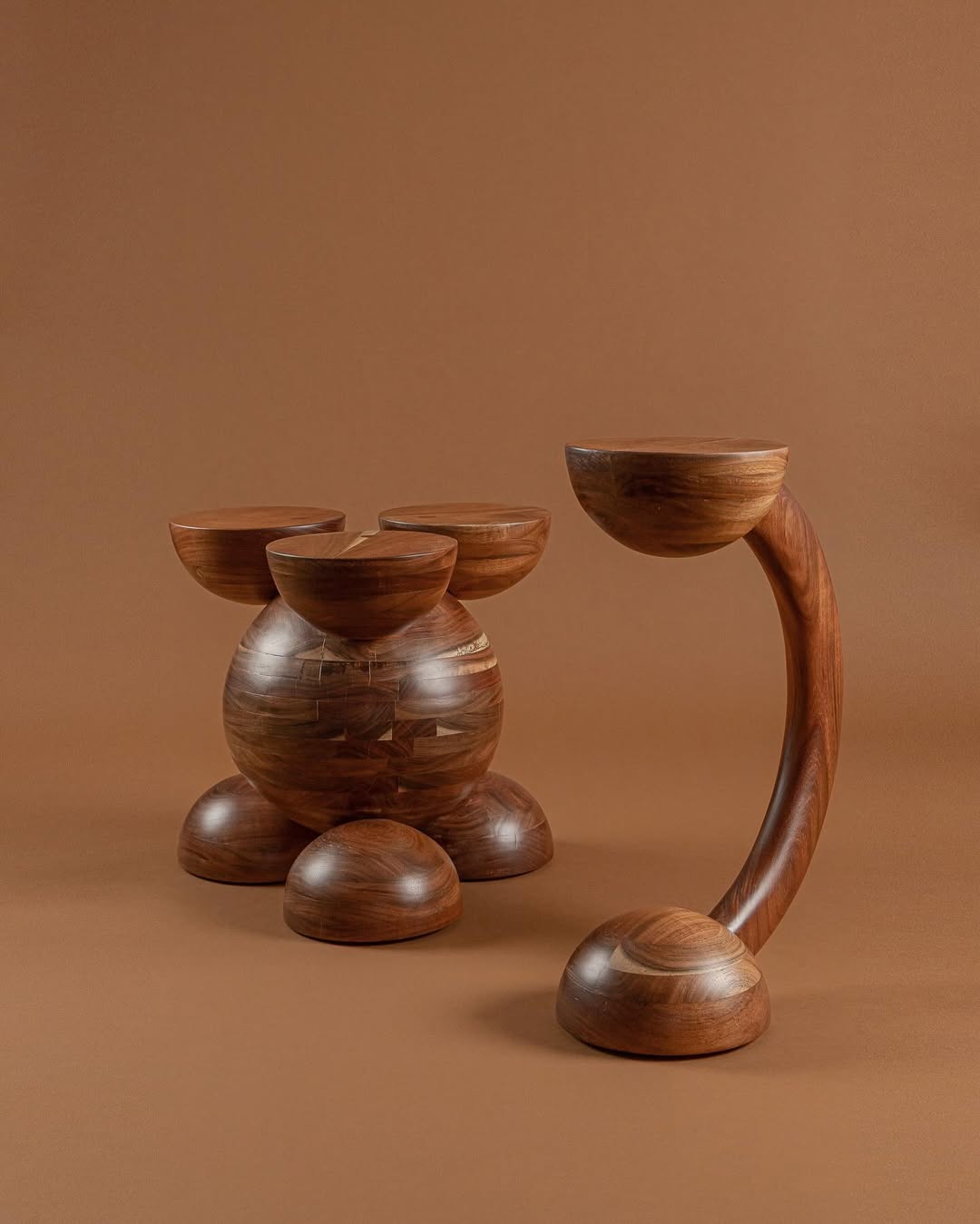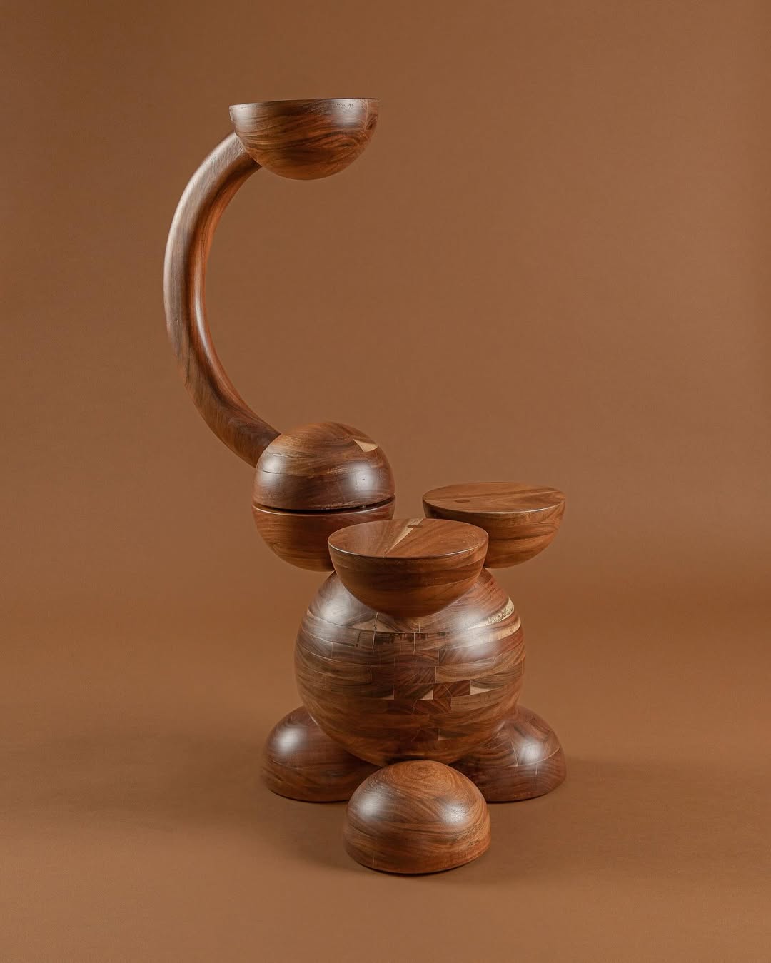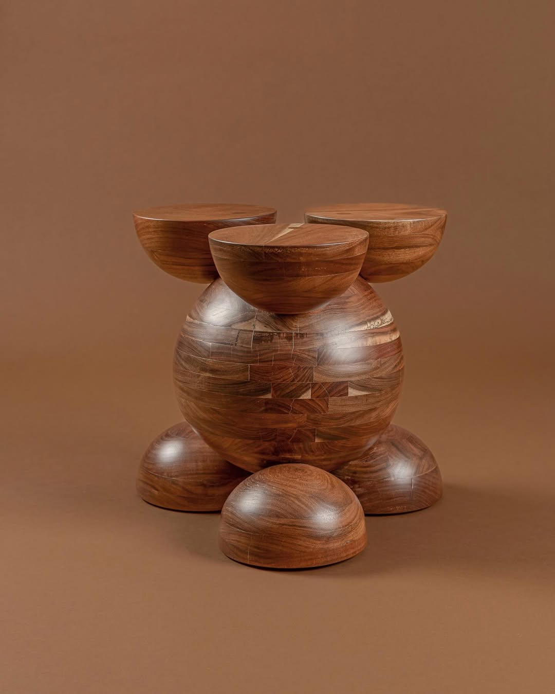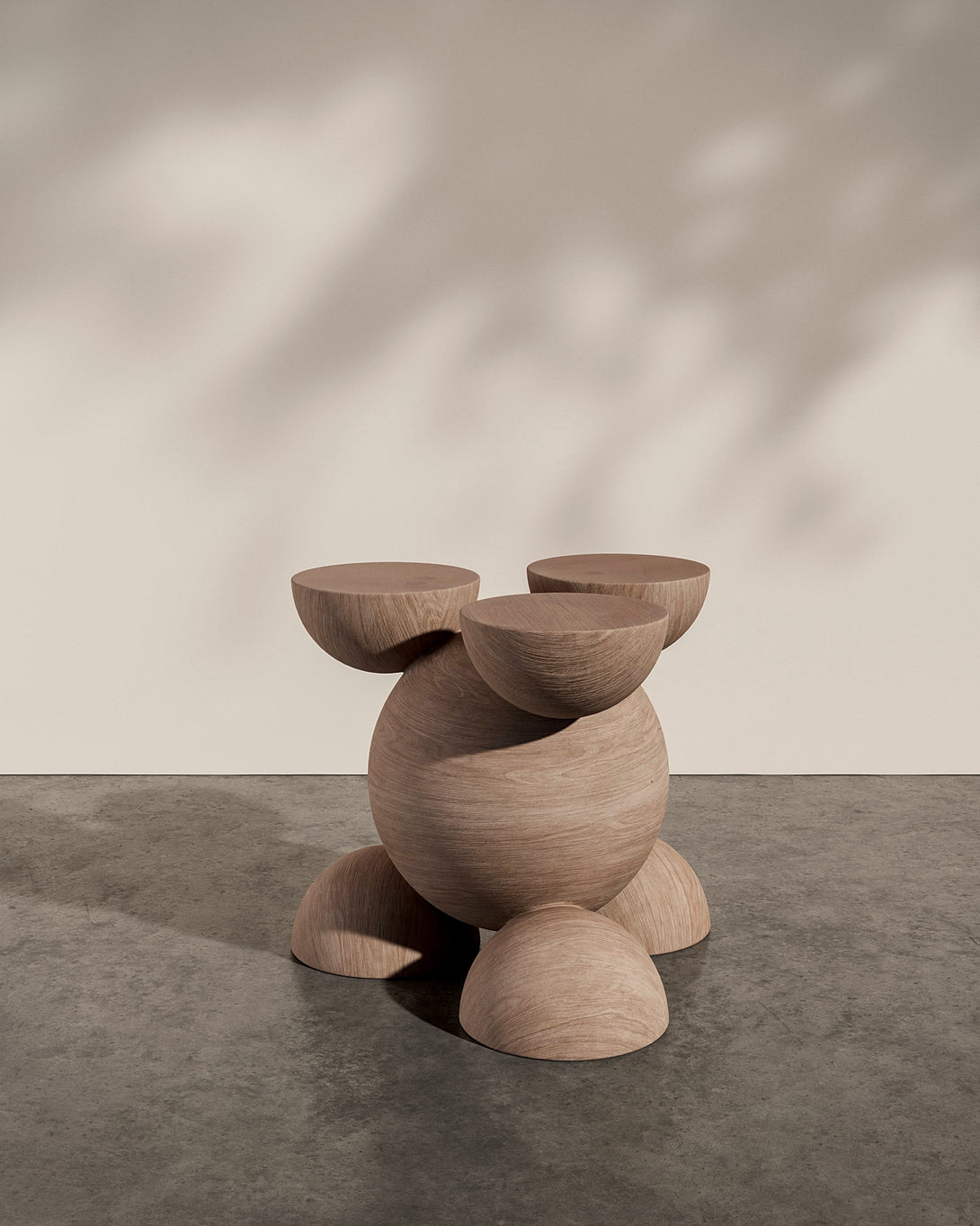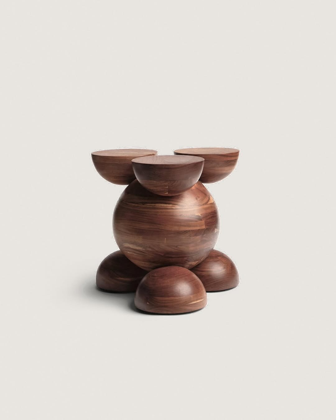 The Bleo Stool III is a sculptural and modular design piece distinguished by its composition, which is entirely formed by stacked spheres and hemispheres. The stool features a light, natural wood finish with a slightly grayish or whitewashed tone, highlighting the wood grain and lending it an organic, sophisticated aesthetic. The structure is built around a large central sphere acting as the main body. This sphere is supported at the base by multiple inverted hemispheres, which provide stability and create the illusion of the piece resting on stones. At the top, the seating surface is formed by a combination of upward-facing hemispheres, creating an unusual, multi-level design that is both functional for seating and visually captivating. Its playful and rounded form makes it a striking accent stool.
