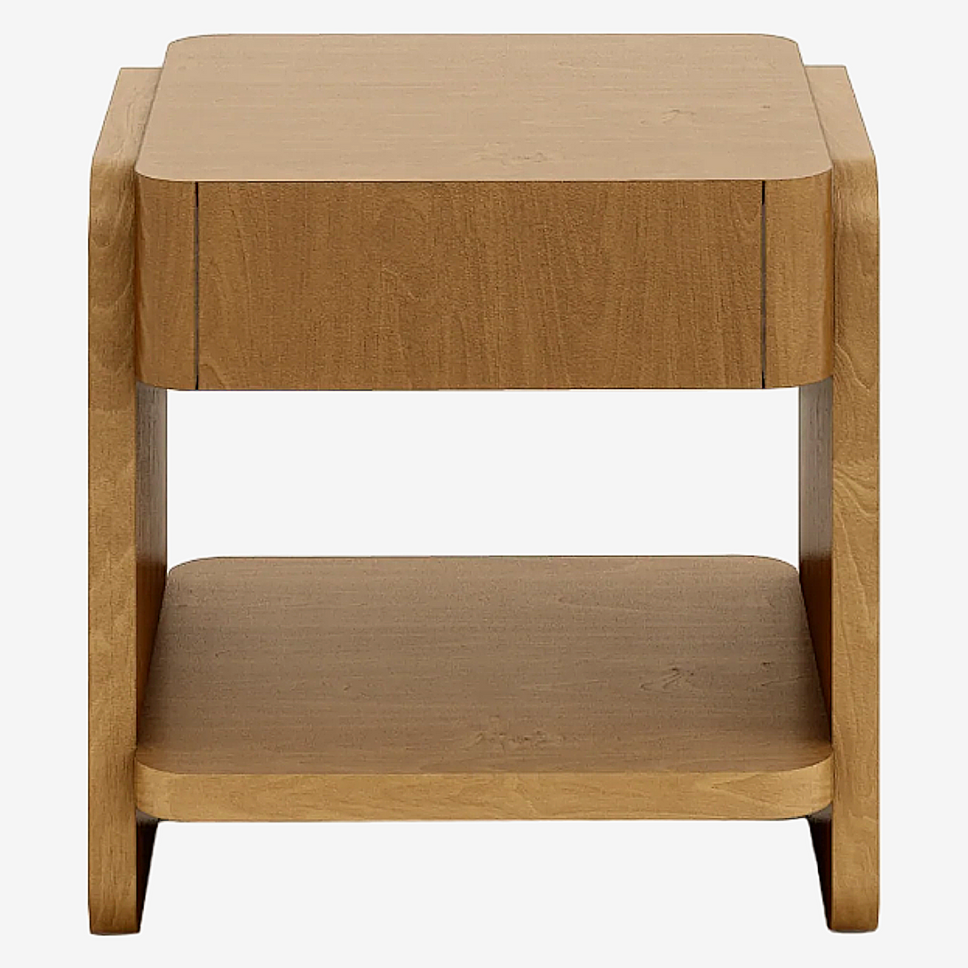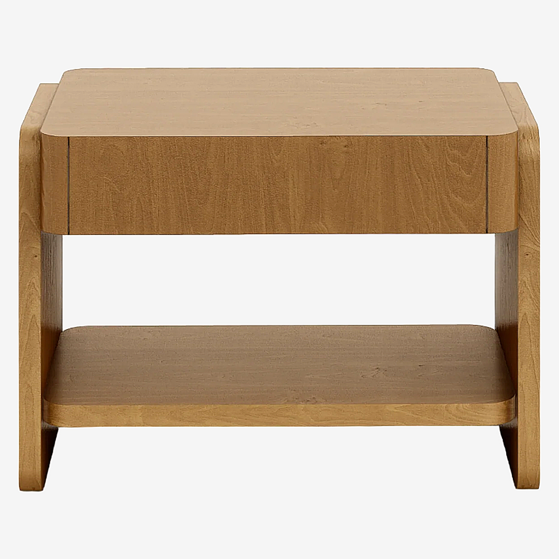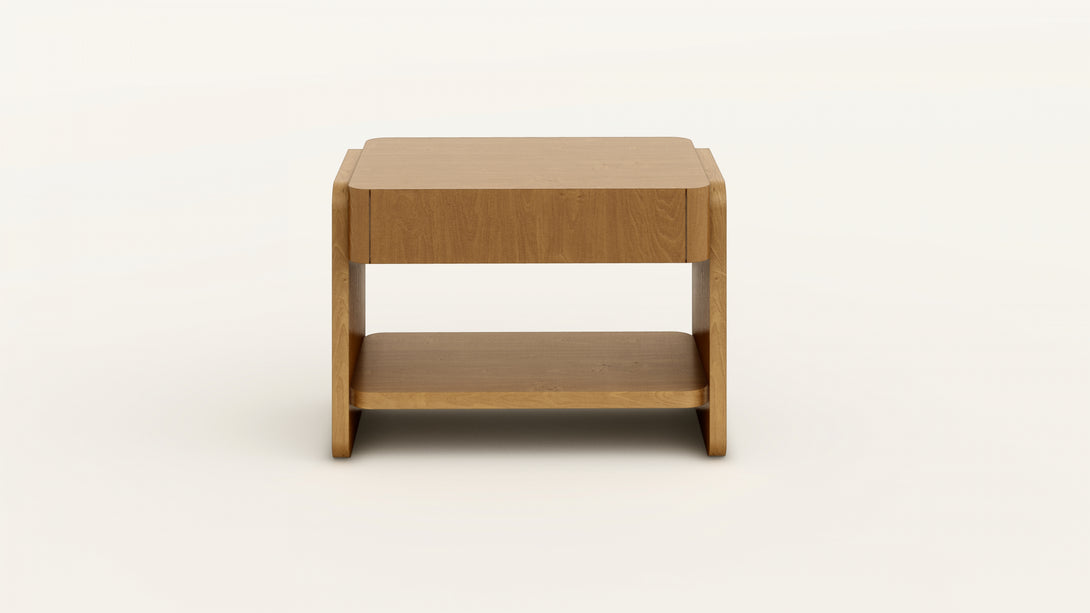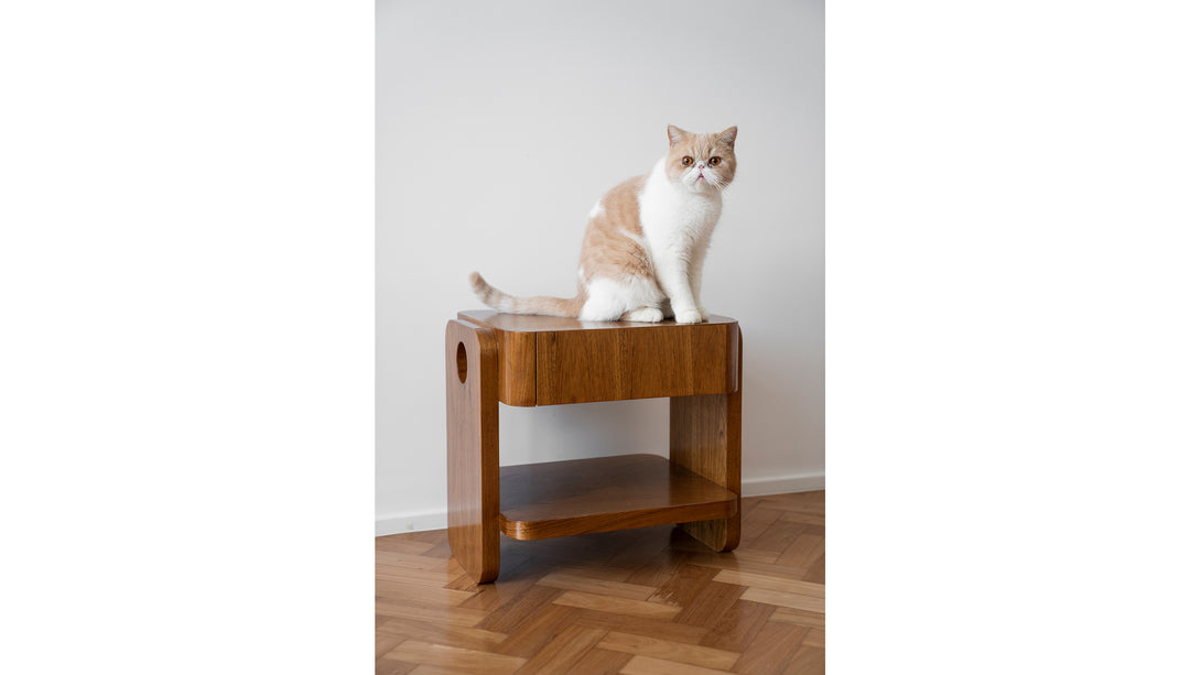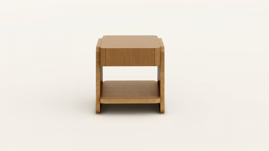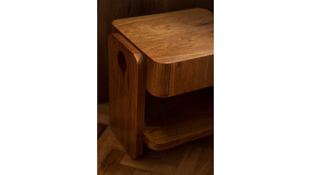 De líneas limpias, curvas sutiles y un enfoque en los detalles funcionales, esta pieza destaca por la belleza del minimalismo, carente de ornamentación excesiva. Cuenta con una estructura de madera maciza, un cuerpo y estante de MDF revestido en chapa de madera, un cajón con correderas ocultas de cierre suave de Blum y un tirador de latón pulido.