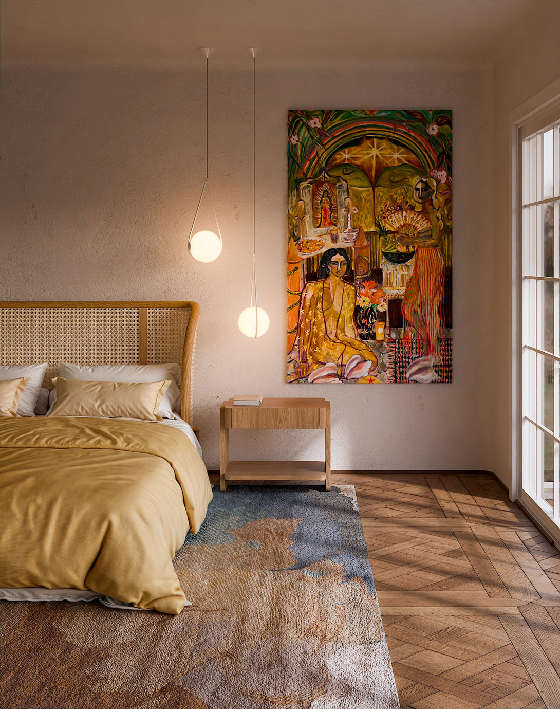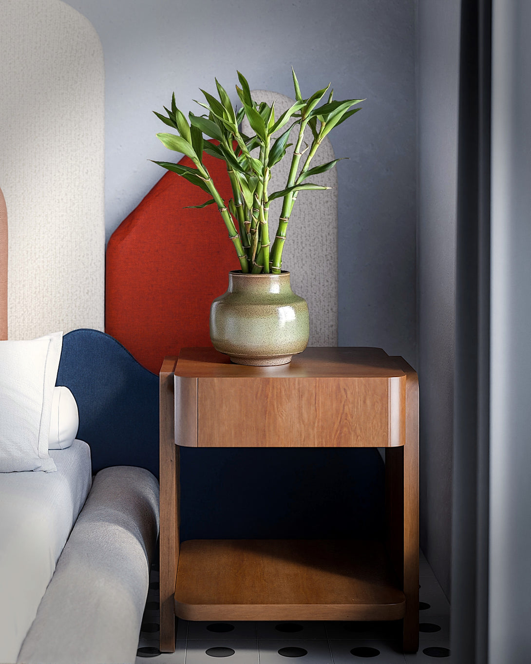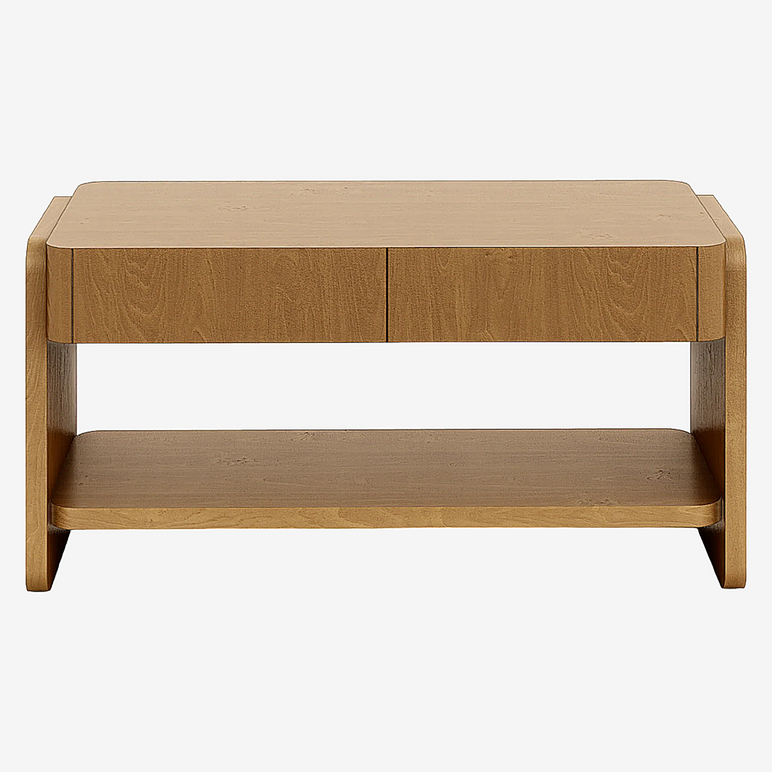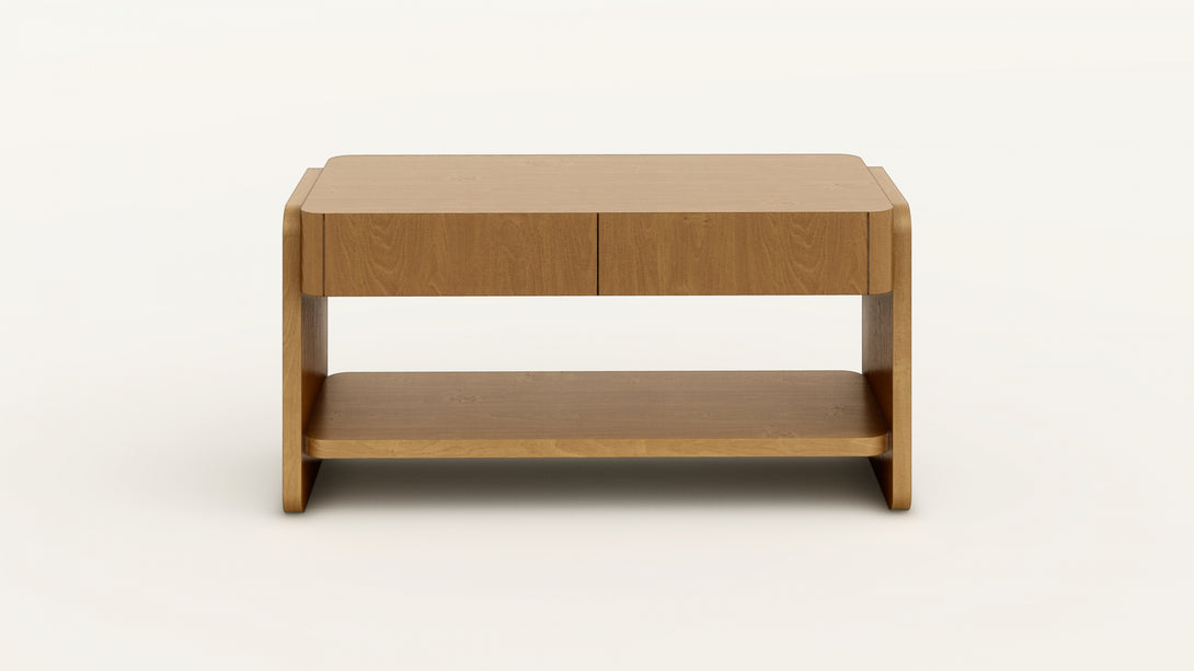 De líneas limpias, curvas sutiles y un enfoque en los detalles funcionales, esta pieza destaca por la belleza del minimalismo, carente de ornamentación excesiva. Cuenta con una estructura de madera maciza, un cuerpo y estante de MDF revestido en chapa de madera, un cajón con correderas ocultas de cierre suave de Blum y un tirador de latón pulido.